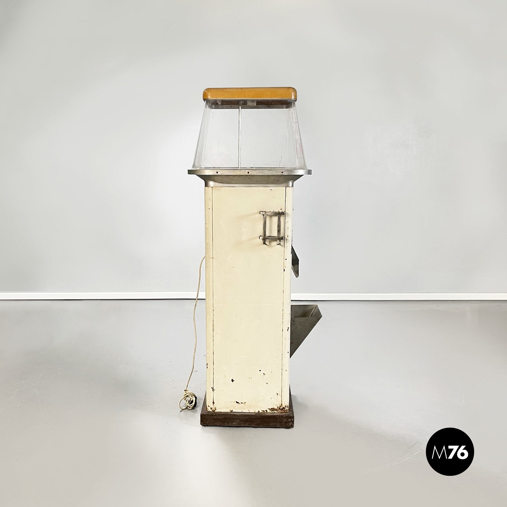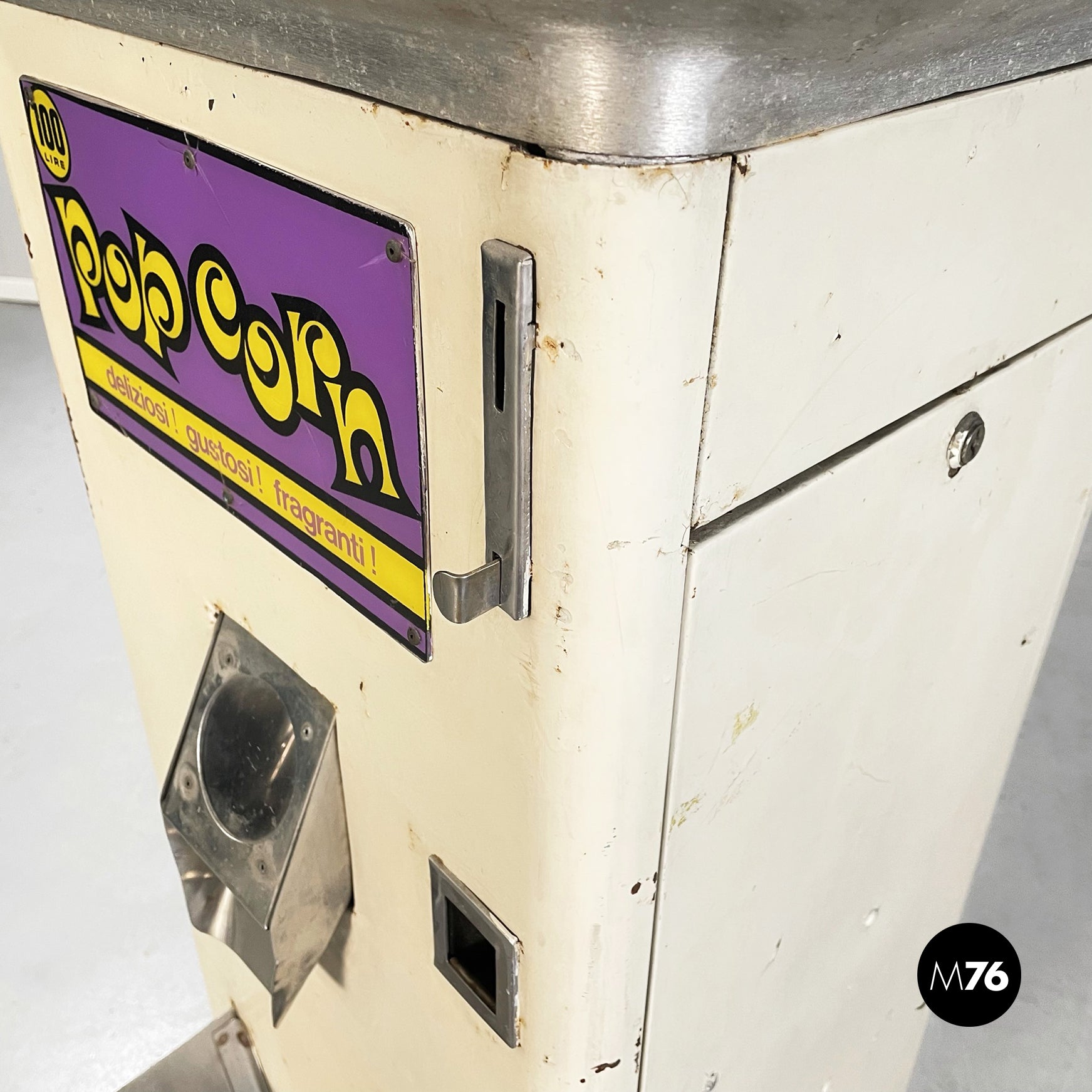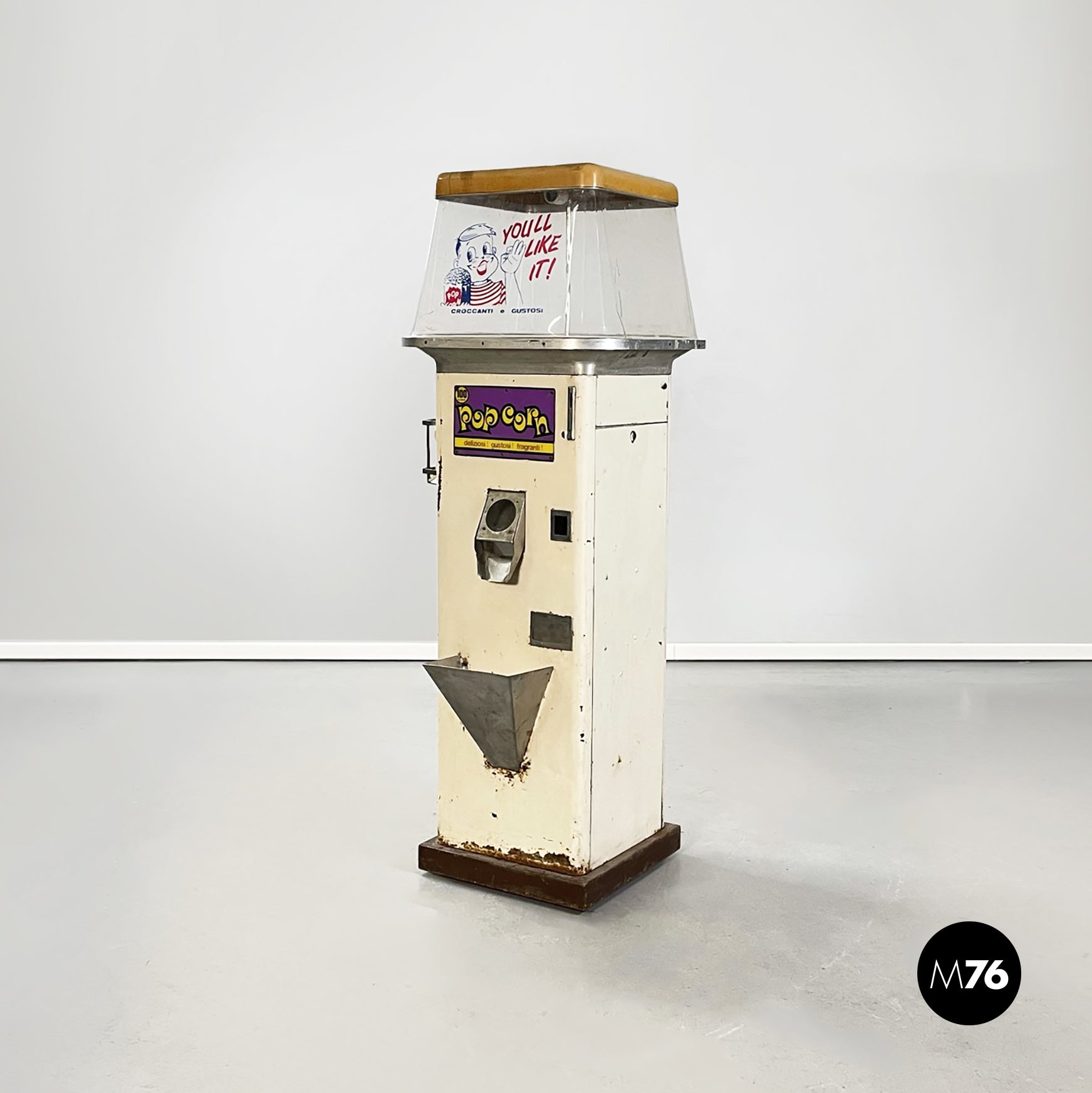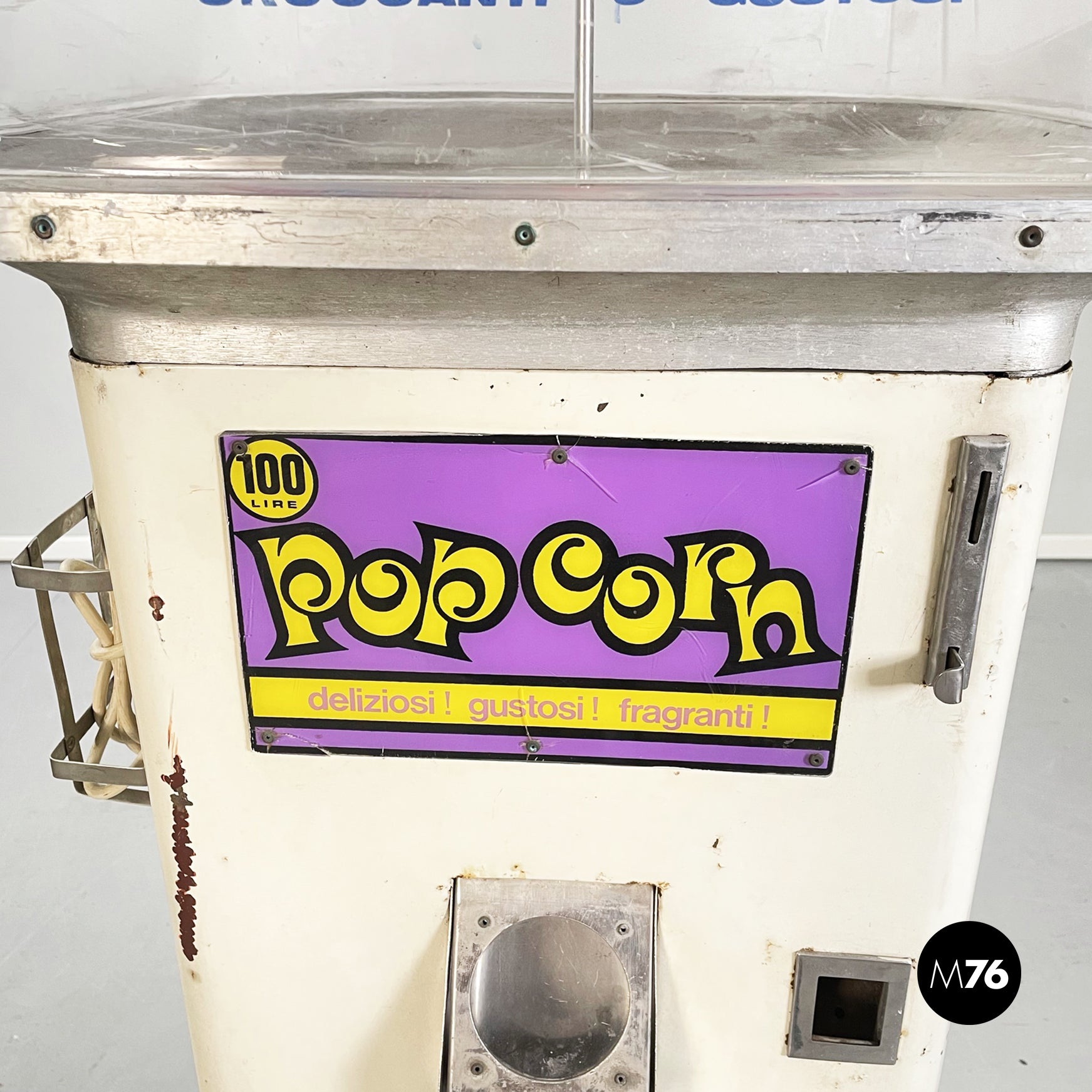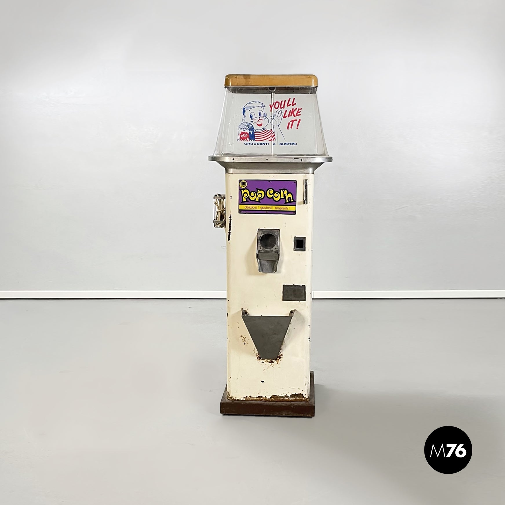 Macchina da terra elettrica di popcorn con base quadrata in metallo verniciato bianco panna e struttura superiore per fare i popcorn in plastica trasparente dipinta e metallo. Sulla struttura centrale è presente il logo in viola il porta sacchetti l?entrata per le monete e il distributore. La parte superiore invece presenta un bambino dipinto in rosso e blu come immagine promozionale. La macchinetta è disposta di ruote per facilitare gli spostamenti.