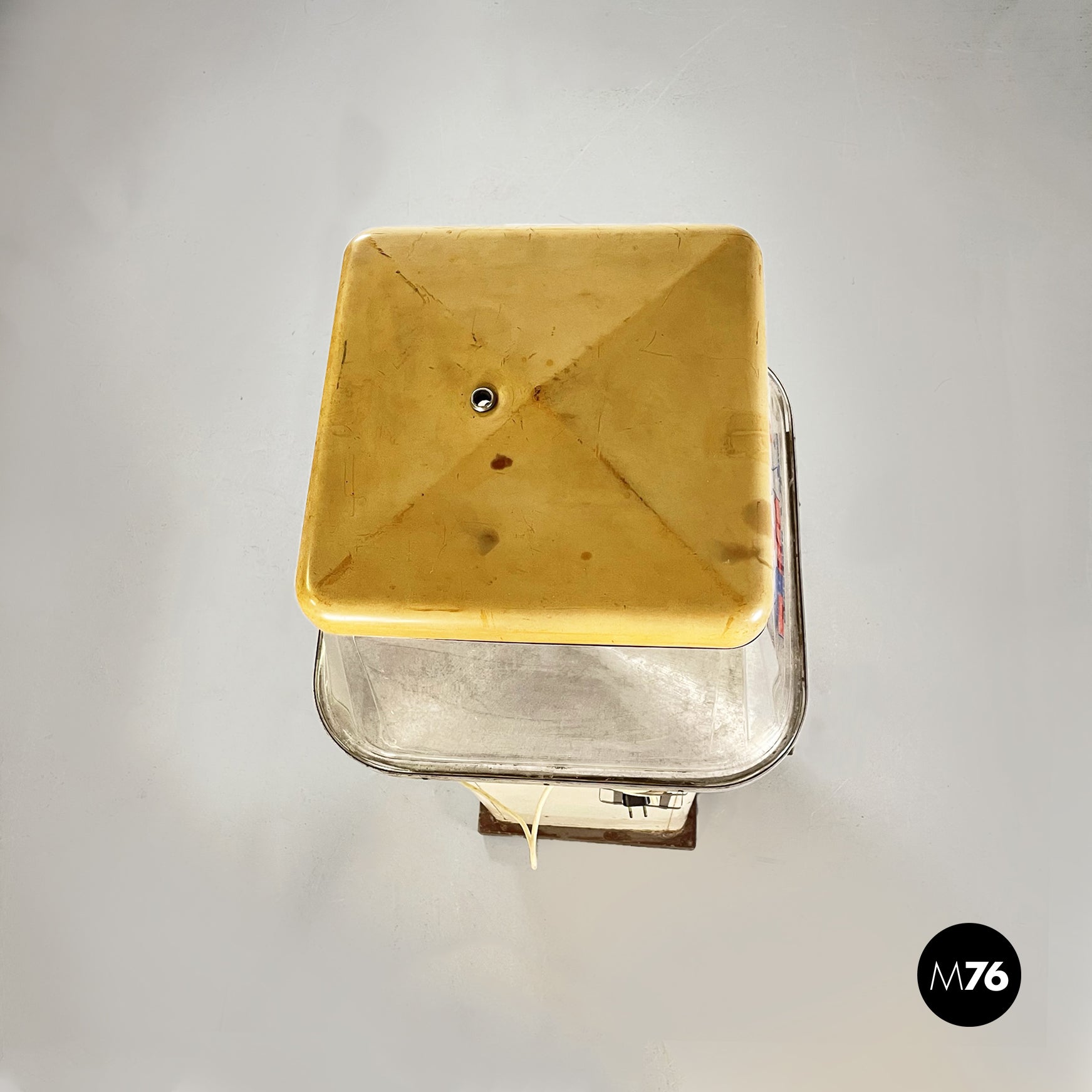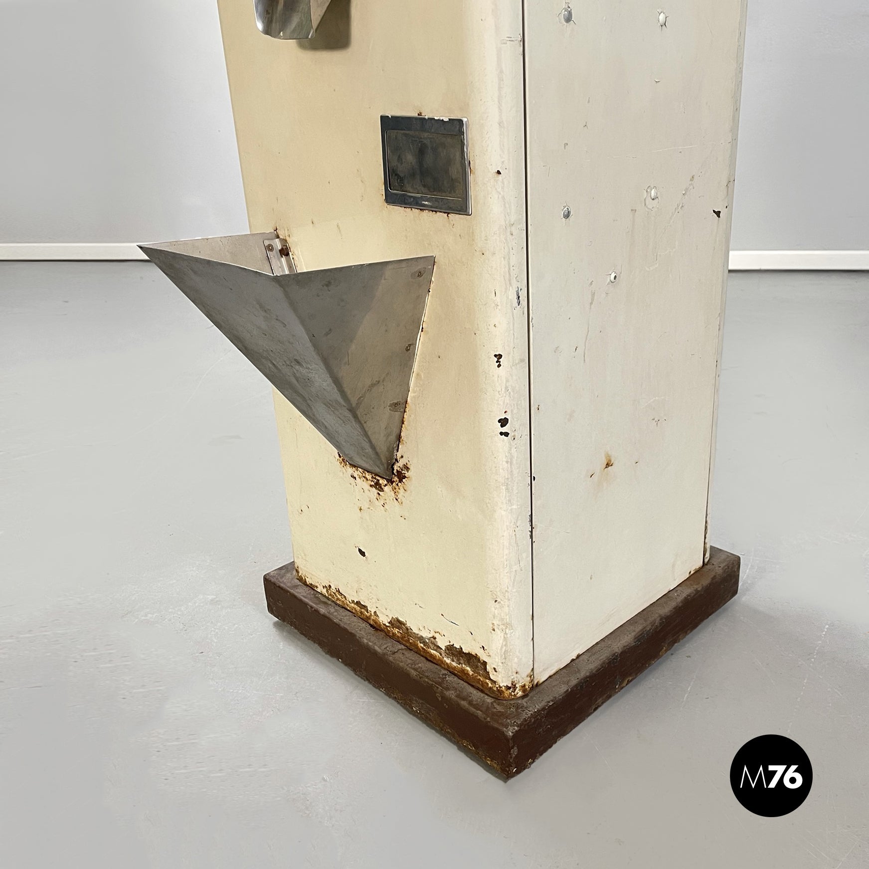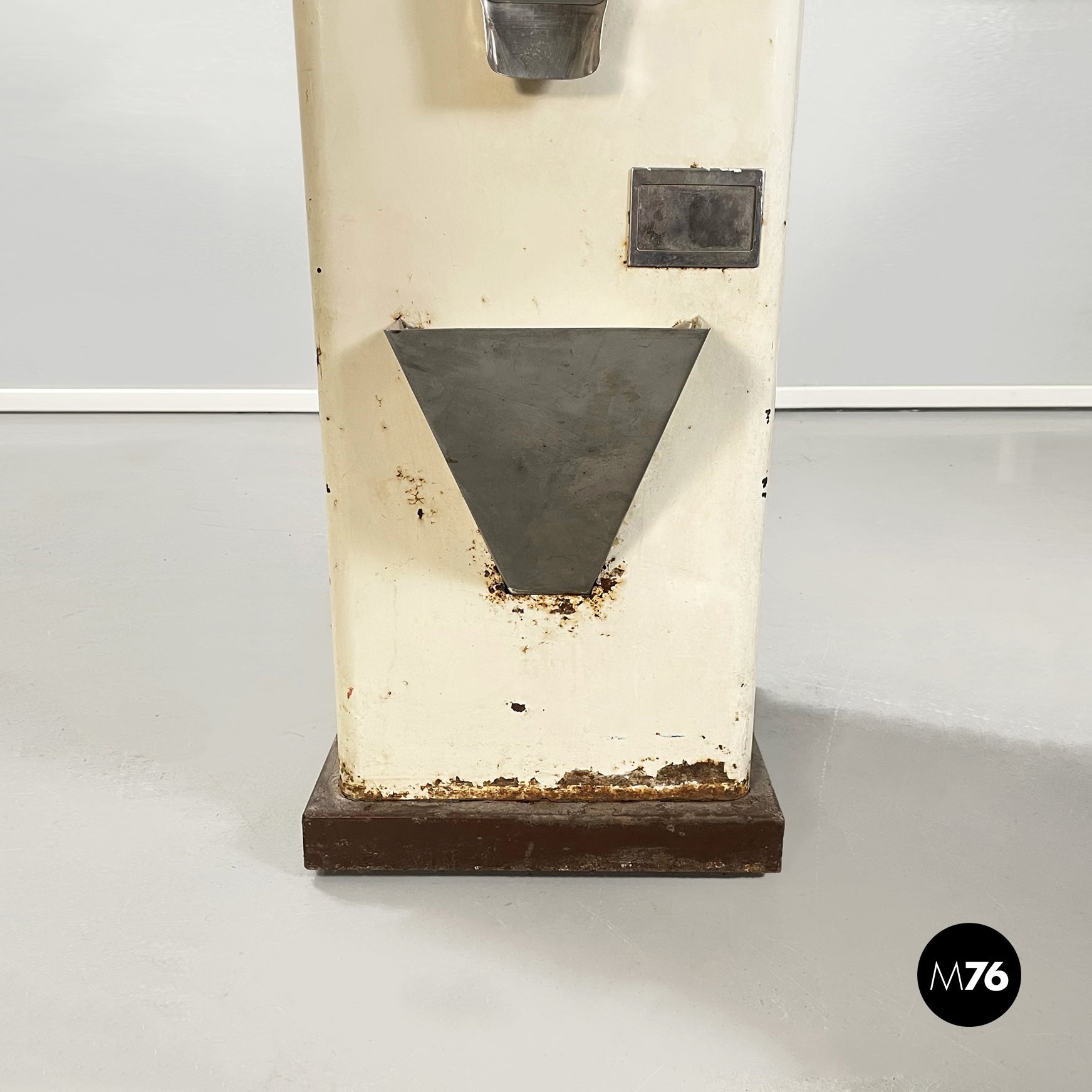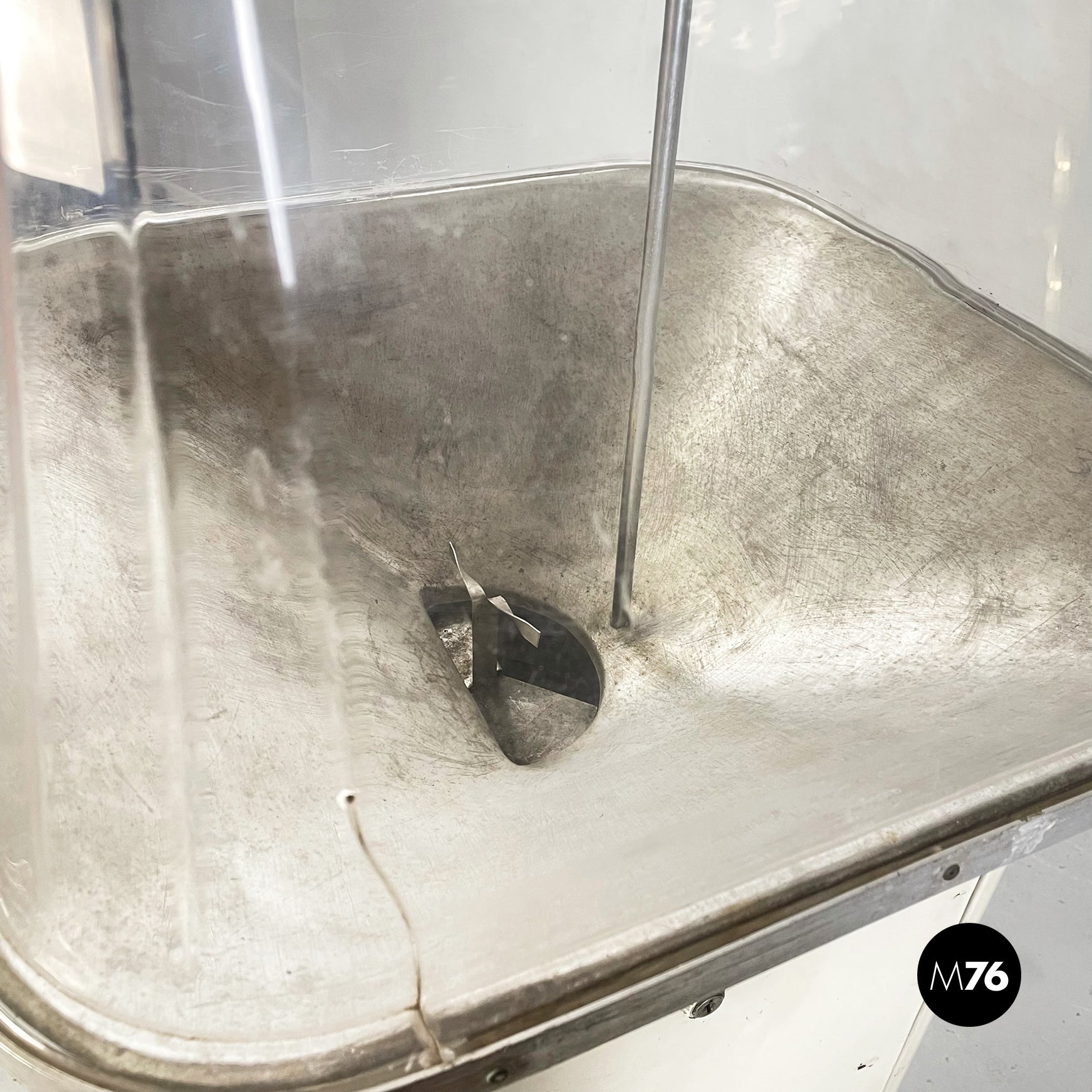 Macchina da terra elettrica di popcorn con base quadrata in metallo verniciato bianco panna e struttura superiore per fare i popcorn in plastica trasparente dipinta e metallo. Sulla struttura centrale è presente il logo in viola il porta sacchetti l?entrata per le monete e il distributore. La parte superiore invece presenta un bambino dipinto in rosso e blu come immagine promozionale. La macchinetta è disposta di ruote per facilitare gli spostamenti.