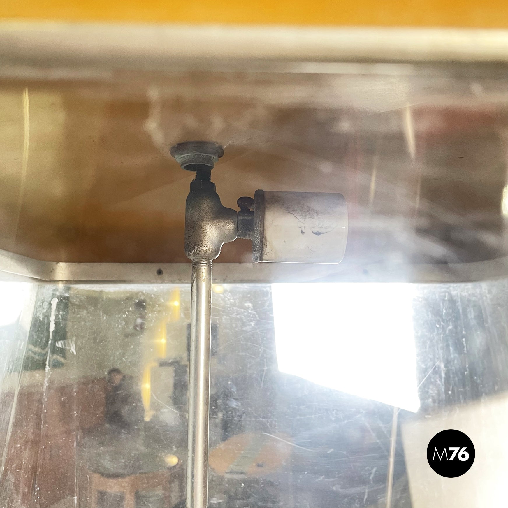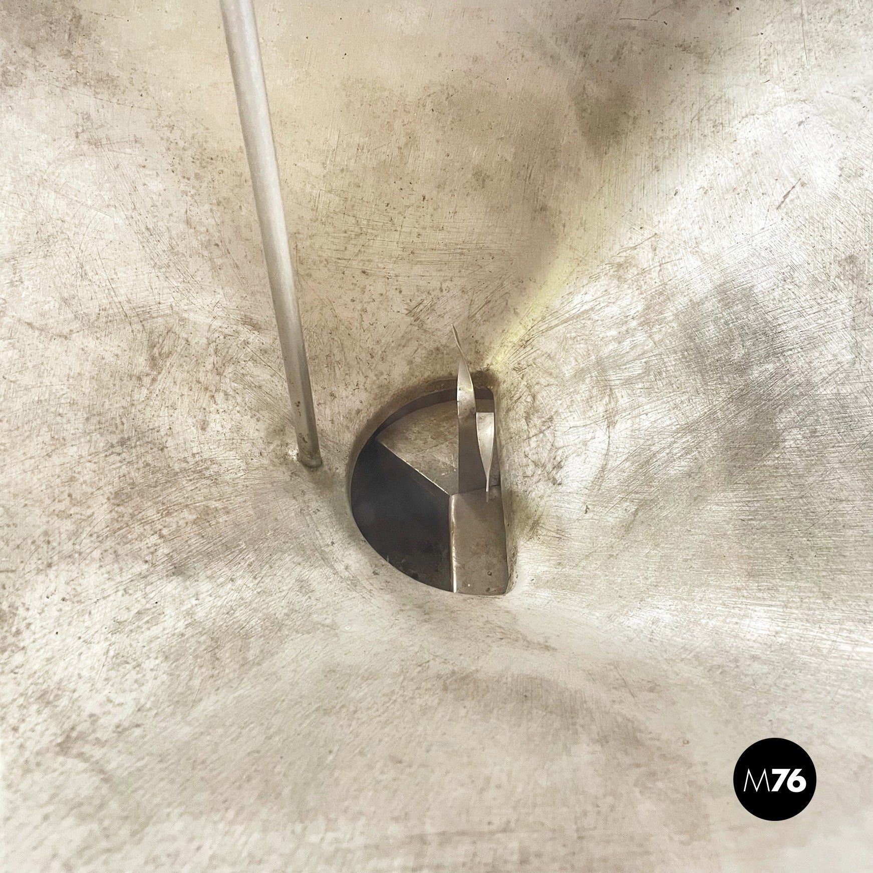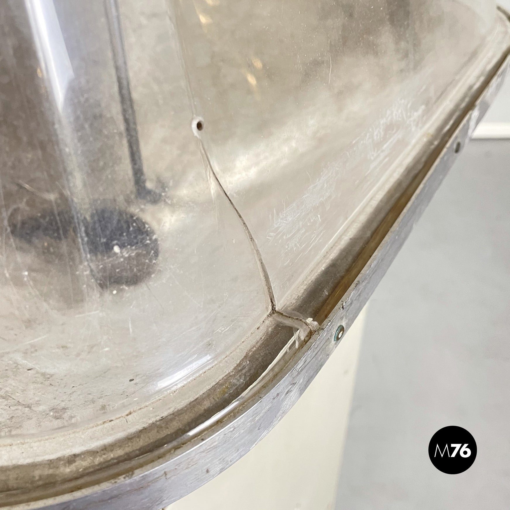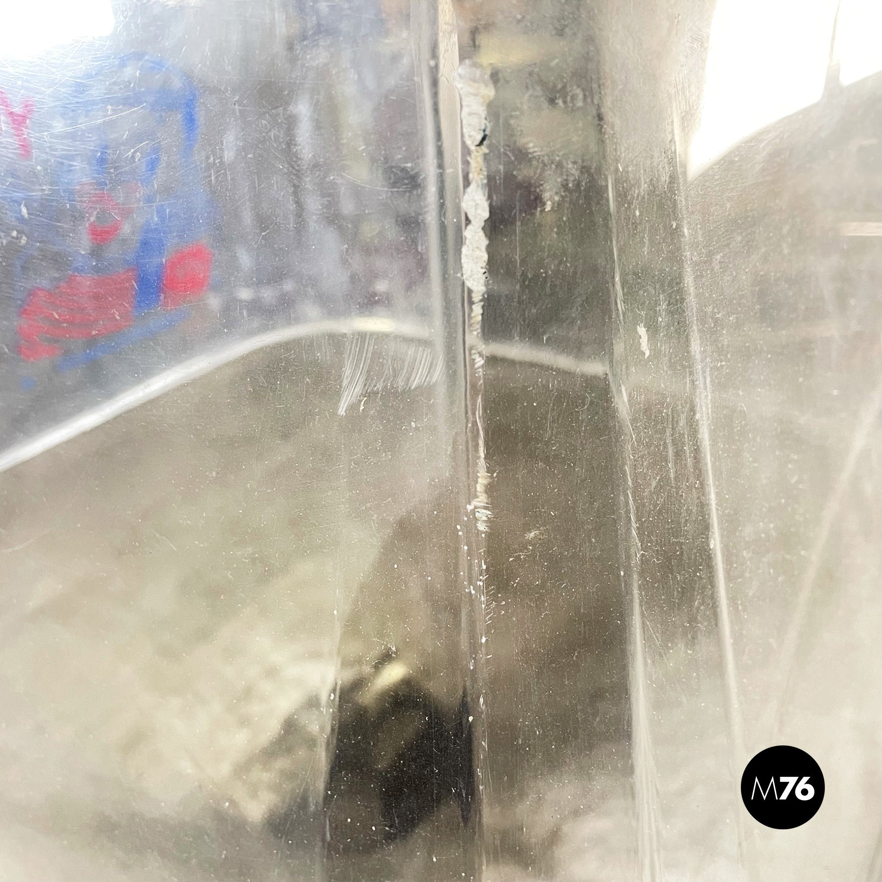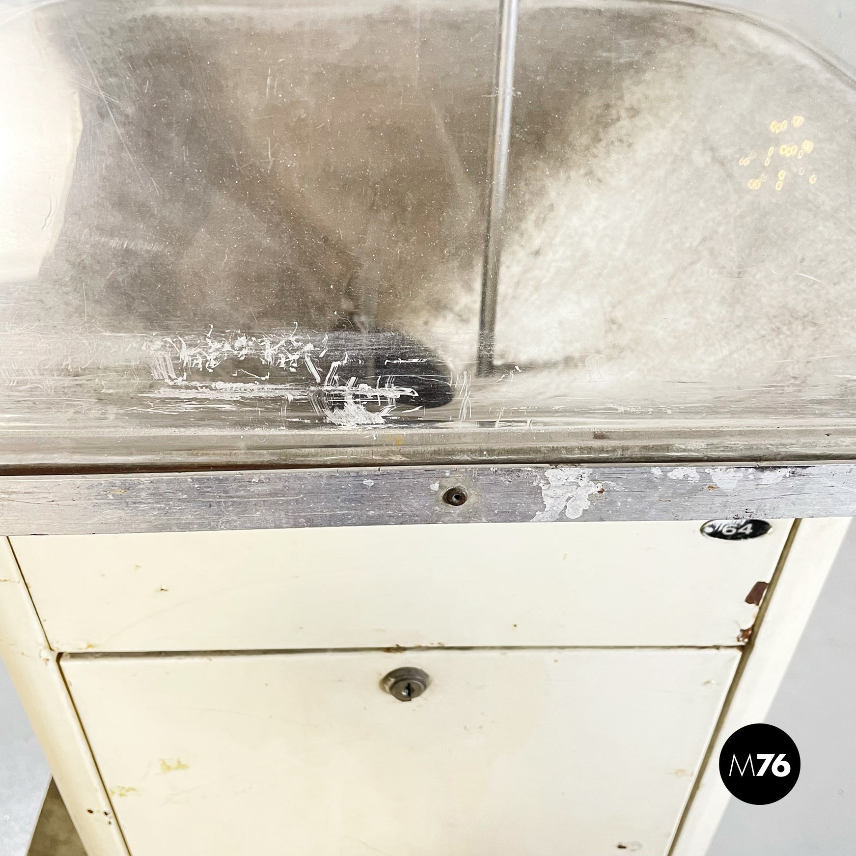 Macchina da terra elettrica di popcorn con base quadrata in metallo verniciato bianco panna e struttura superiore per fare i popcorn in plastica trasparente dipinta e metallo. Sulla struttura centrale è presente il logo in viola il porta sacchetti l?entrata per le monete e il distributore. La parte superiore invece presenta un bambino dipinto in rosso e blu come immagine promozionale. La macchinetta è disposta di ruote per facilitare gli spostamenti.
