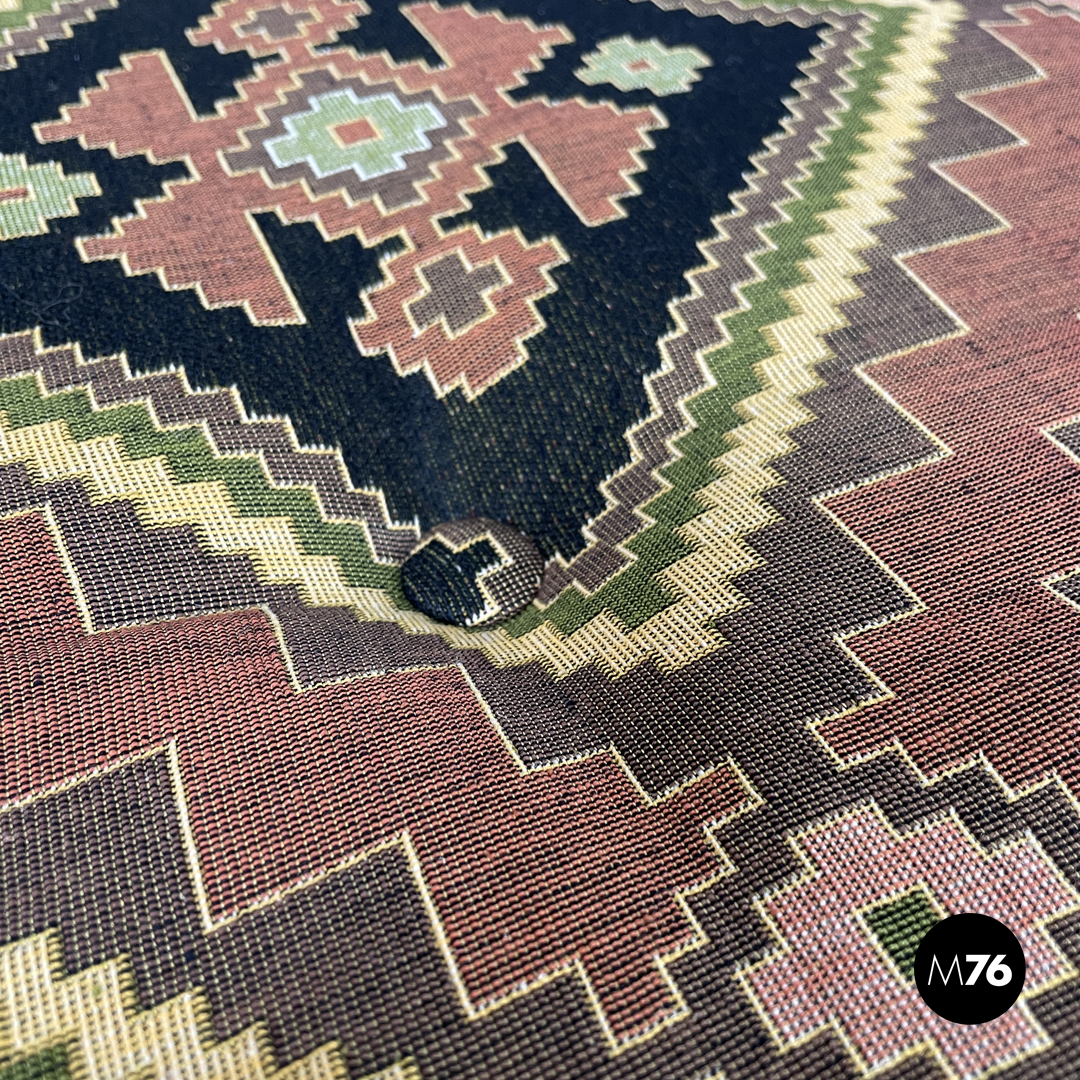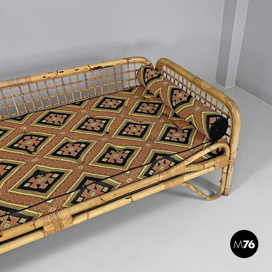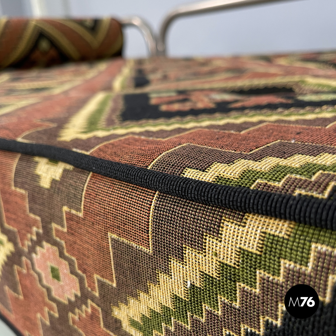 Materasso per daybed rettangolare. Il tessuto che lo riveste è a sfondo nero con decorazioni geometriche marroni gialle rosse e verdi ed ha i bottoni e il bordino neri. Presenta due cuscini cilindrici con fascia che possono essere disposti a piacimento.