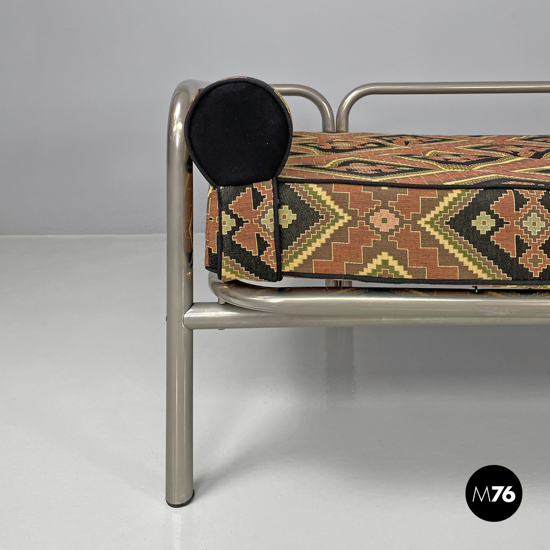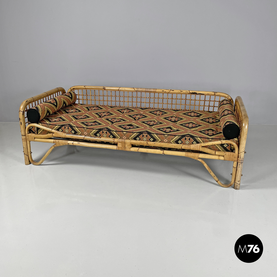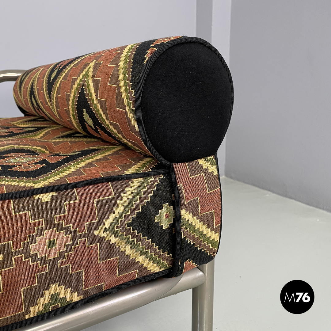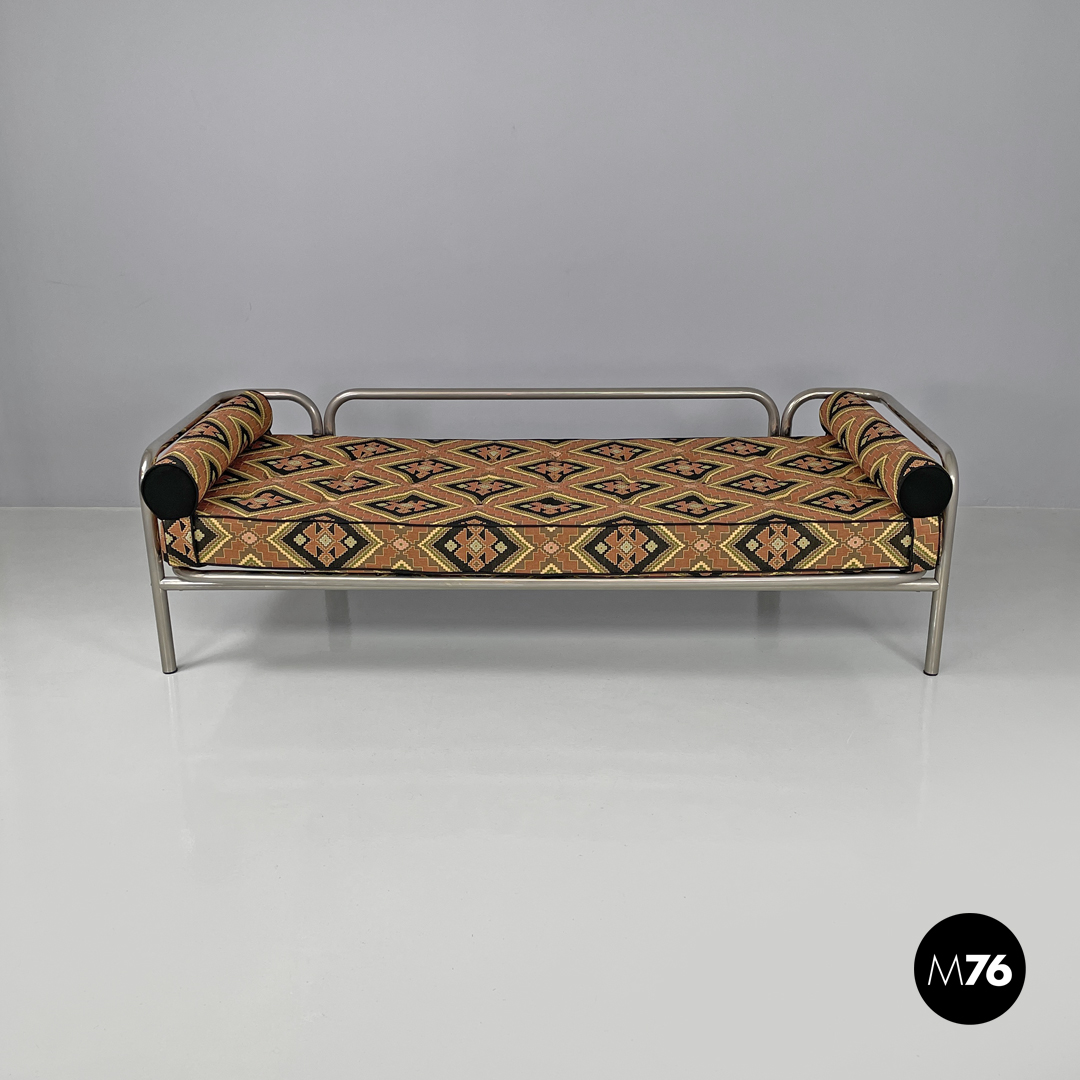 Materasso per daybed rettangolare. Il tessuto che lo riveste è a sfondo nero con decorazioni geometriche marroni gialle rosse e verdi ed ha i bottoni e il bordino neri. Presenta due cuscini cilindrici con fascia che possono essere disposti a piacimento.