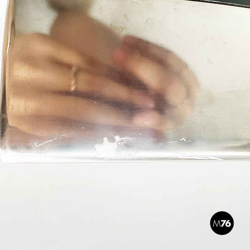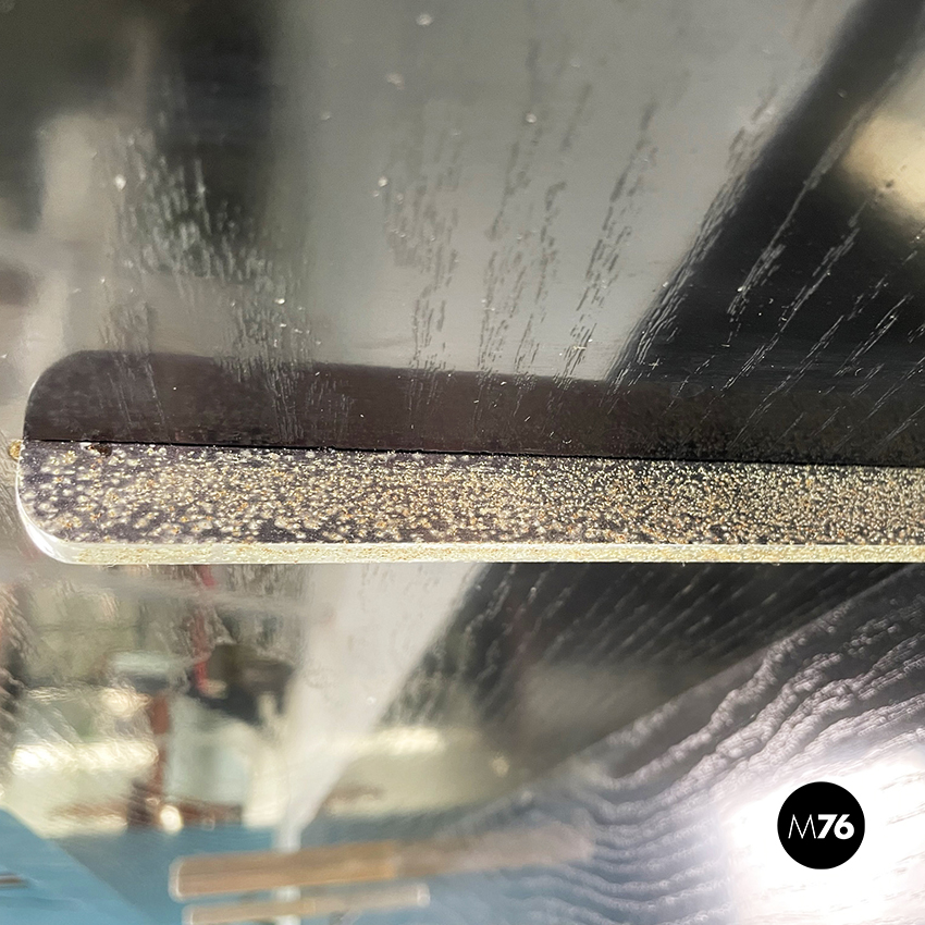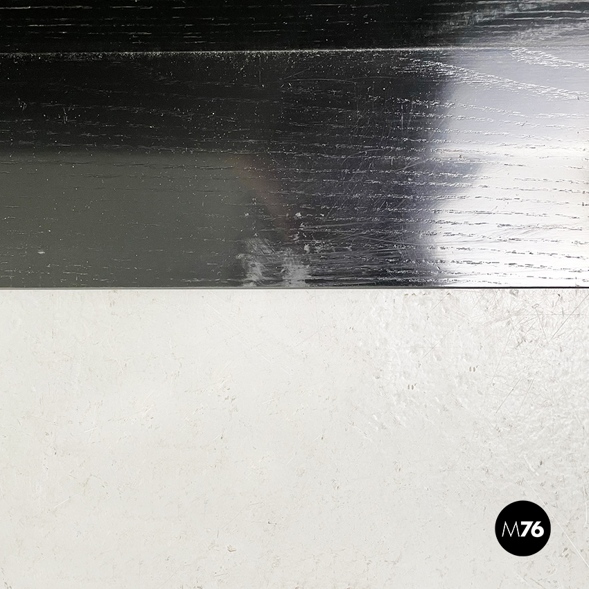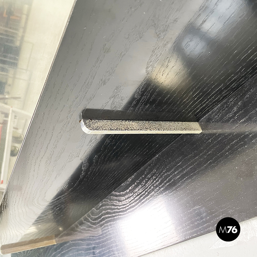 Mensola rettangolare in legno verniciato nero e rifiniture in acciaio. La mensola presenta un’asse verticale su cui sono posti i 3 sostegni in acciaio.