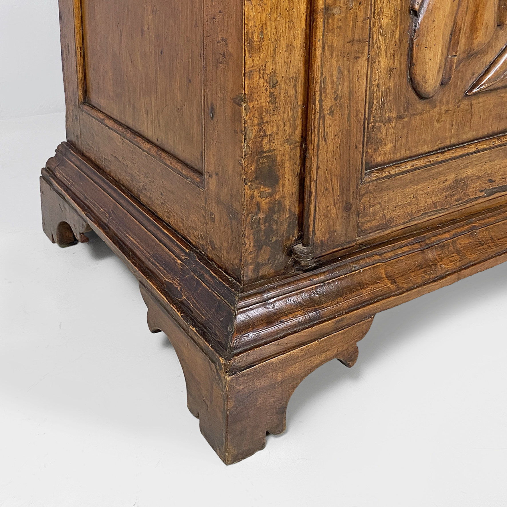 Walnut storage unit or sideboard with double hinged door with embossed design on the front and sides with coffered decoration and original round hinges of the time as well as the two internal shelves.