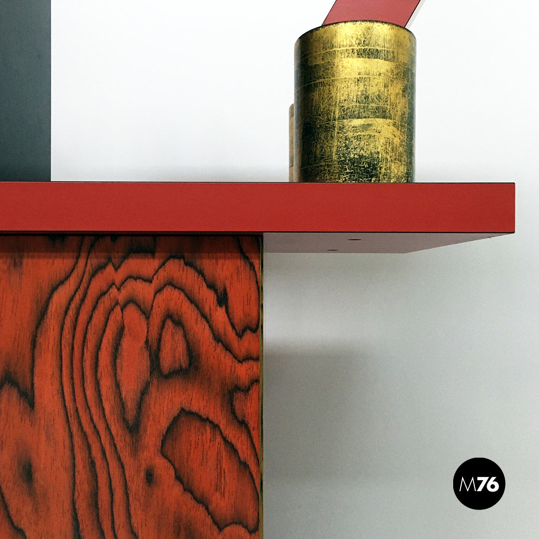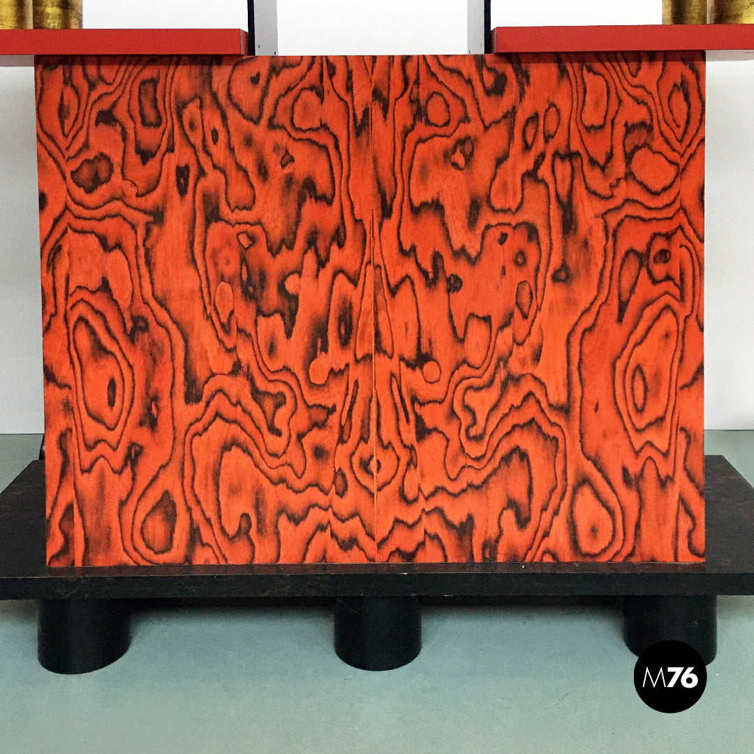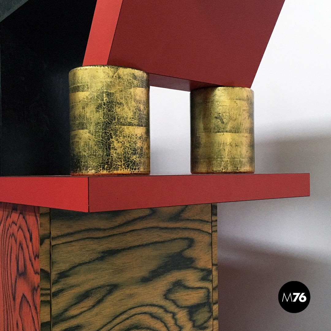 Mobile modello Freemont con struttura in legno poggiante su cinque zampe cilindriche nere e con contenitore in legno verniciato. La parte superiore funge da libreria ed è caratterizzata da rivestimenti in laminato rosso bianco e nero mentre le colonnine in alto sono verniciate in color rosso e oro.