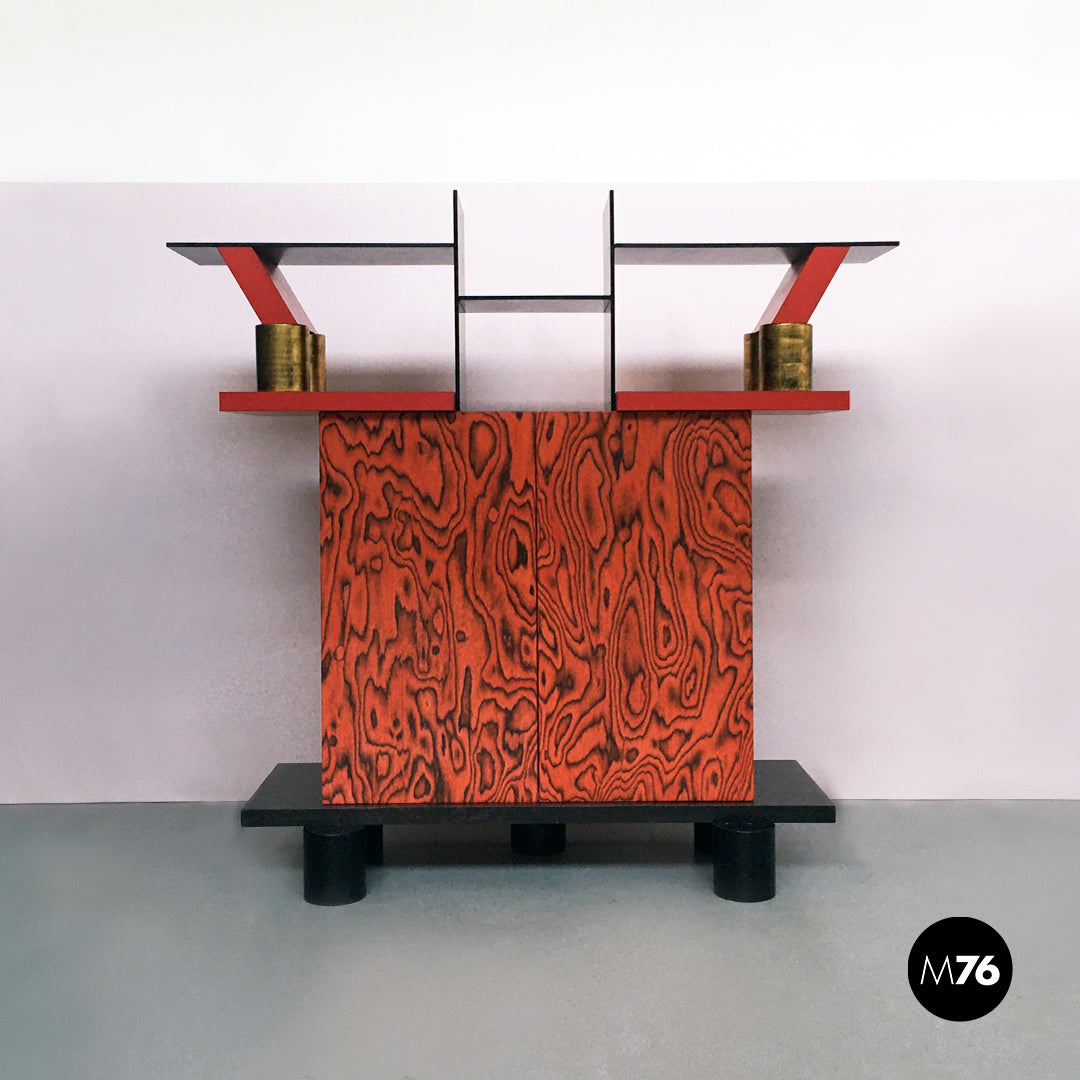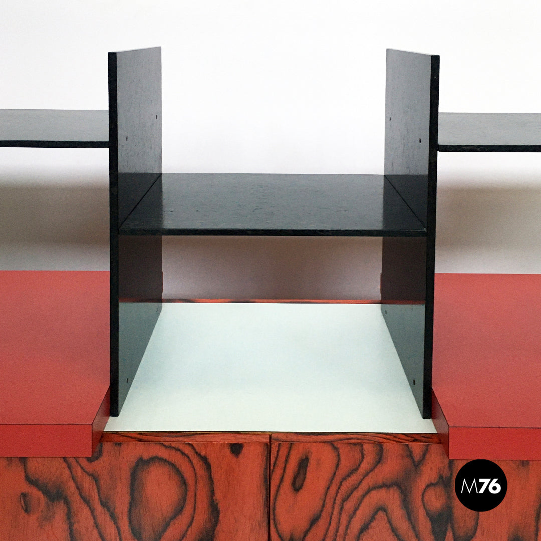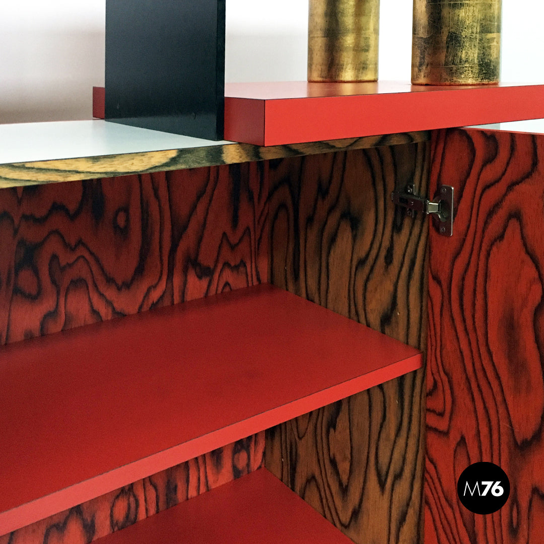 Mobile modello Freemont con struttura in legno poggiante su cinque zampe cilindriche nere e con contenitore in legno verniciato. La parte superiore funge da libreria ed è caratterizzata da rivestimenti in laminato rosso bianco e nero mentre le colonnine in alto sono verniciate in color rosso e oro.