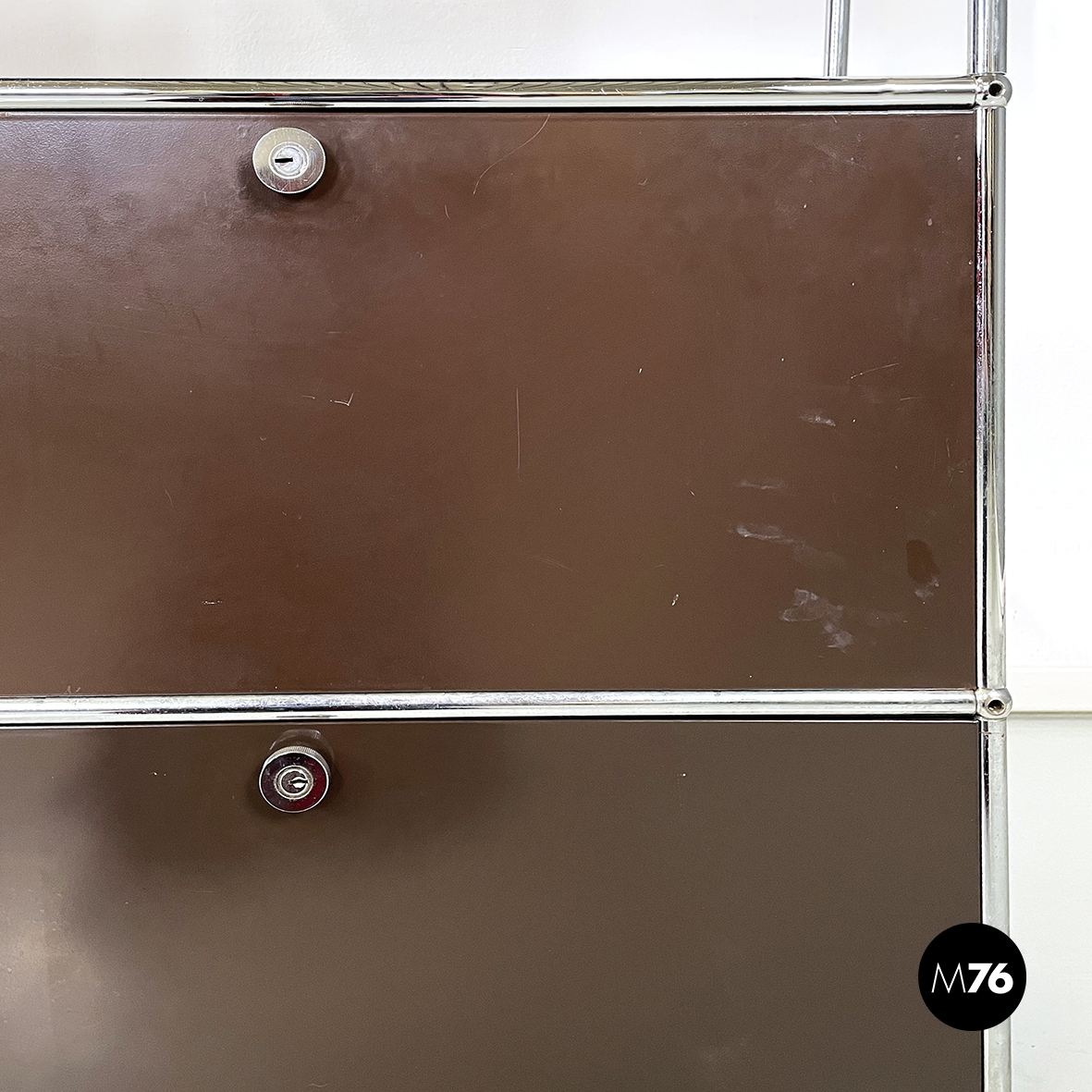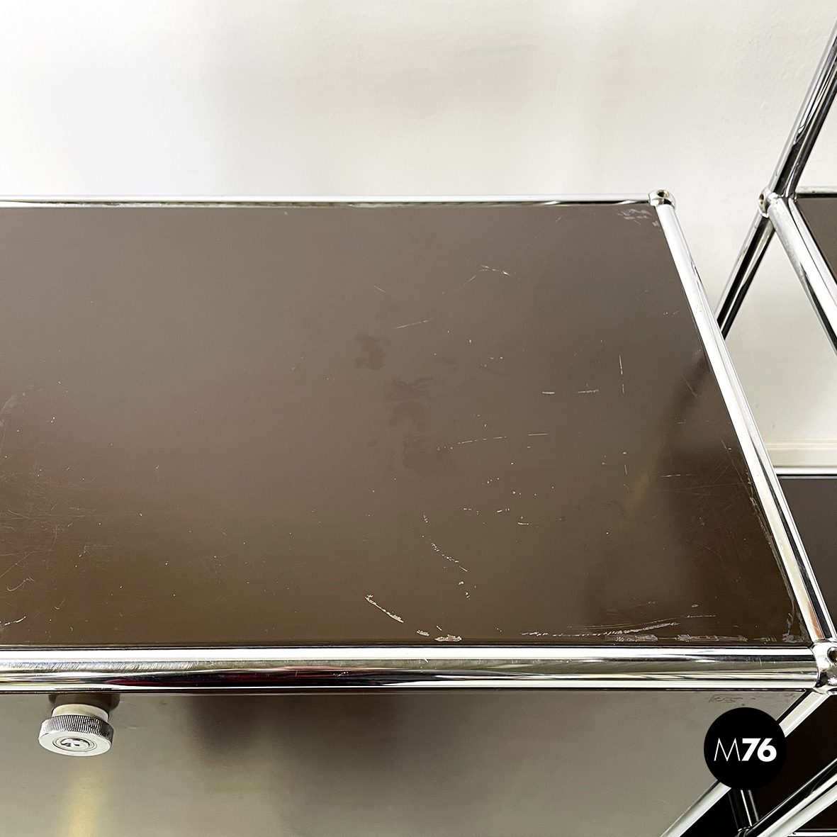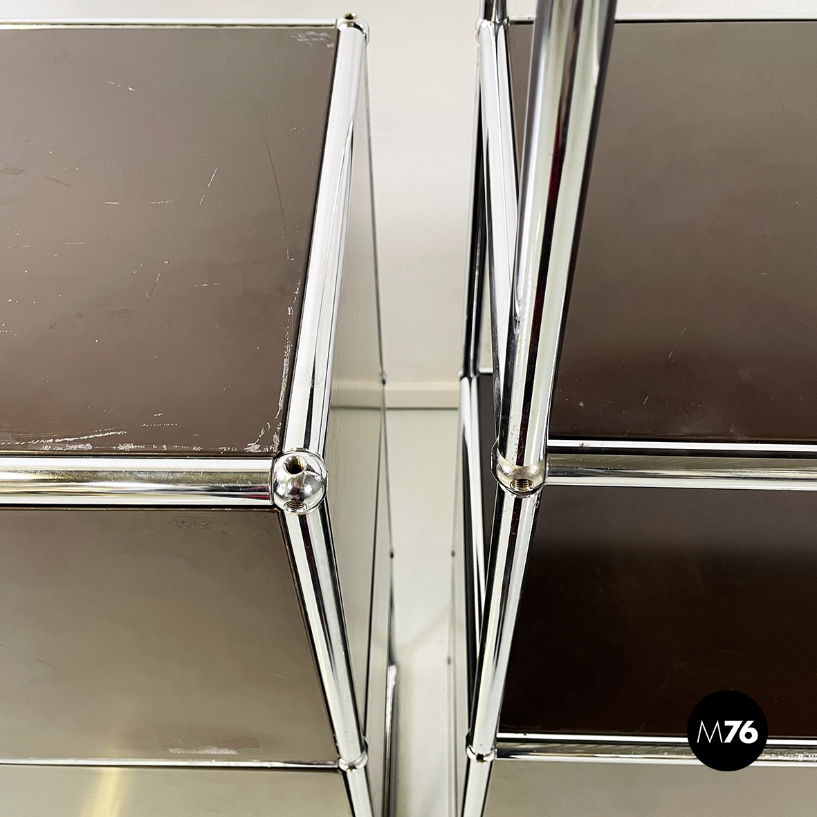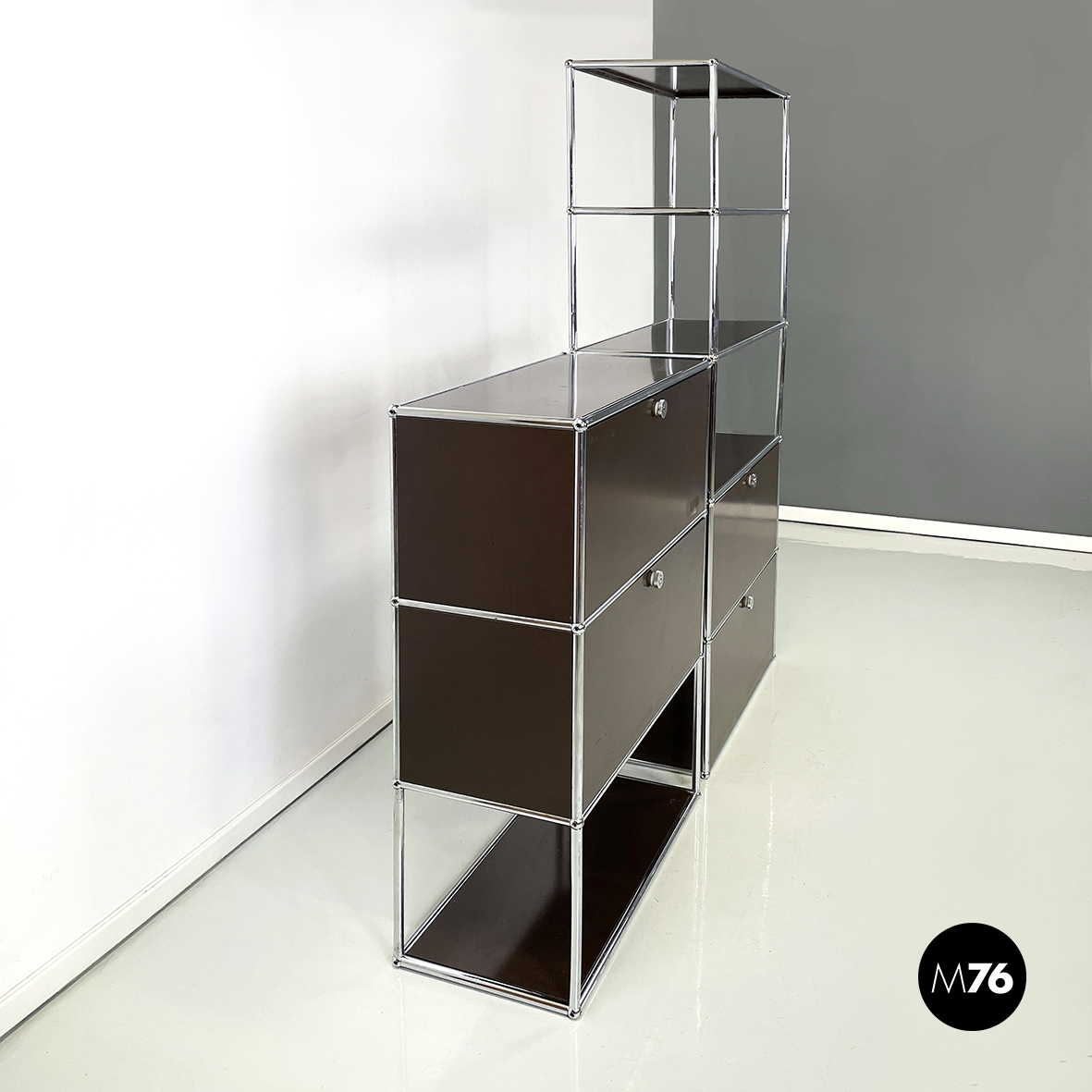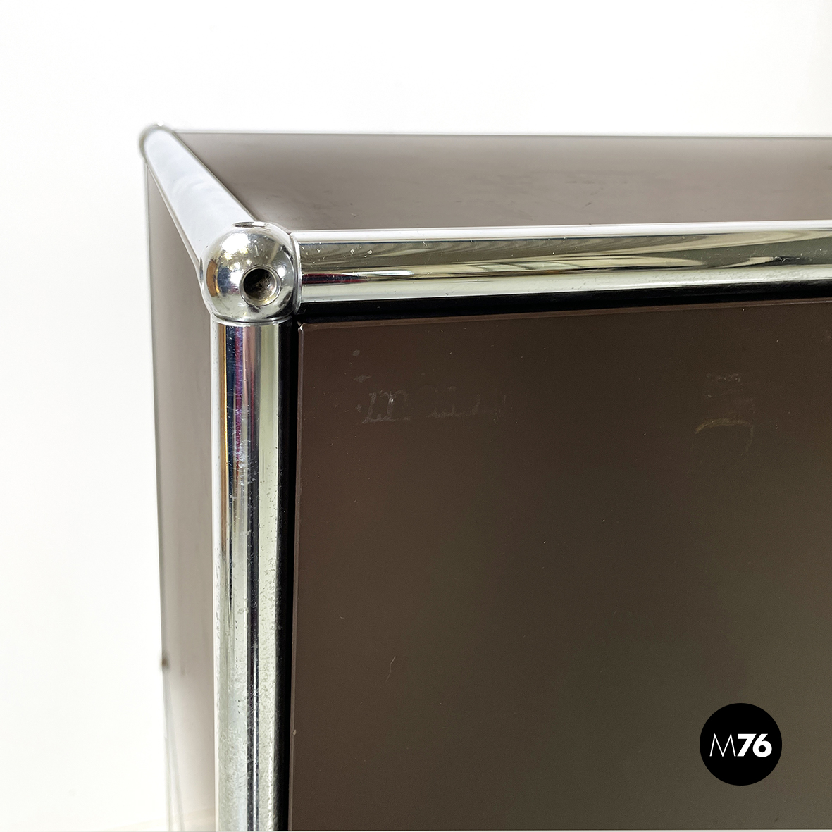 Coppia di mobili contenitori in metallo verniciato marrone scuro con profilo in tondino di metallo. La prima credenza presenta nella parte alta due vani con apertura a ribalta e una mensola nella parte bassa. Il secondo sideboard presenta nella parte alta tre mensole e nella parte bassa due vani con apertura a ribalta. Aprendo l’anta dello scomparto si ottiene un comodo ripiano di appoggio che diventa una postazione di lavoro personale o un ripiano di servizio.