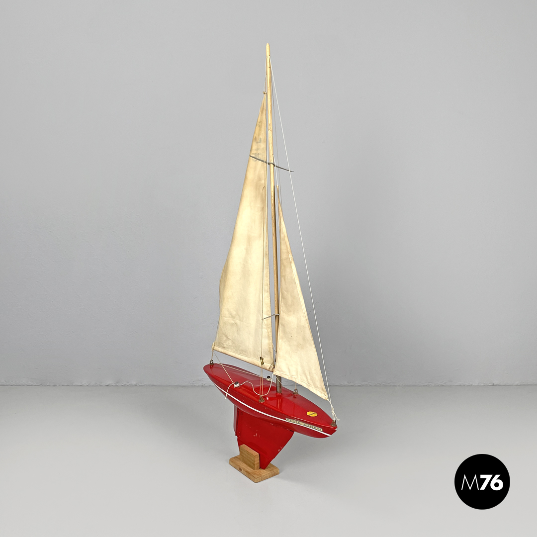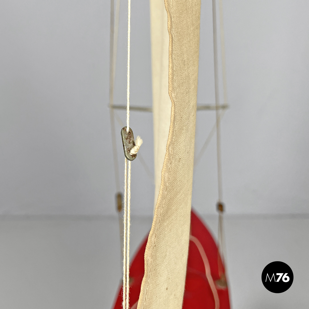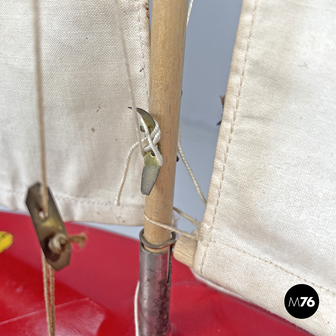 Modellino di barca a vela su piedistallo in legno. Il corpo della barca e in metallo rosso le due vele sono in tessuto beige. Con parti in metallo e fili in tessuto. Su un fianco si trova un’etichetta bianca con la scritta “Pasta Agnesi” in azzurro e sopra un’altra etichetta tonda gialla con scritta “Hopla” in blu.