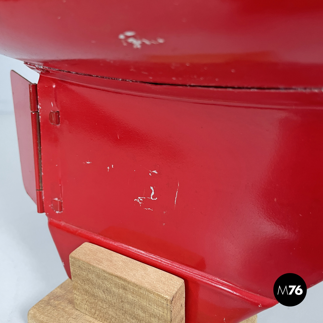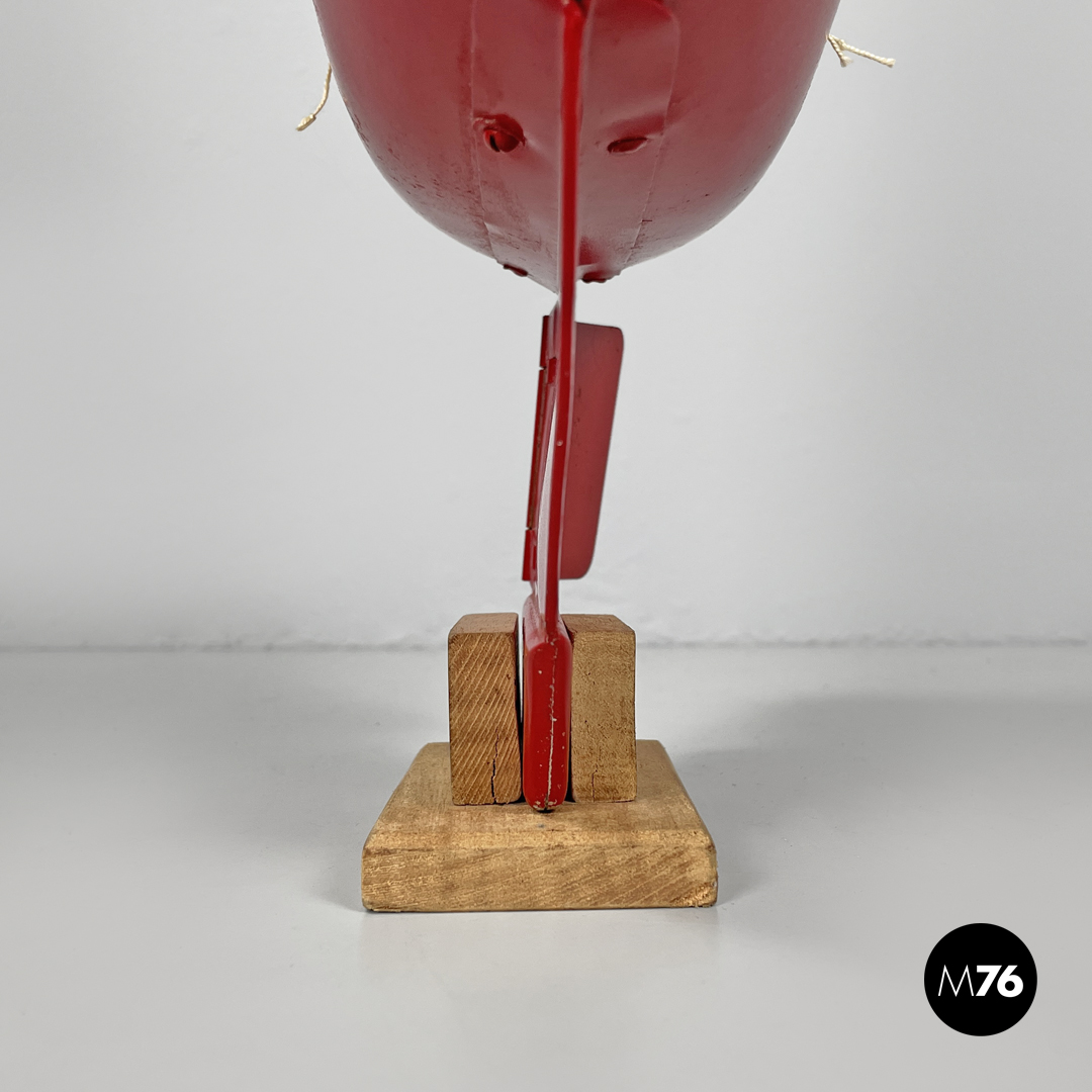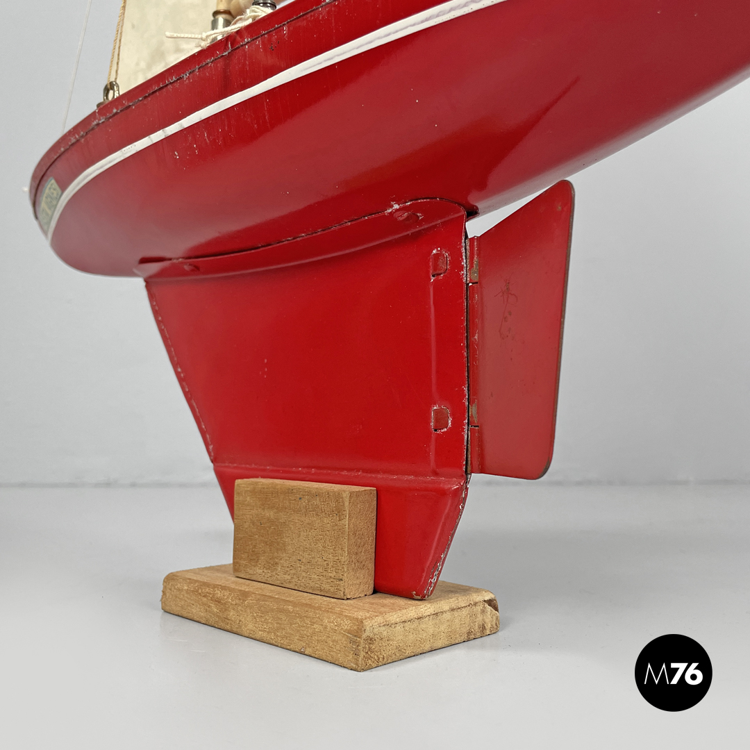 Modellino di barca a vela su piedistallo in legno. Il corpo della barca e in metallo rosso le due vele sono in tessuto beige. Con parti in metallo e fili in tessuto. Su un fianco si trova un’etichetta bianca con la scritta “Pasta Agnesi” in azzurro e sopra un’altra etichetta tonda gialla con scritta “Hopla” in blu.