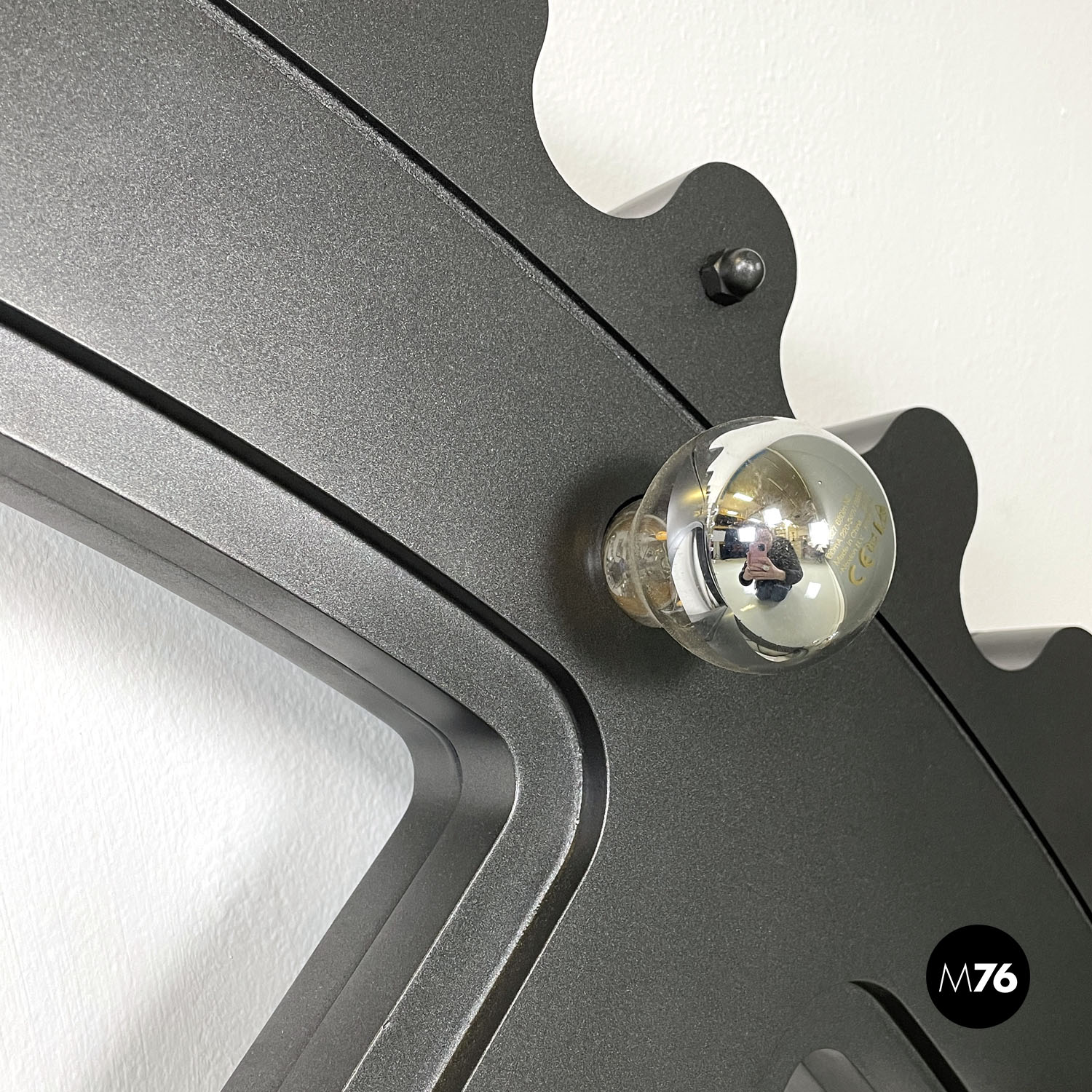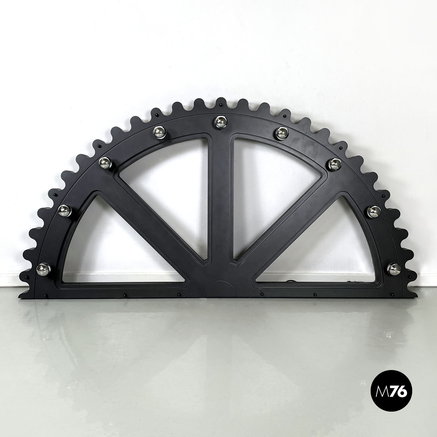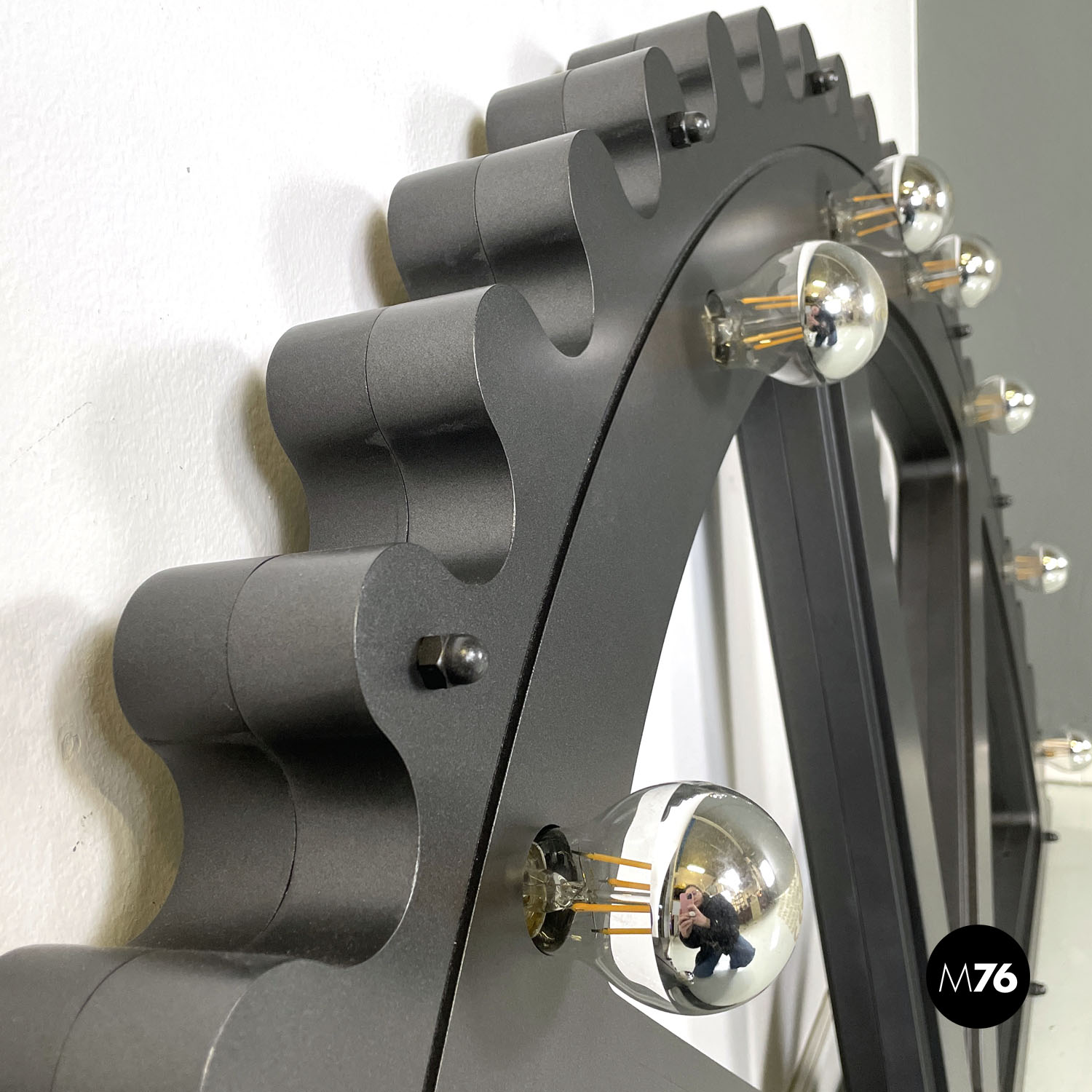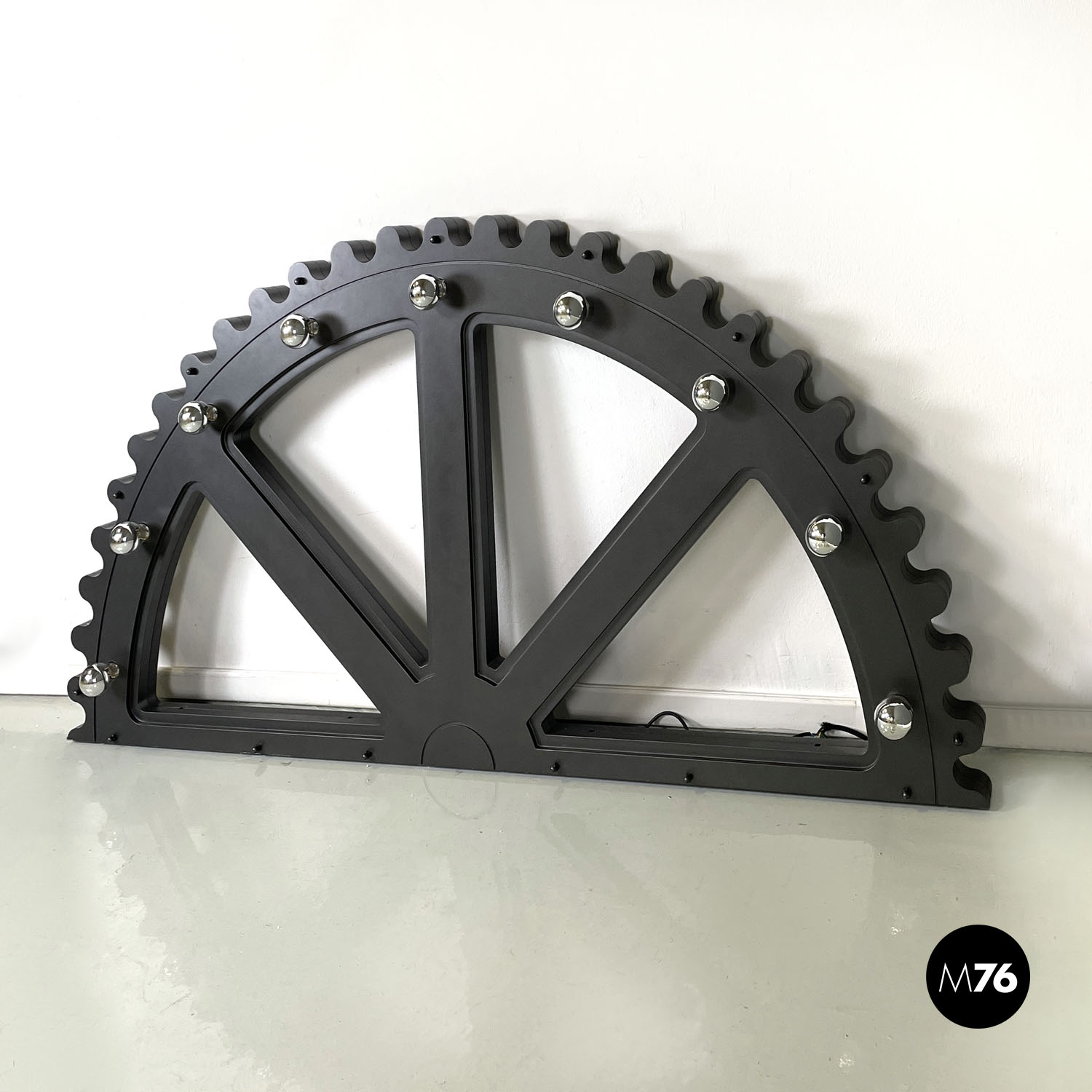 Oggetto di scena luminoso a semicerchio di mdf. Questo prop rappresenta la metà di un meccanismo o una ruota ed è laccato grigio scuro con finitura glitterata. Sono presenti nove punti luce.
