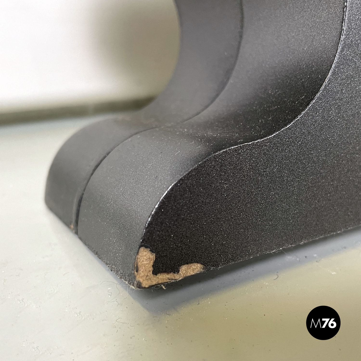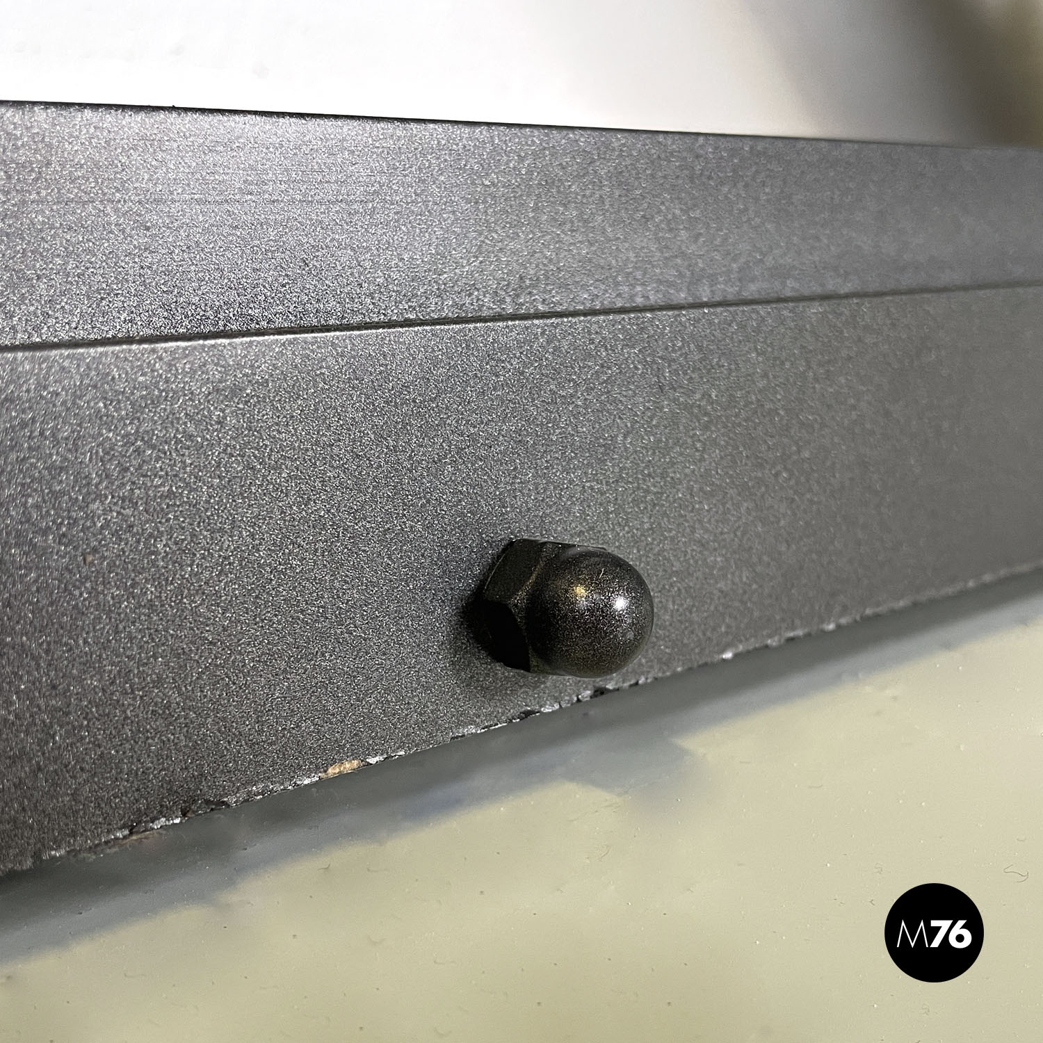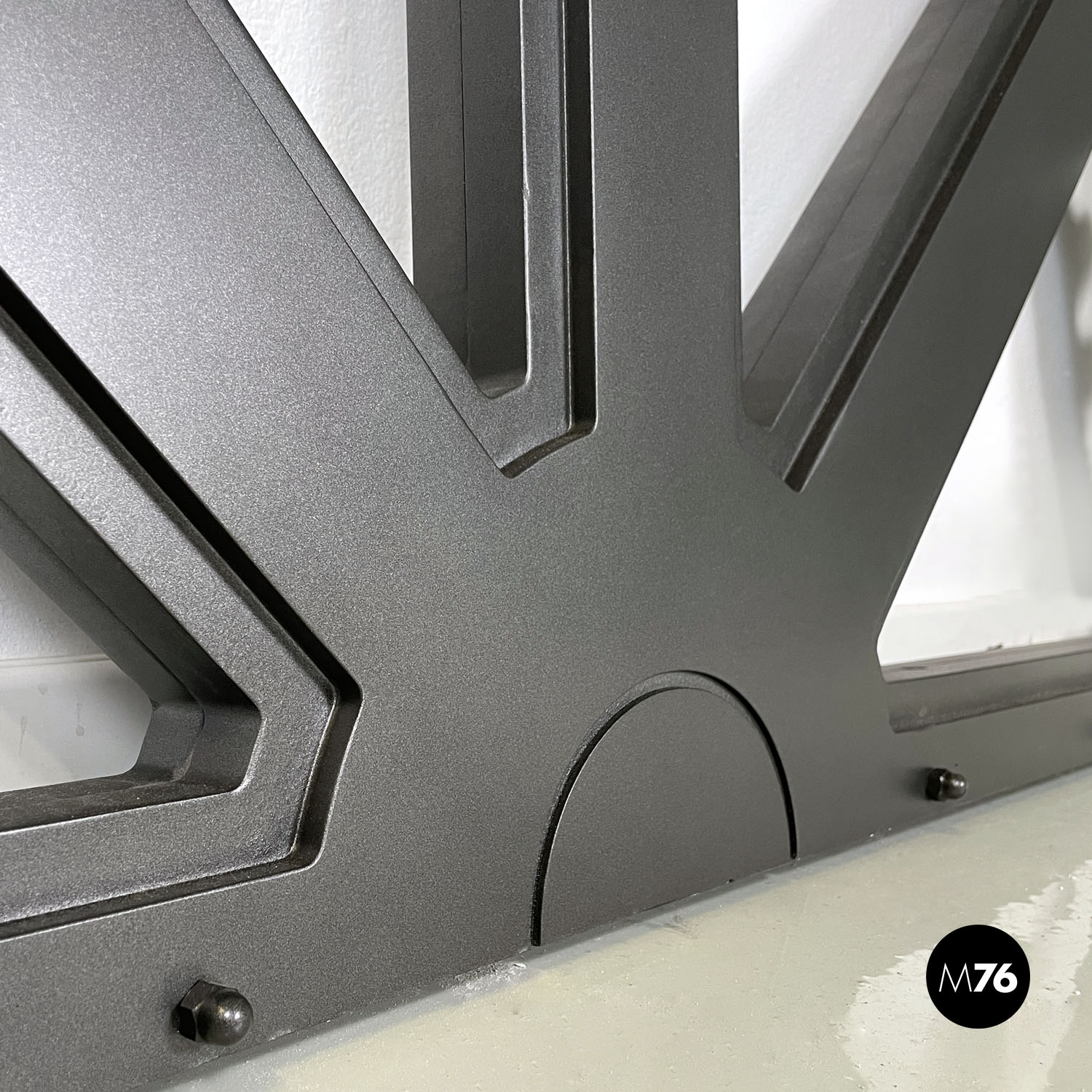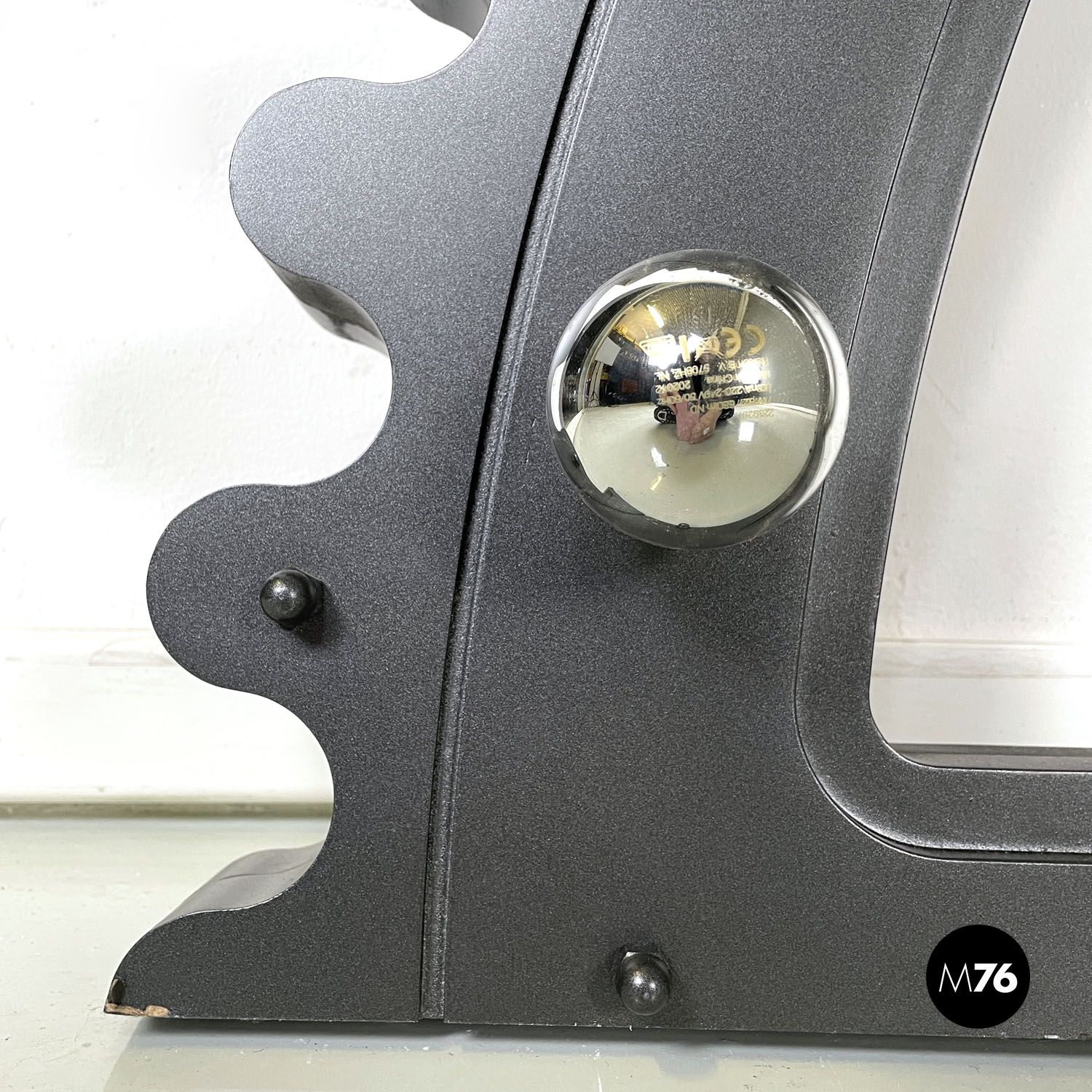 Oggetto di scena luminoso a semicerchio di mdf. Questo prop rappresenta la metà di un meccanismo o una ruota ed è laccato grigio scuro con finitura glitterata. Sono presenti nove punti luce.