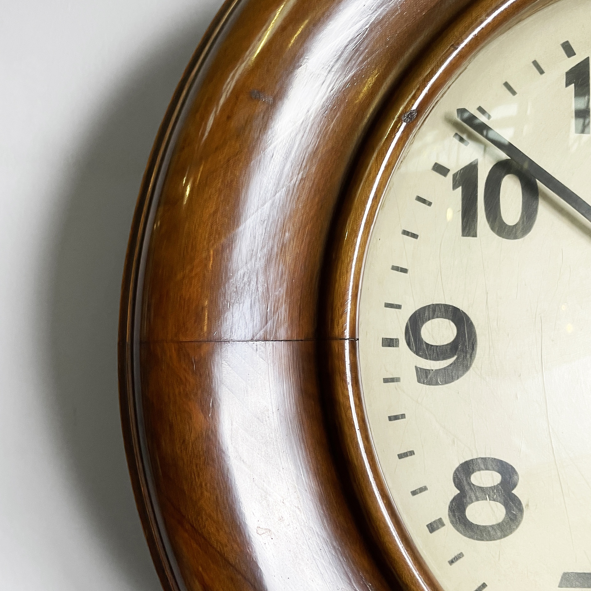 Orologio da parete in legno. Il quadrante tondo presenta un fondo in beige con numeri in nero lancette nere e chiusura con vetro. La struttura in legno è di forma esagonale. Art Deco.