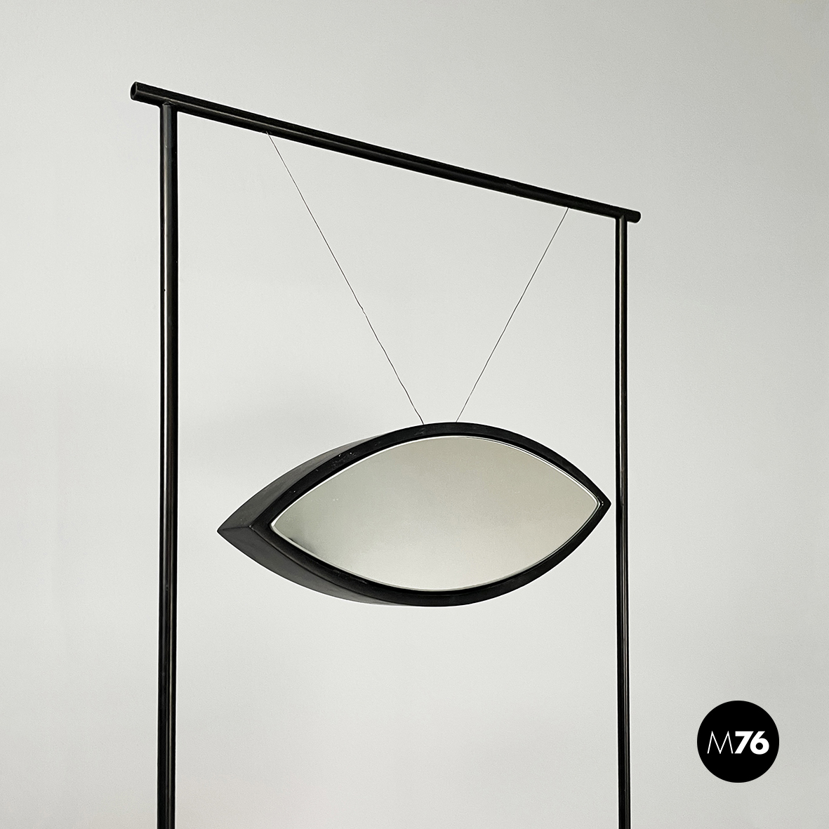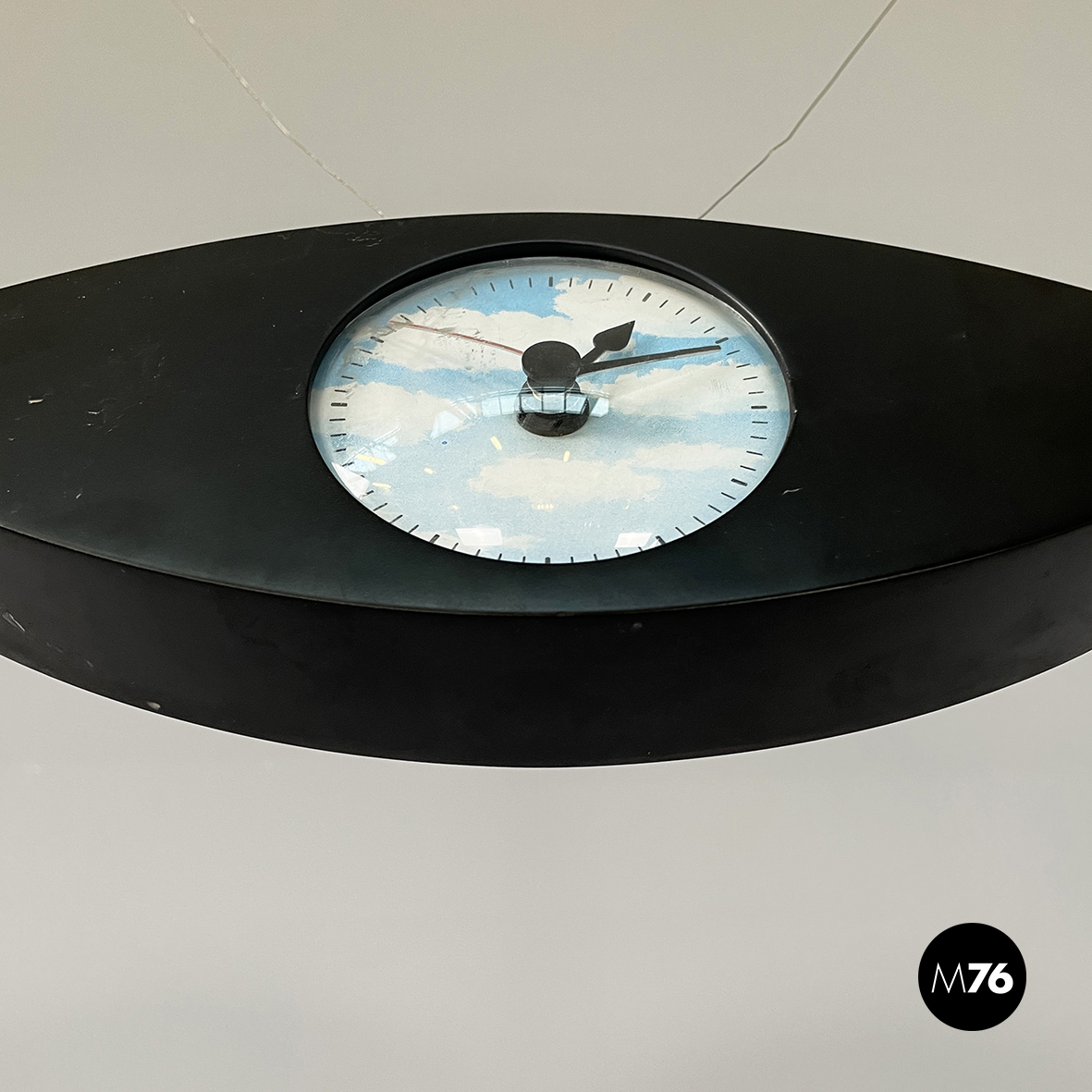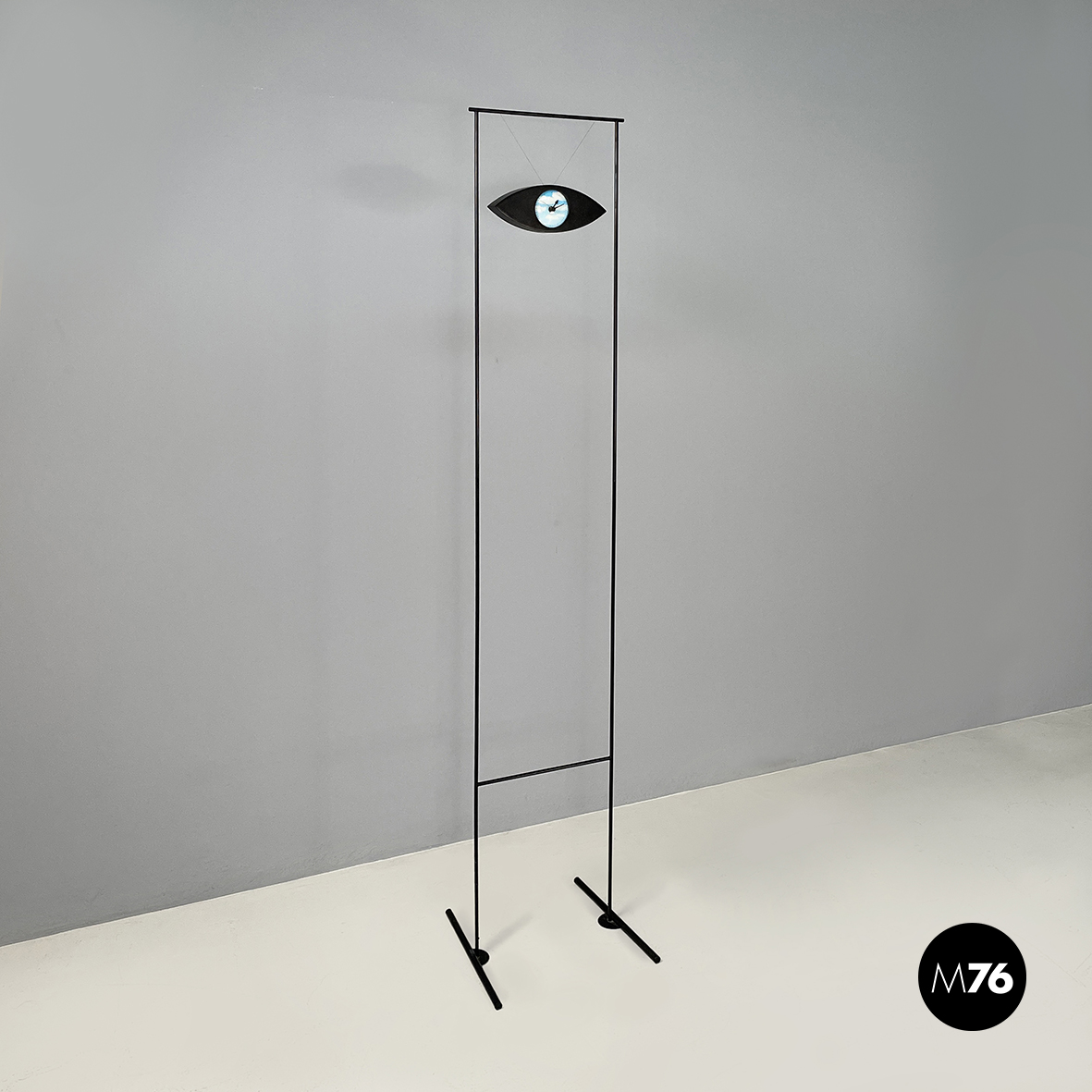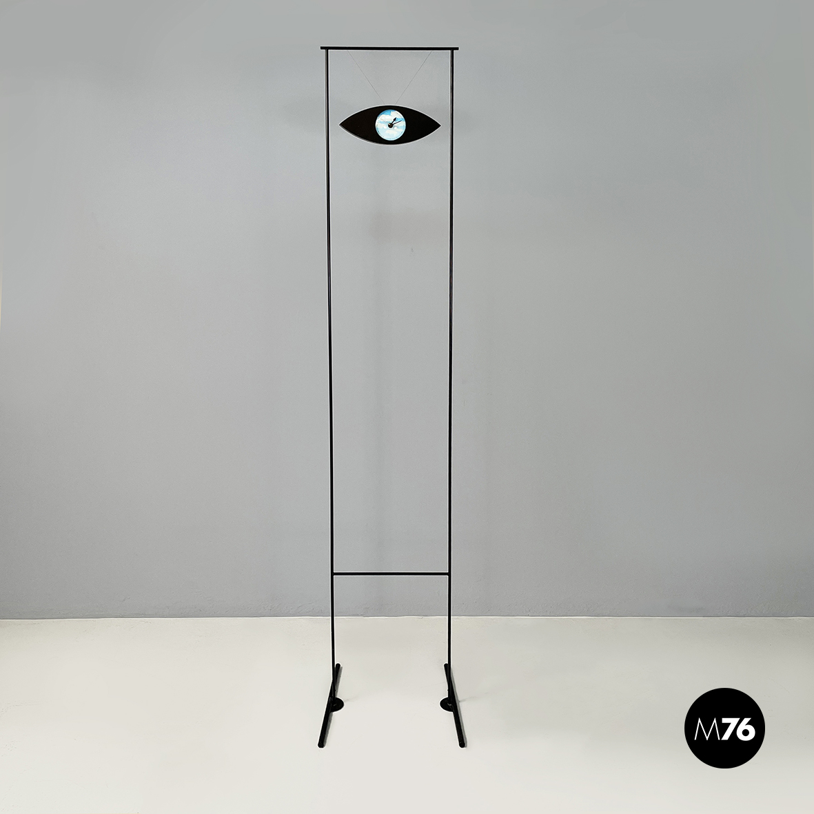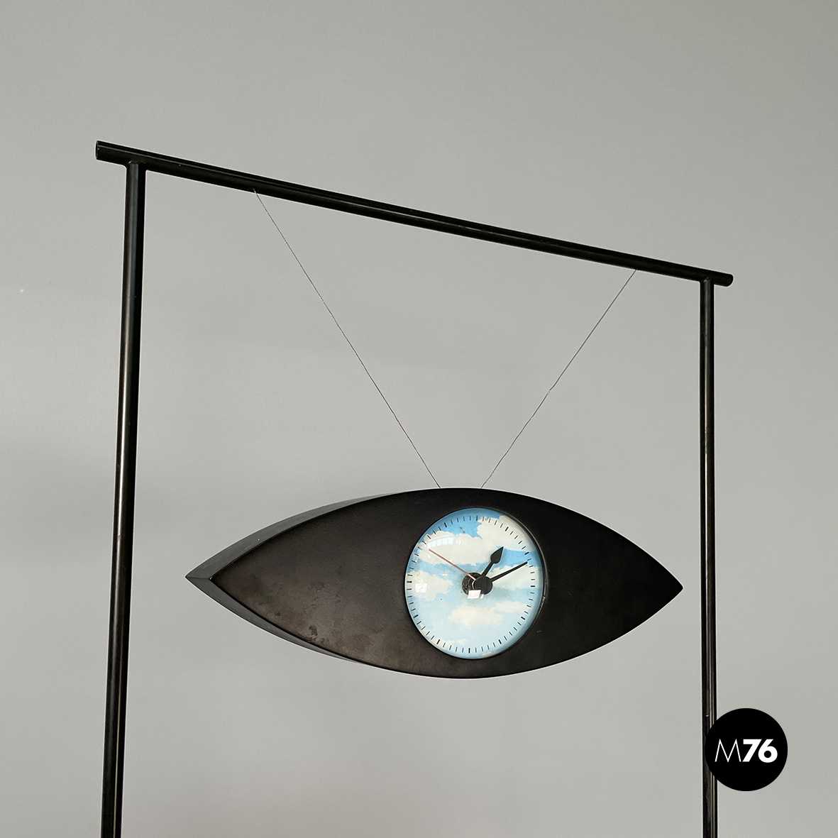 Orologio da terra con specchietto retrovisore in metallo e plastica. La struttura del quadrate è a forma di occhio in plastica nera mentre il quadrate tondo presenta il disegno di un cielo azzurro con nuvole. Sul retro del quadrante è presente uno specchio a forma di occhio. L’occhio è tenuto sospeso da due cavi sottili i quali si collegano alla struttura in tondino di metallo verniciato nero. I due piedini cilindrici sono anche essi in metallo verniciato nero.