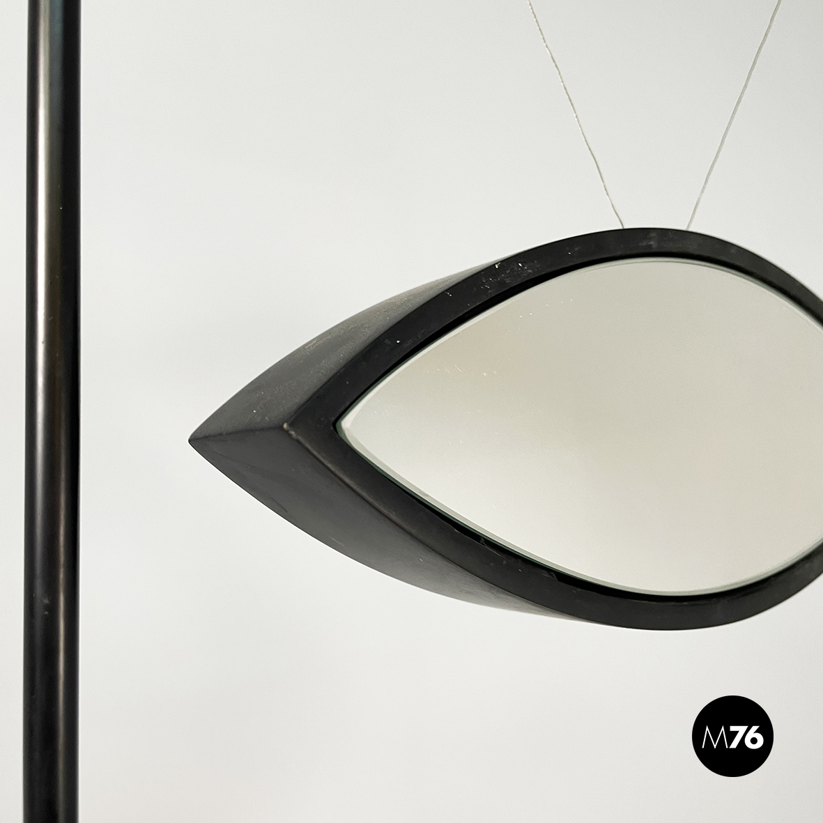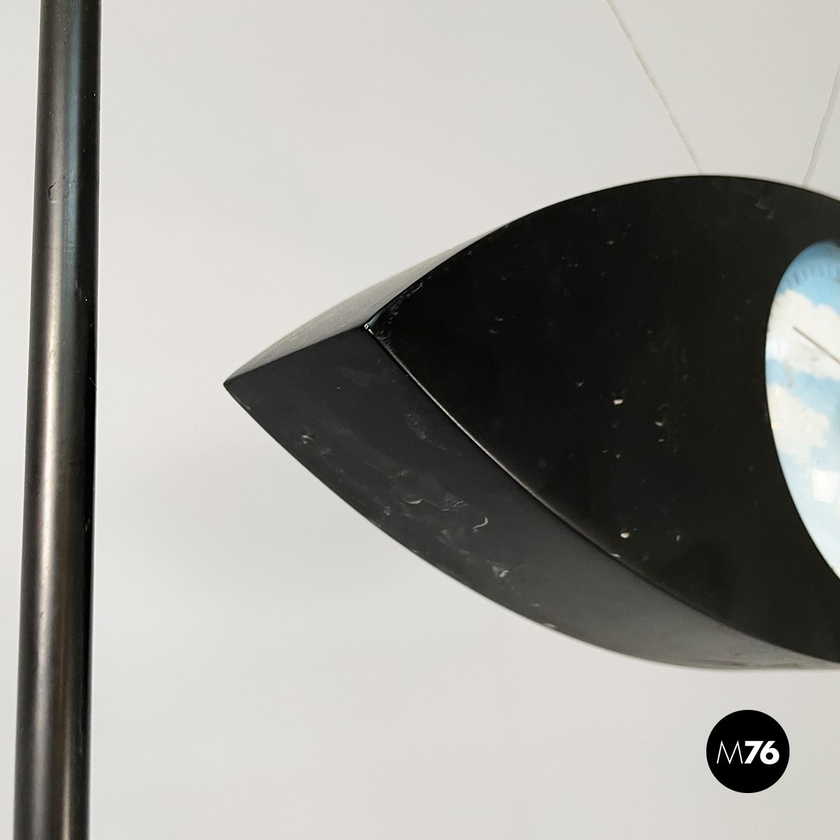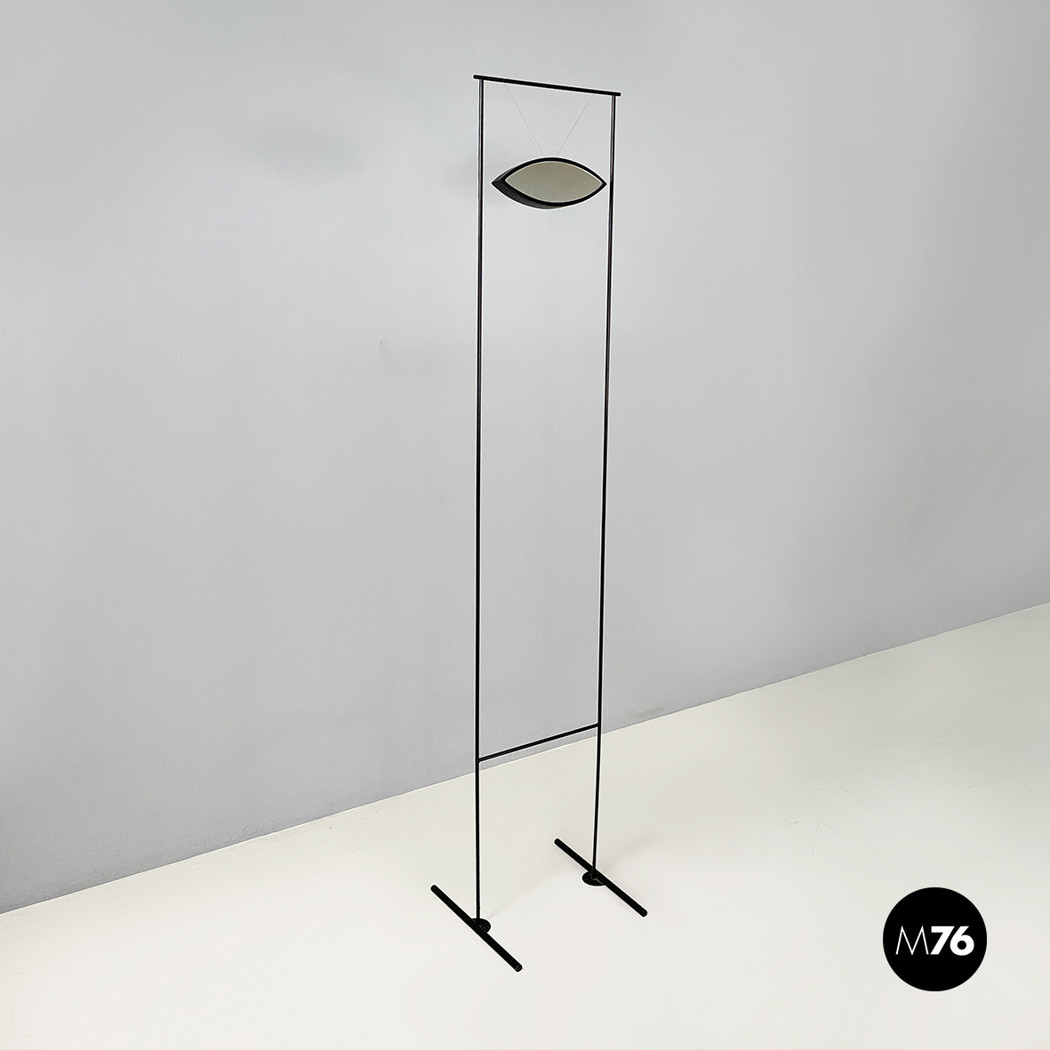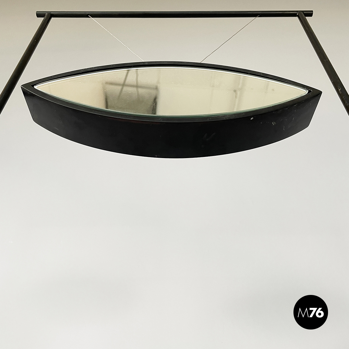 Orologio da terra con specchietto retrovisore in metallo e plastica. La struttura del quadrate è a forma di occhio in plastica nera mentre il quadrate tondo presenta il disegno di un cielo azzurro con nuvole. Sul retro del quadrante è presente uno specchio a forma di occhio. L’occhio è tenuto sospeso da due cavi sottili i quali si collegano alla struttura in tondino di metallo verniciato nero. I due piedini cilindrici sono anche essi in metallo verniciato nero.