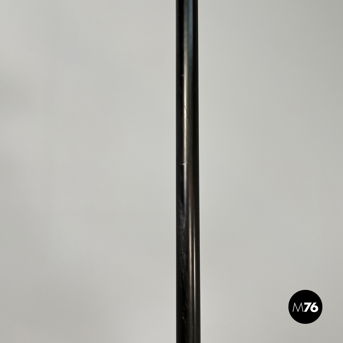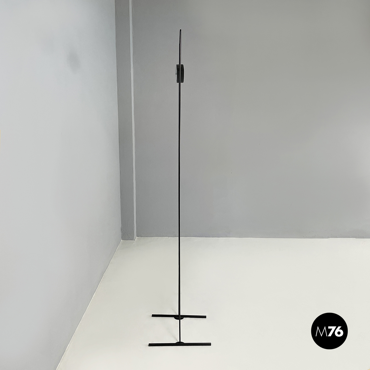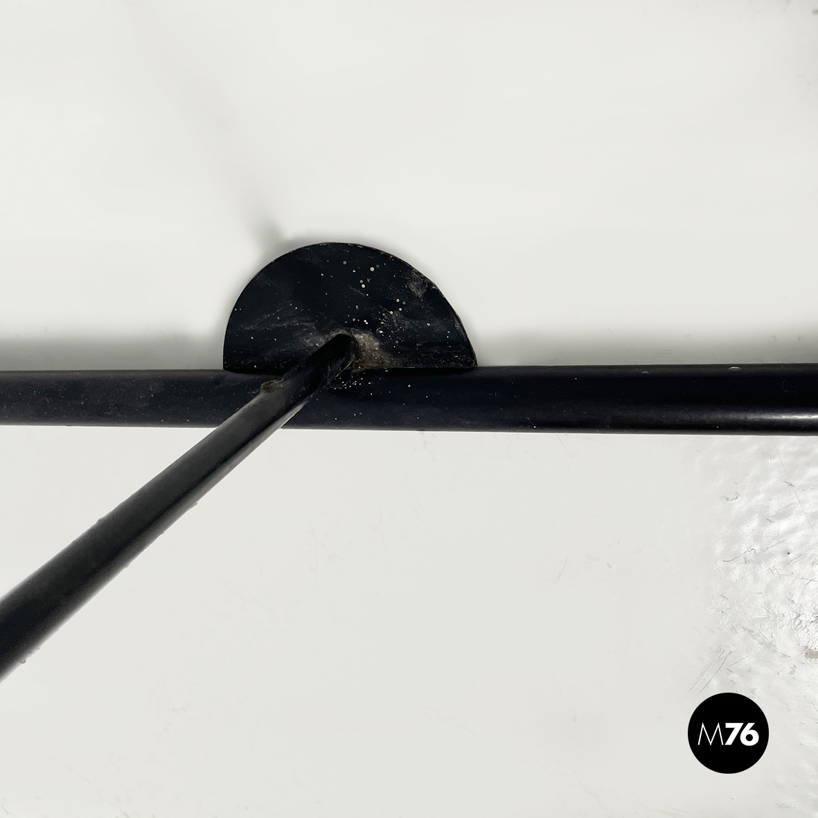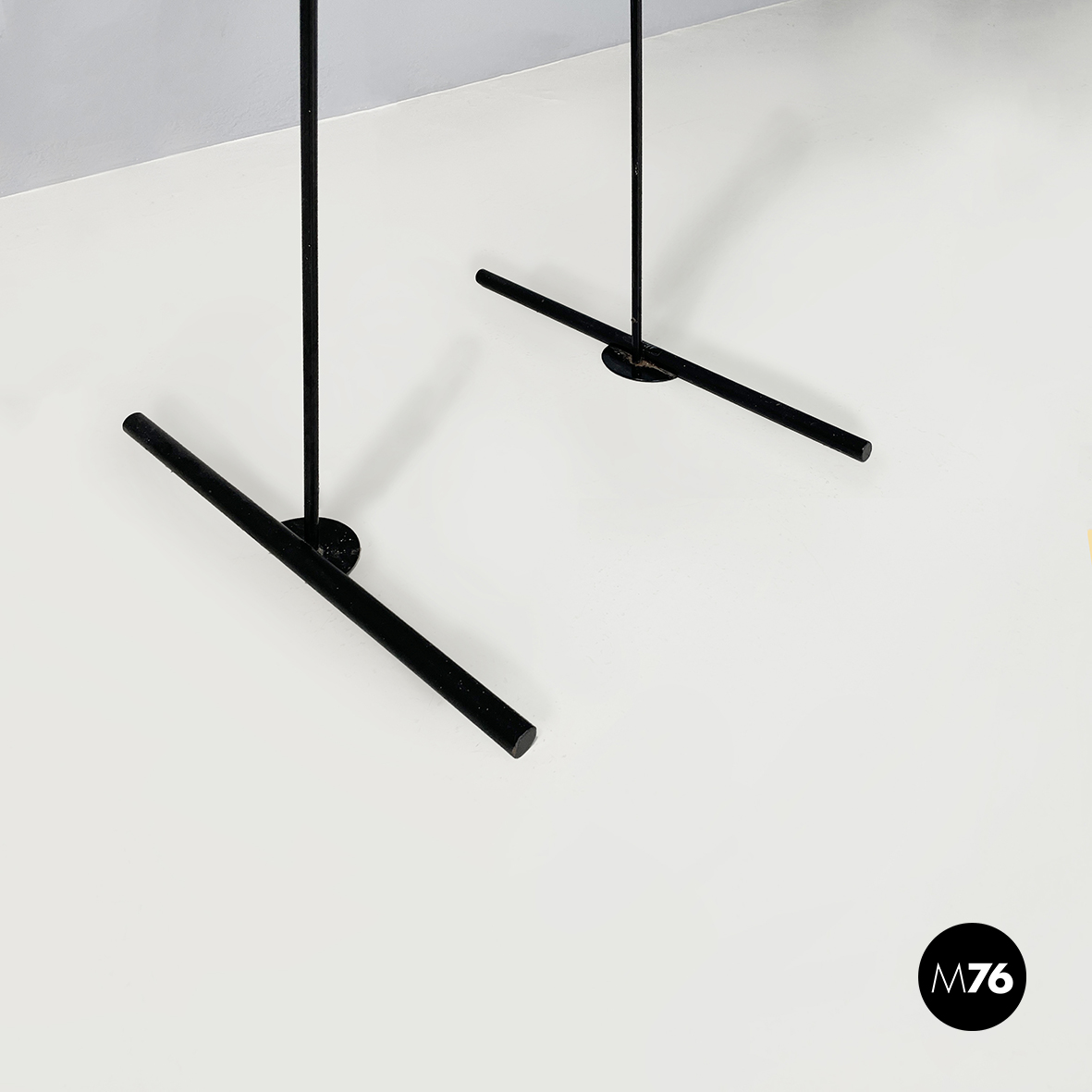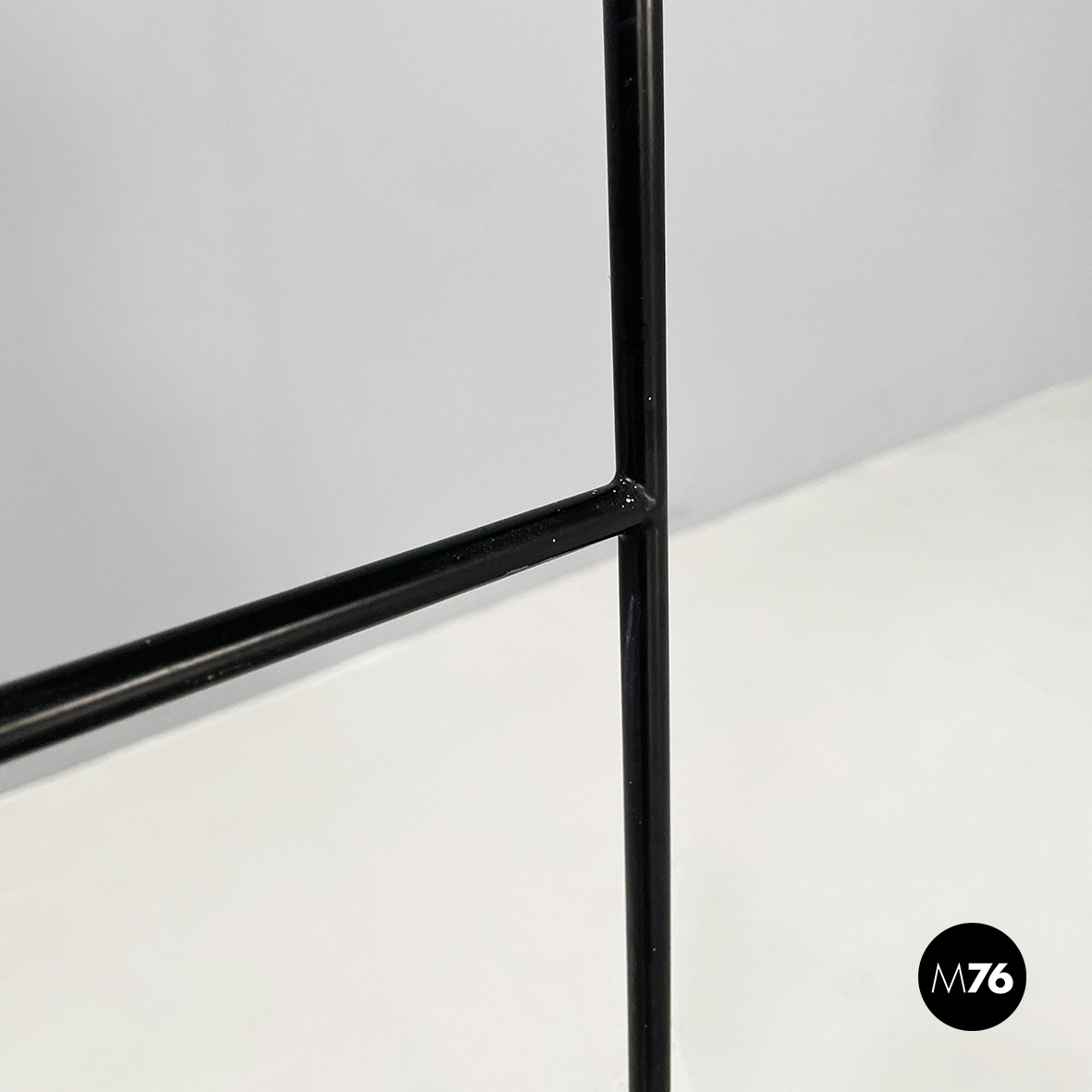 Orologio da terra con specchietto retrovisore in metallo e plastica. La struttura del quadrate è a forma di occhio in plastica nera mentre il quadrate tondo presenta il disegno di un cielo azzurro con nuvole. Sul retro del quadrante è presente uno specchio a forma di occhio. L’occhio è tenuto sospeso da due cavi sottili i quali si collegano alla struttura in tondino di metallo verniciato nero. I due piedini cilindrici sono anche essi in metallo verniciato nero.