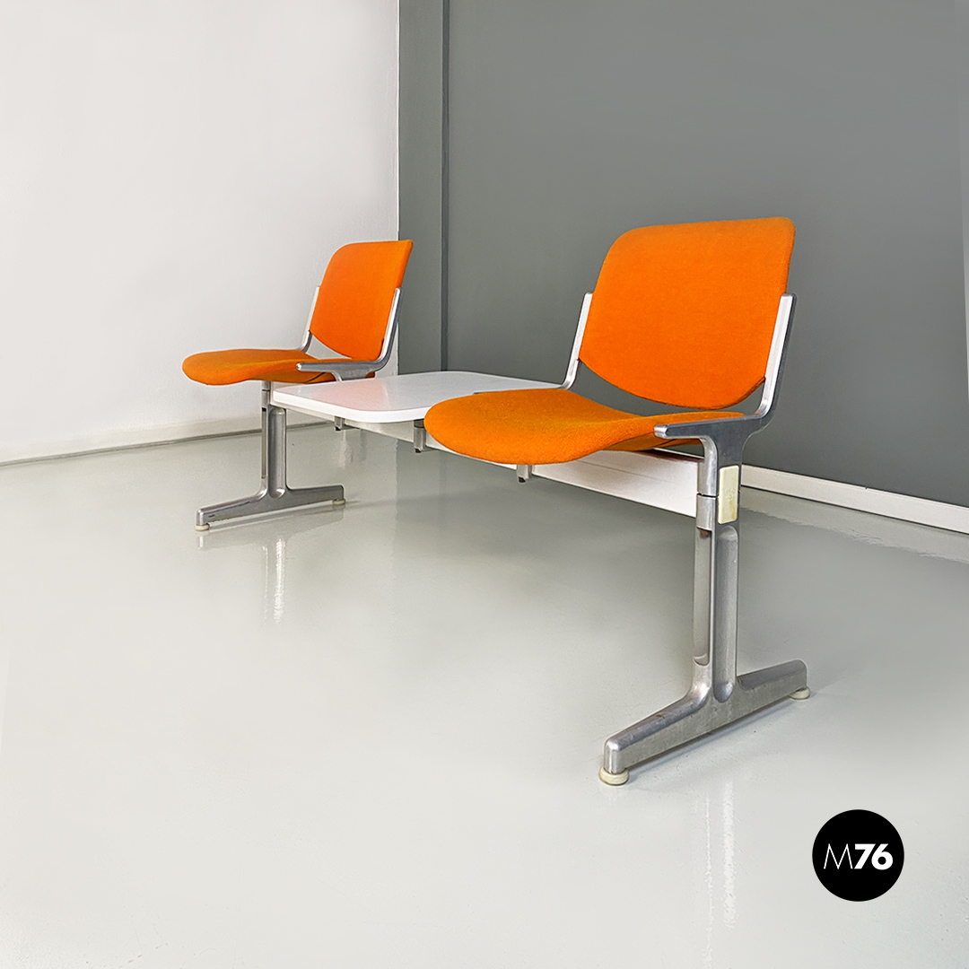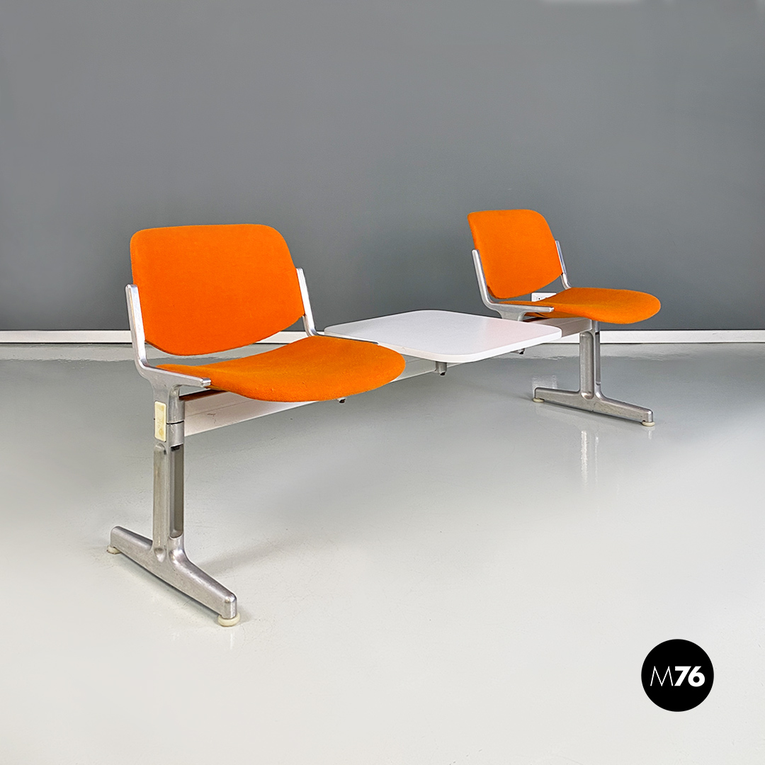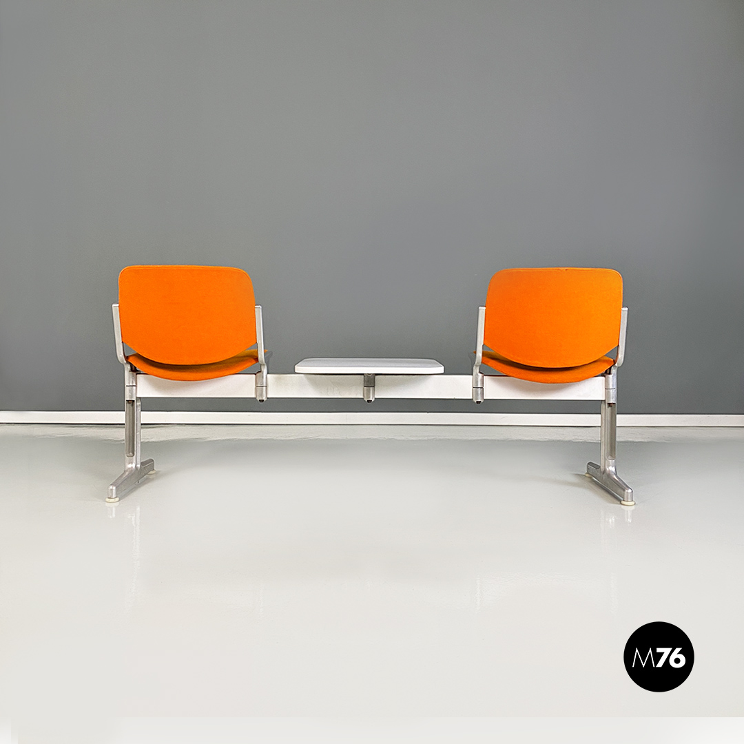 Panca o fila di due sedute con tavolino centrale modello Axis 3000 DS da sala d’attesa. Struttura simmetrica e telaio unico in alluminio cromato e legno bianco con sedute rivestite in cotone arancione originale dell’epoca.