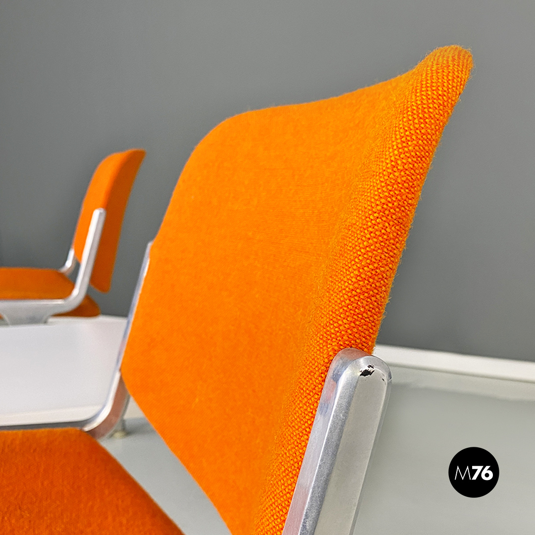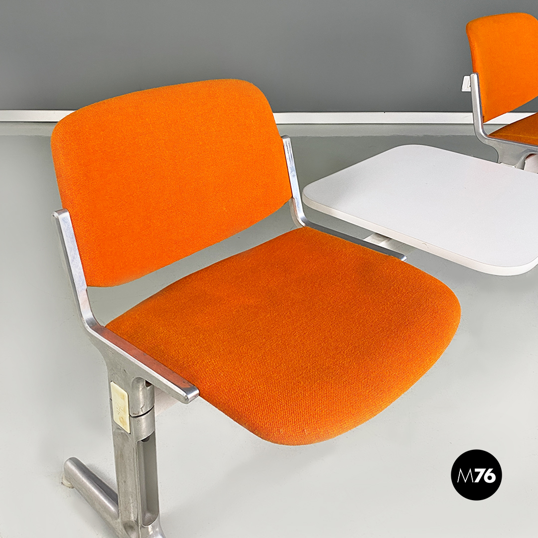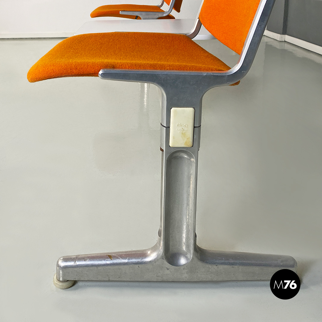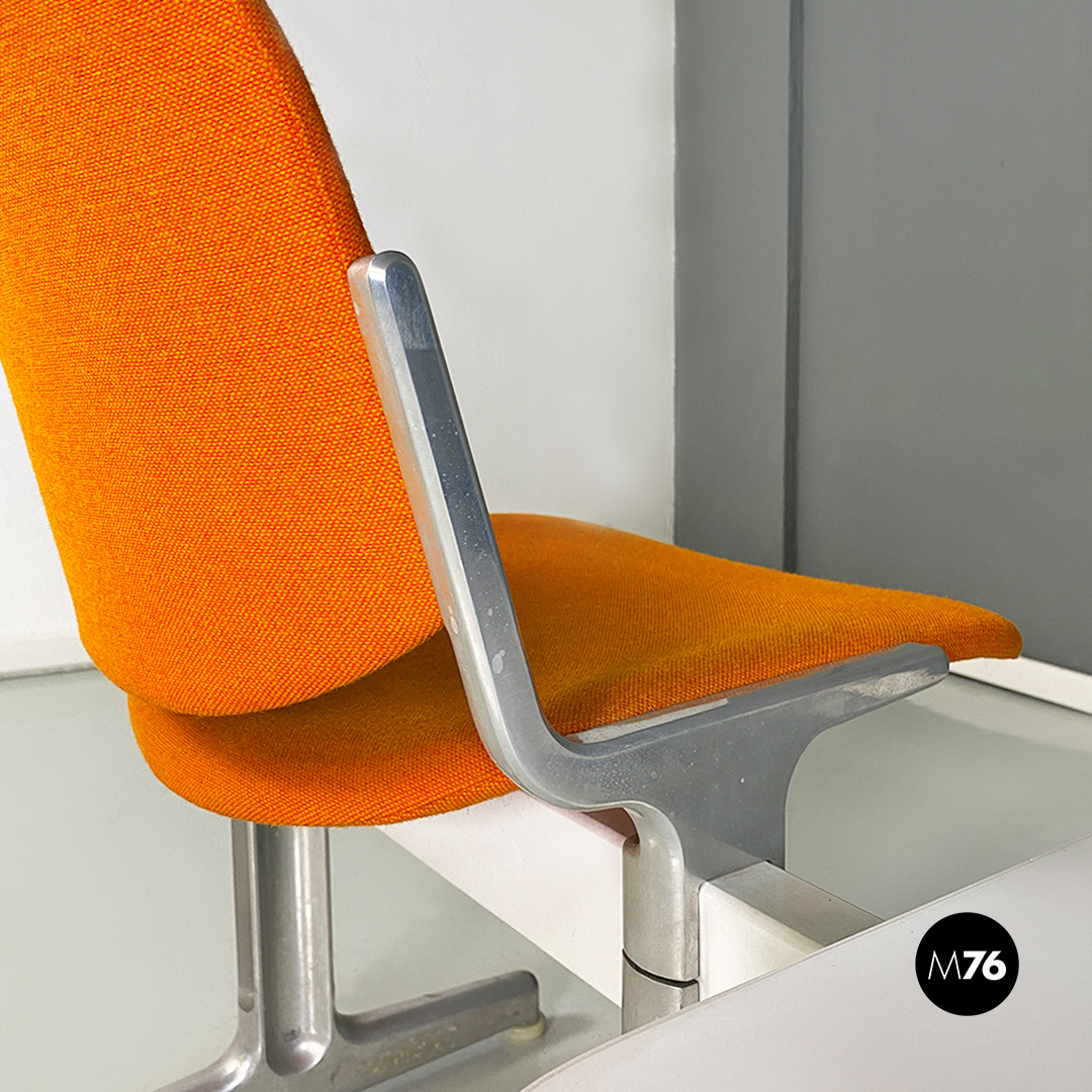 Panca o fila di due sedute con tavolino centrale modello Axis 3000 DS da sala d’attesa. Struttura simmetrica e telaio unico in alluminio cromato e legno bianco con sedute rivestite in cotone arancione originale dell’epoca.
