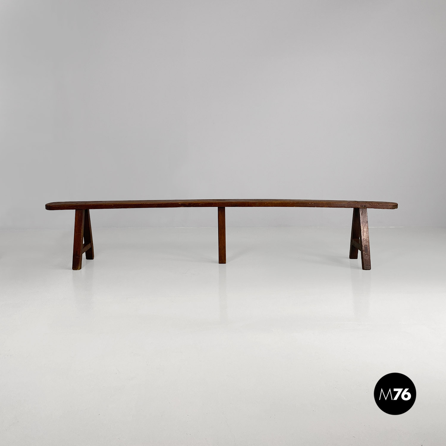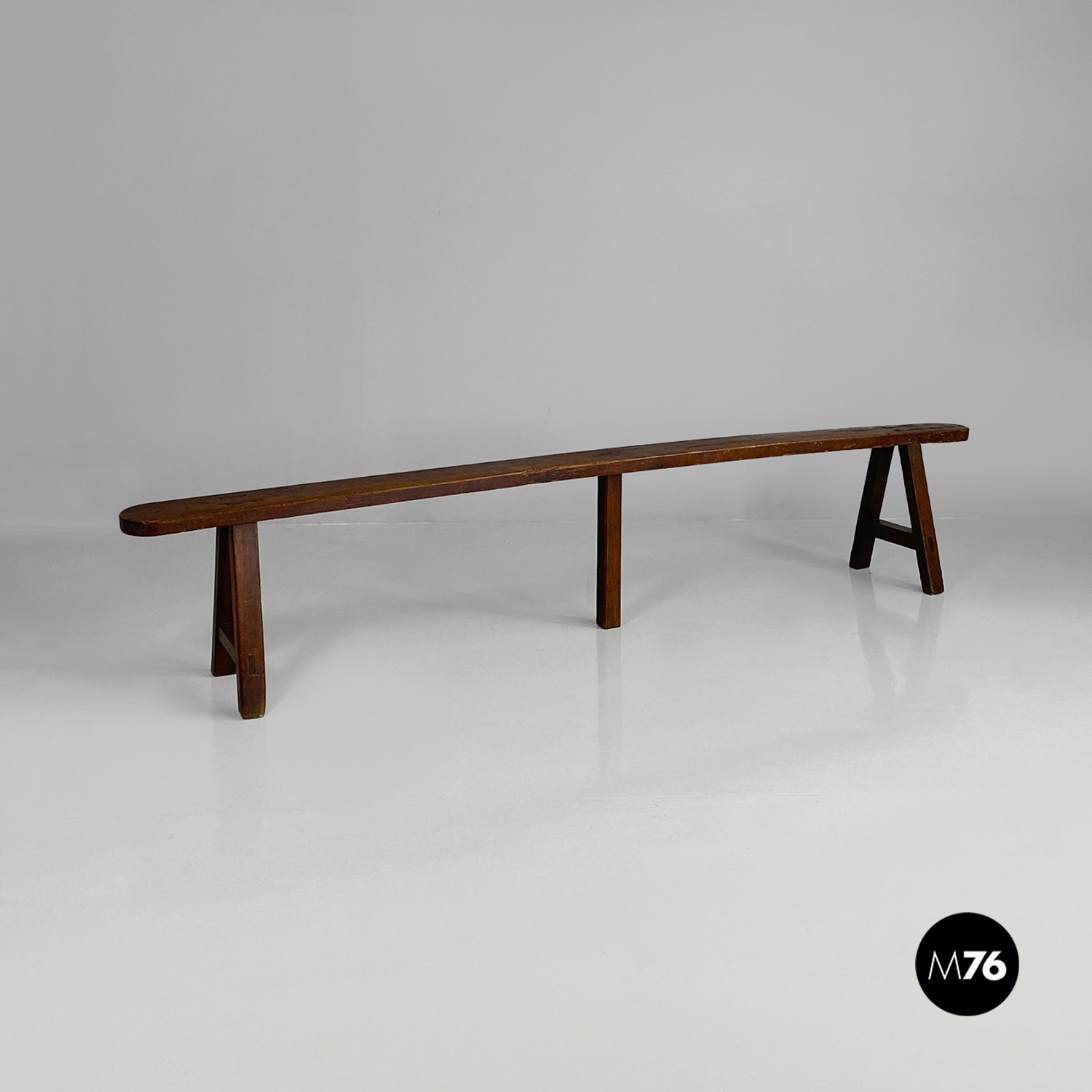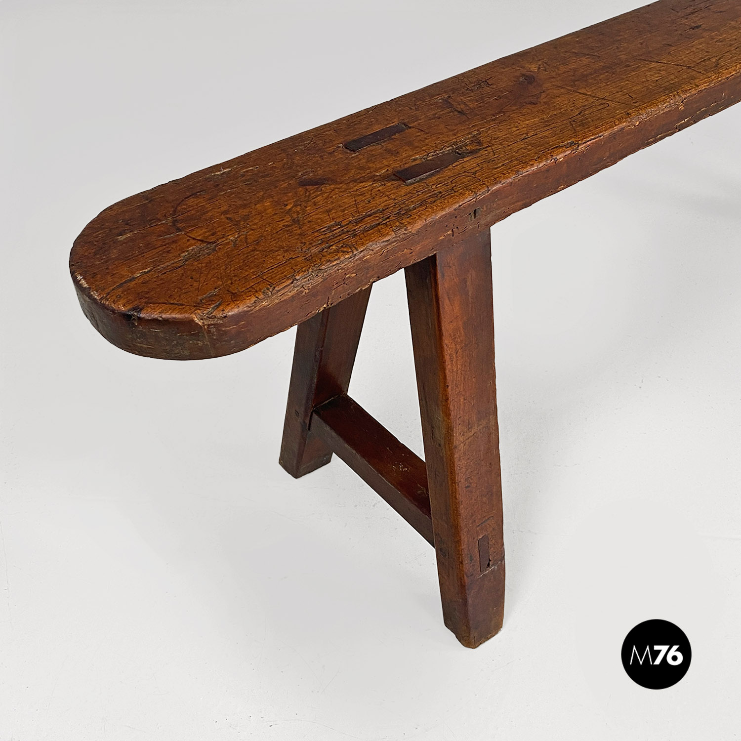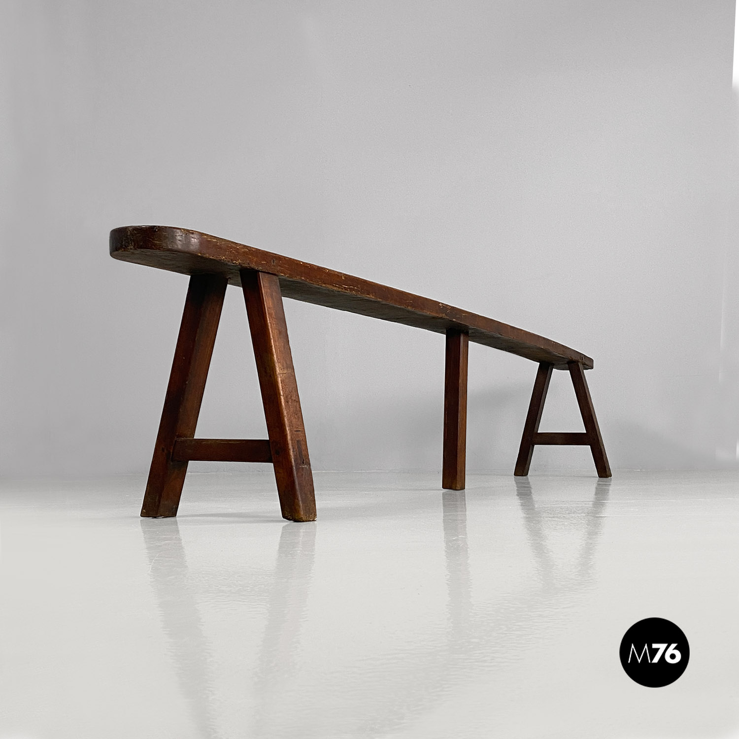 Panca con seduta stretta e lunga con angoli arrotondati interamente in legno massello. Le zampe della panca a sezione quadrata sono posizionate in diagonale congiunte da un listello mentre la centrale è rettangolare e verticale.
