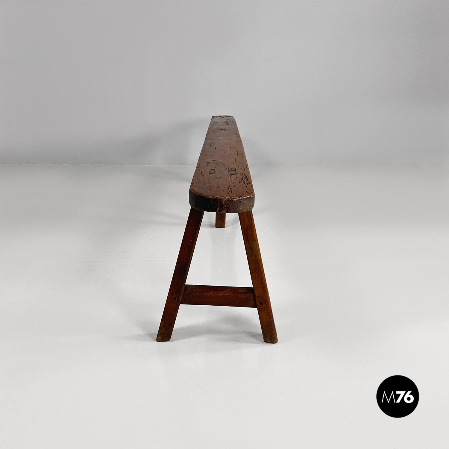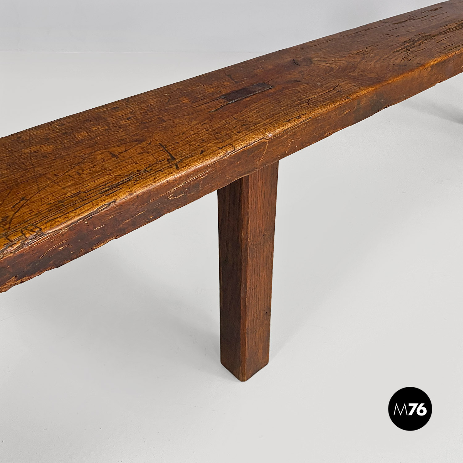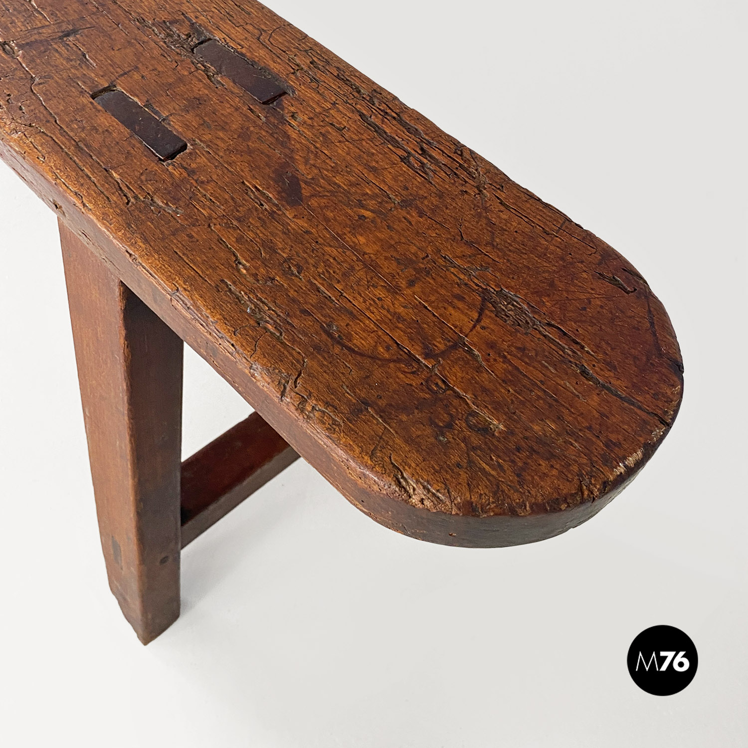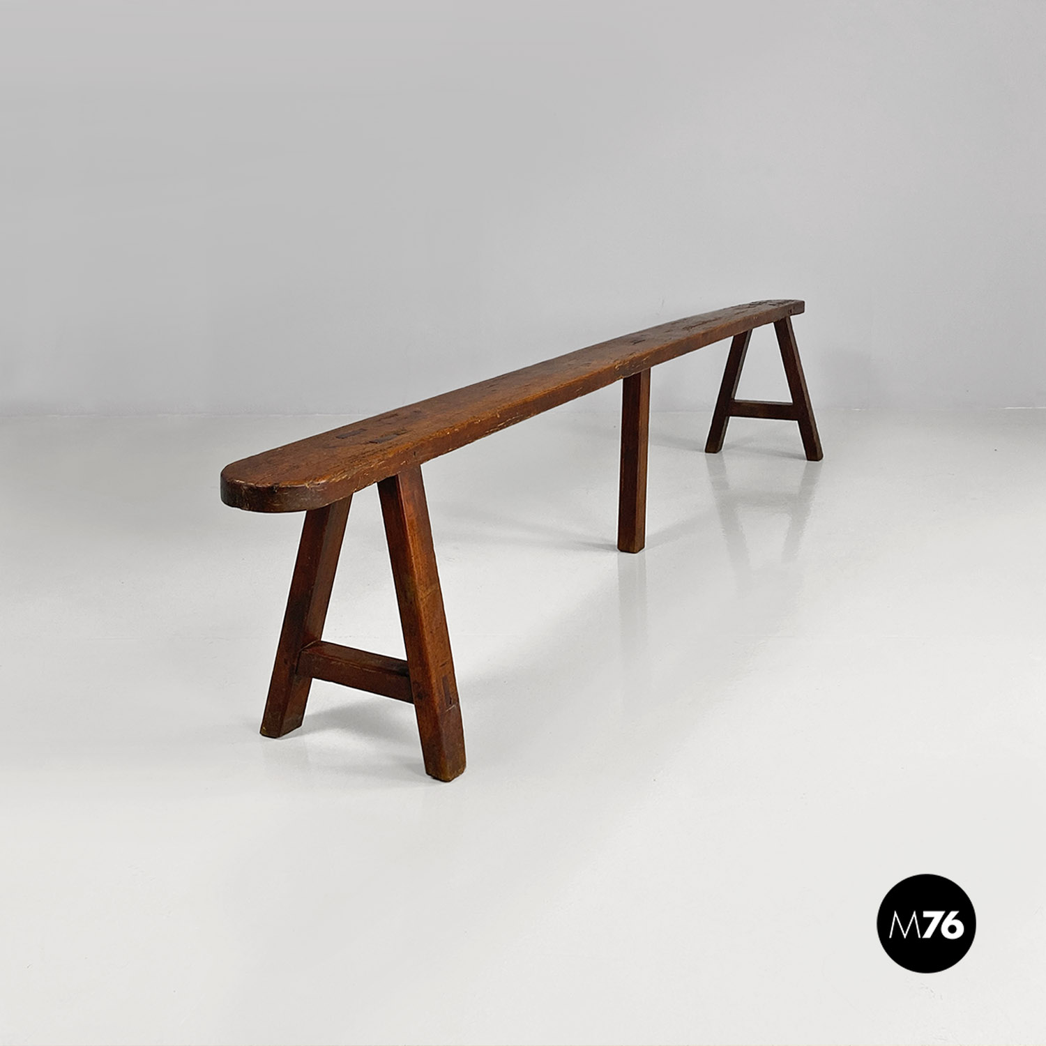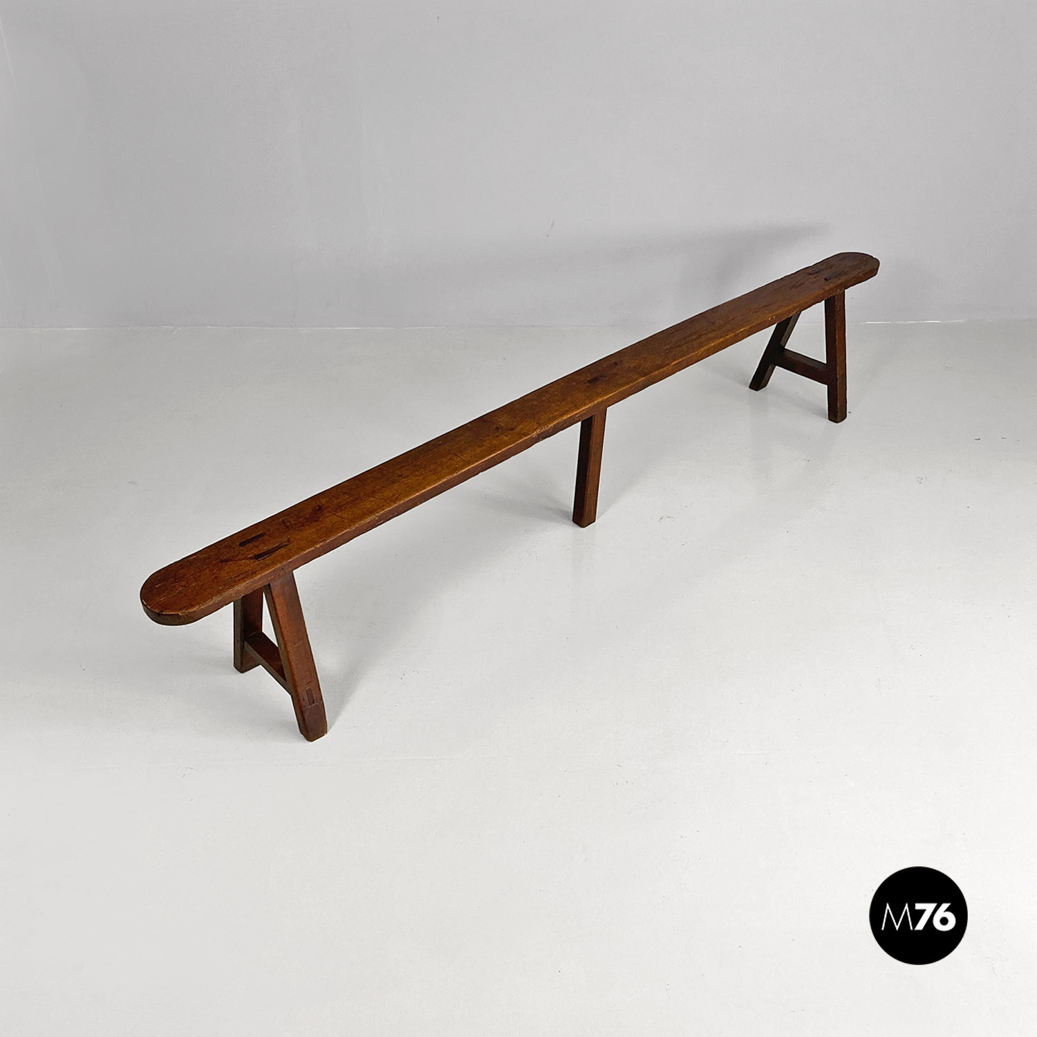 Panca con seduta stretta e lunga con angoli arrotondati interamente in legno massello. Le zampe della panca a sezione quadrata sono posizionate in diagonale congiunte da un listello mentre la centrale è rettangolare e verticale.