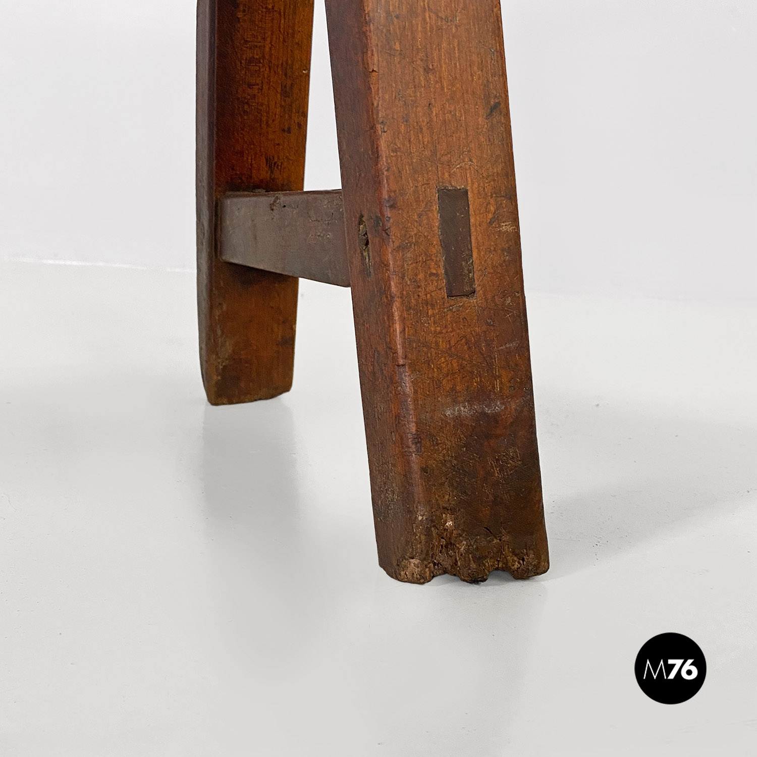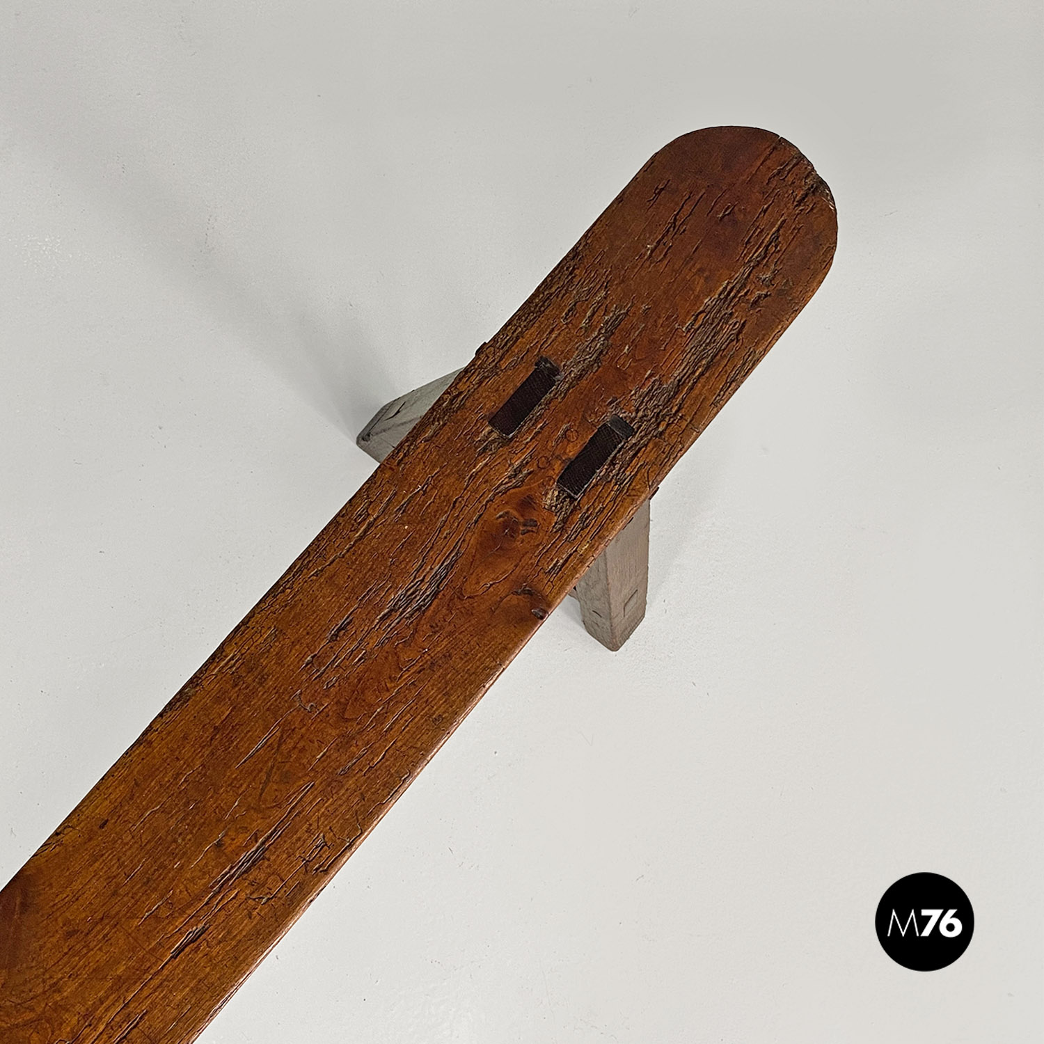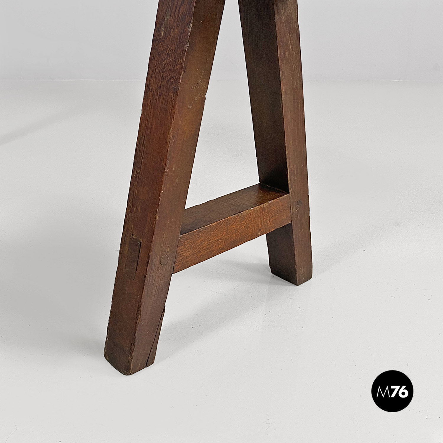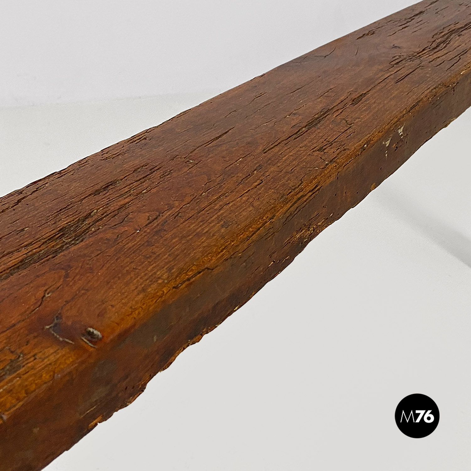 Panca con seduta stretta e lunga con angoli arrotondati interamente in legno massello. Le zampe della panca a sezione quadrata sono posizionate in diagonale congiunte da un listello mentre la centrale è rettangolare e verticale.