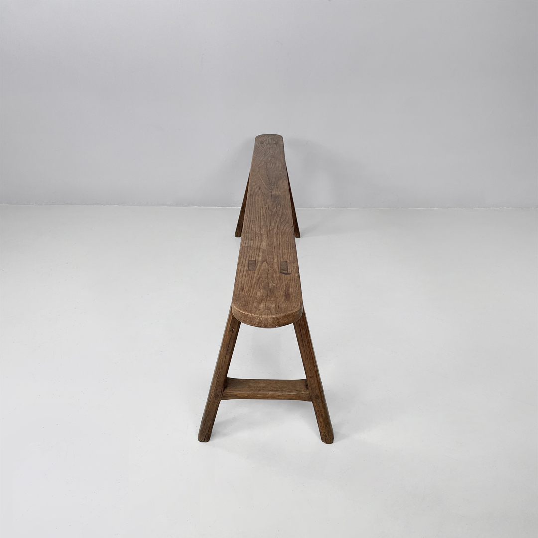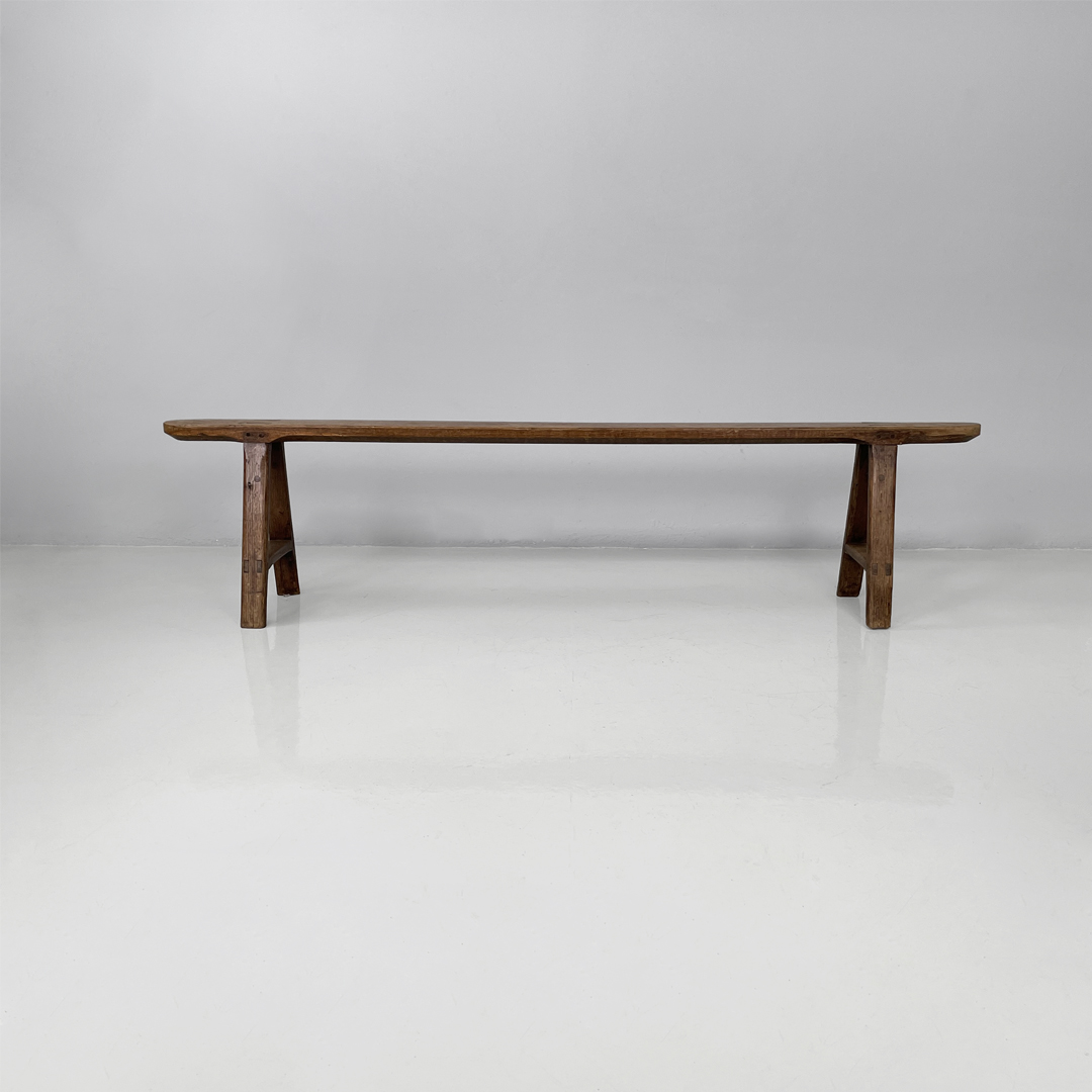 Panca con seduta stretta e lunga con angoli arrotondati, interamente in legno massello. Le zampe della panca a sezione quadrata, sono posizionate in diagonale congiunte da un listello.