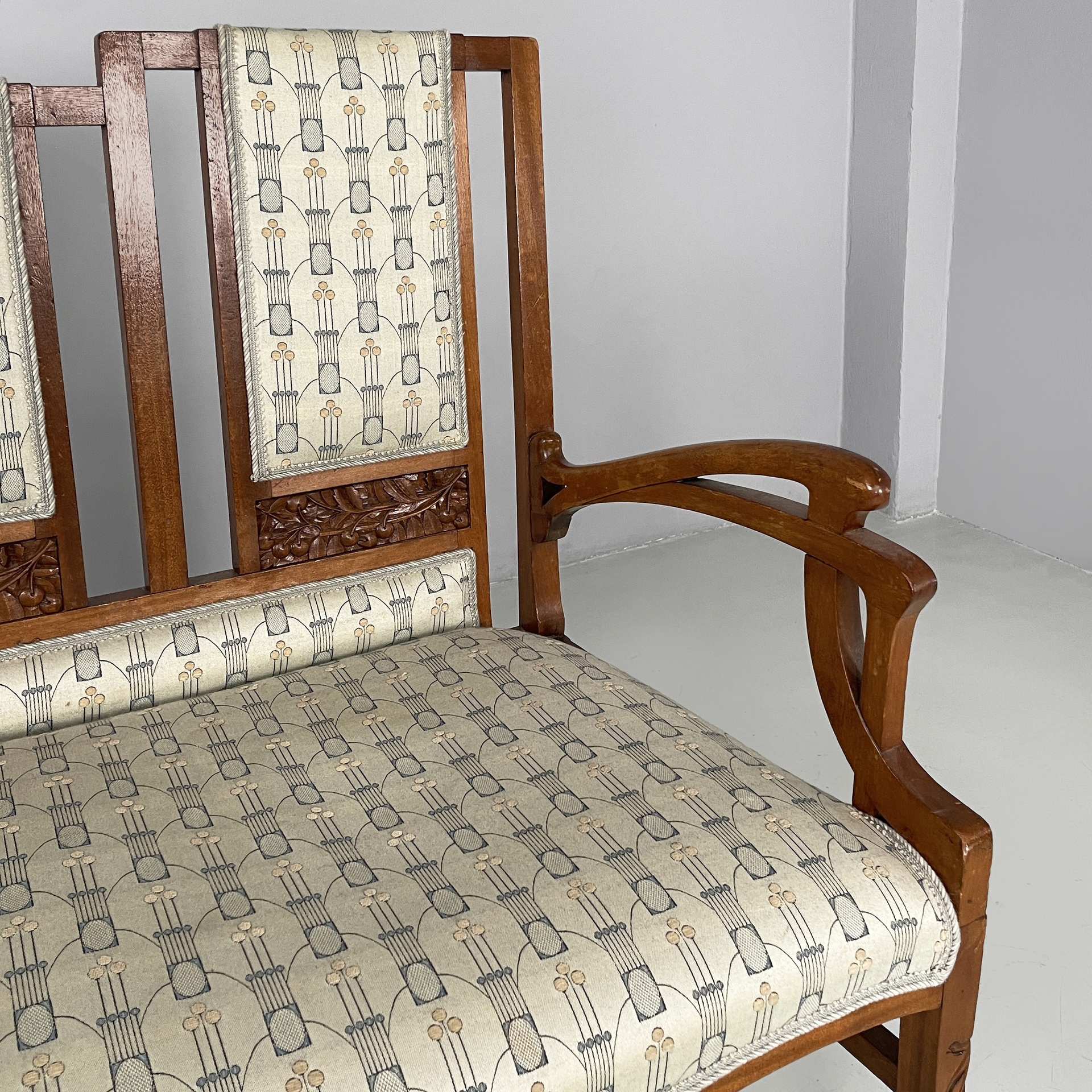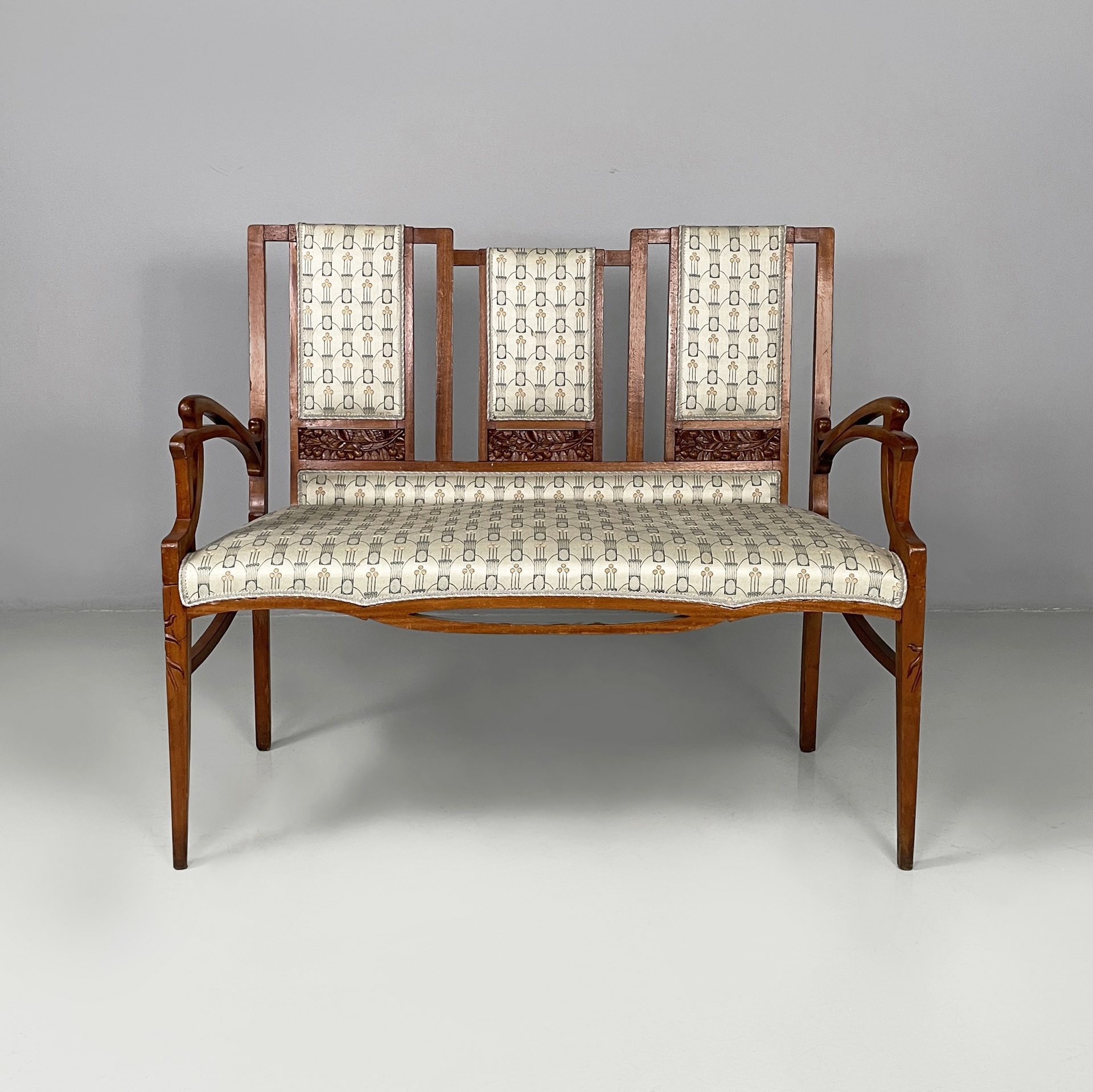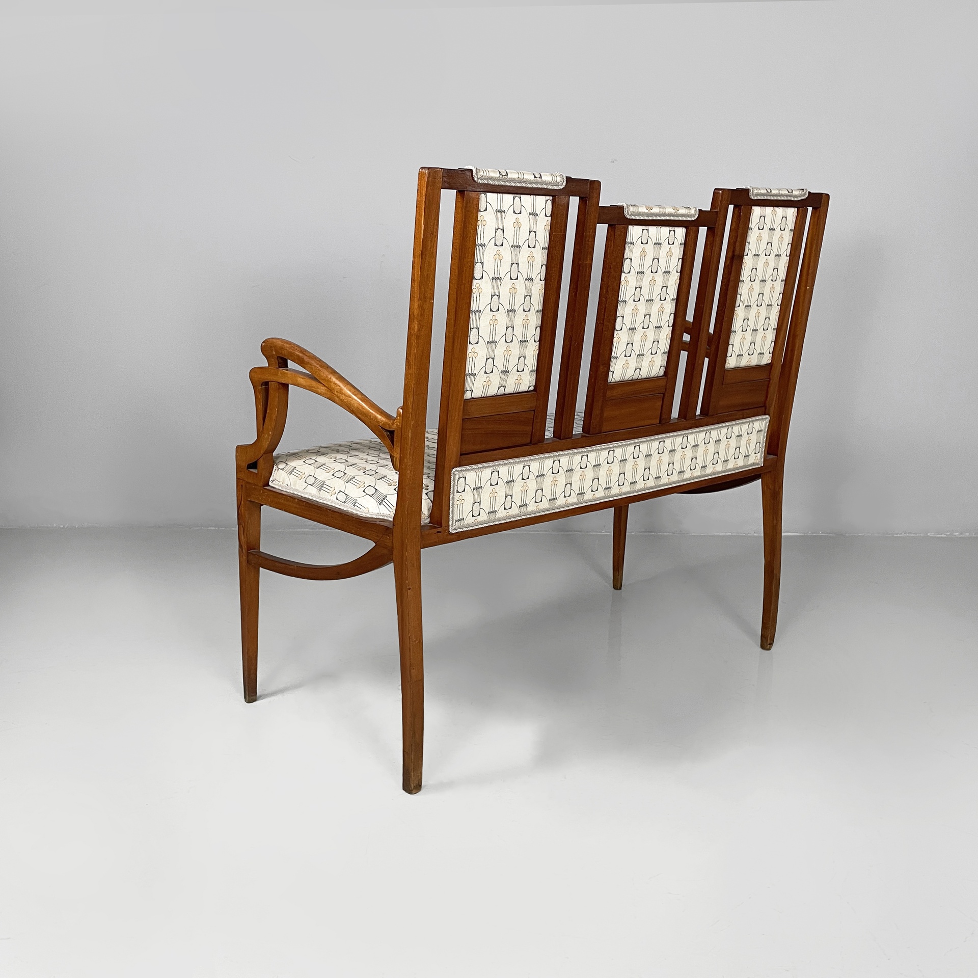Panca con struttura in legno. La seduta rettangolare è imbottita e rivestita in tessuto grigio chiaro con decori beige e blue. Lo schienale è composto da tre parti rettangolari, imbottite e rivestite nello stesso tessuto della seduta, con struttura in legno decorato. I braccioli sono in legno. Sulle zampe a sezione squadrata in legno sono presenti dei decorazioni a forma di foglie. In stile Liberty- Art Nouveau. Utilizzabile con divano.