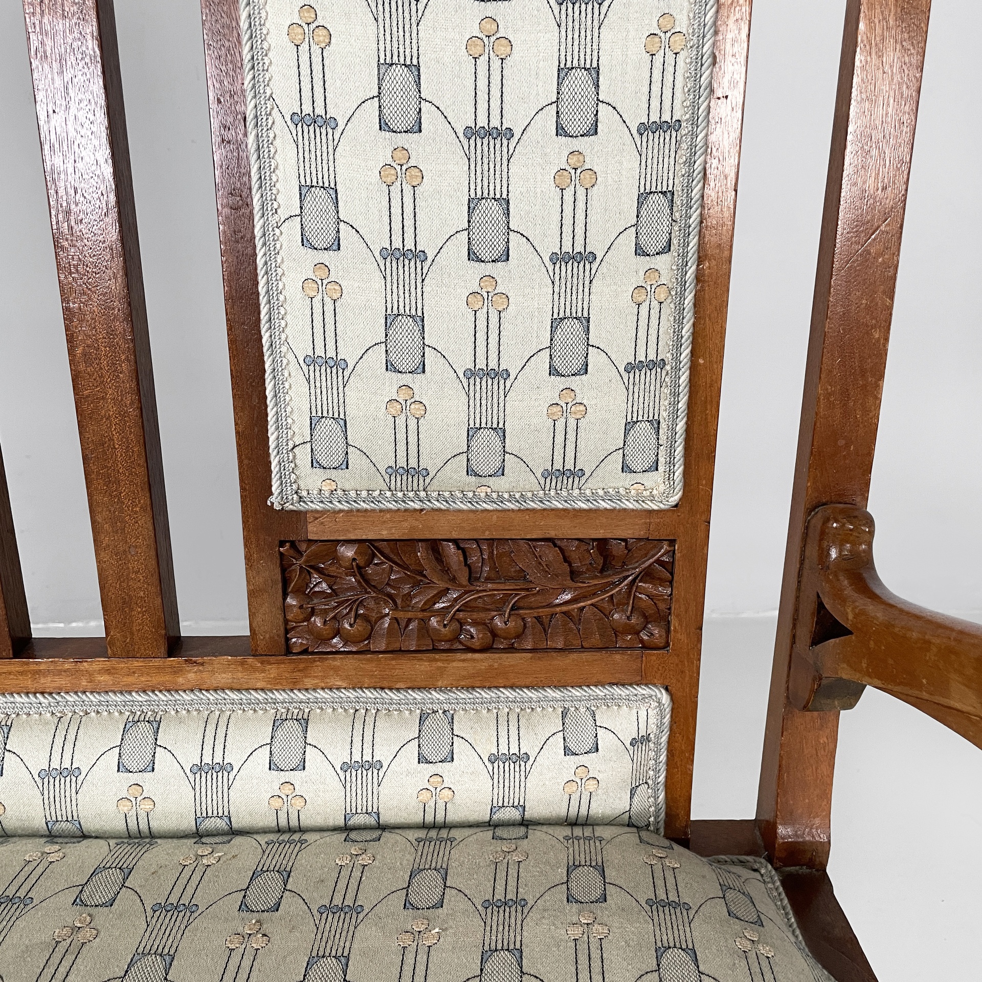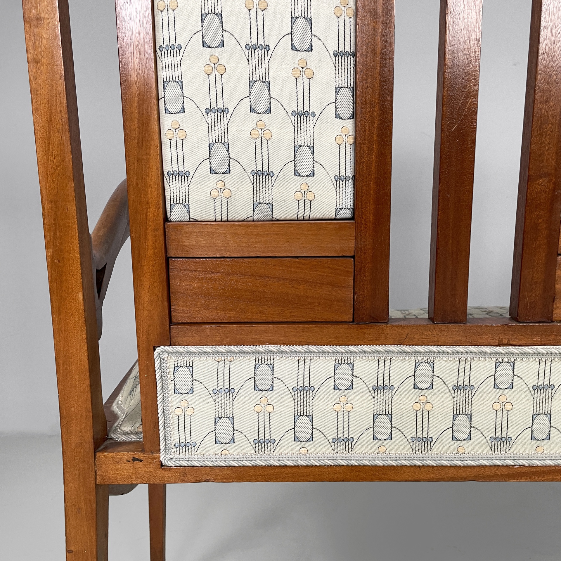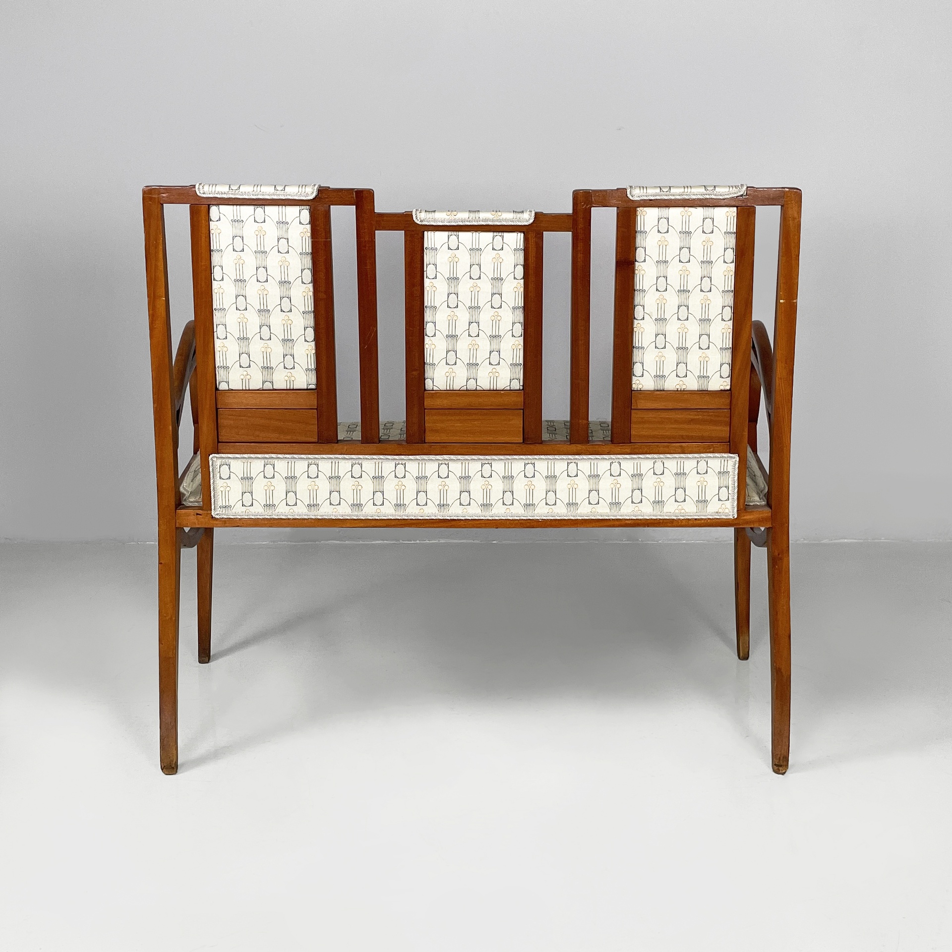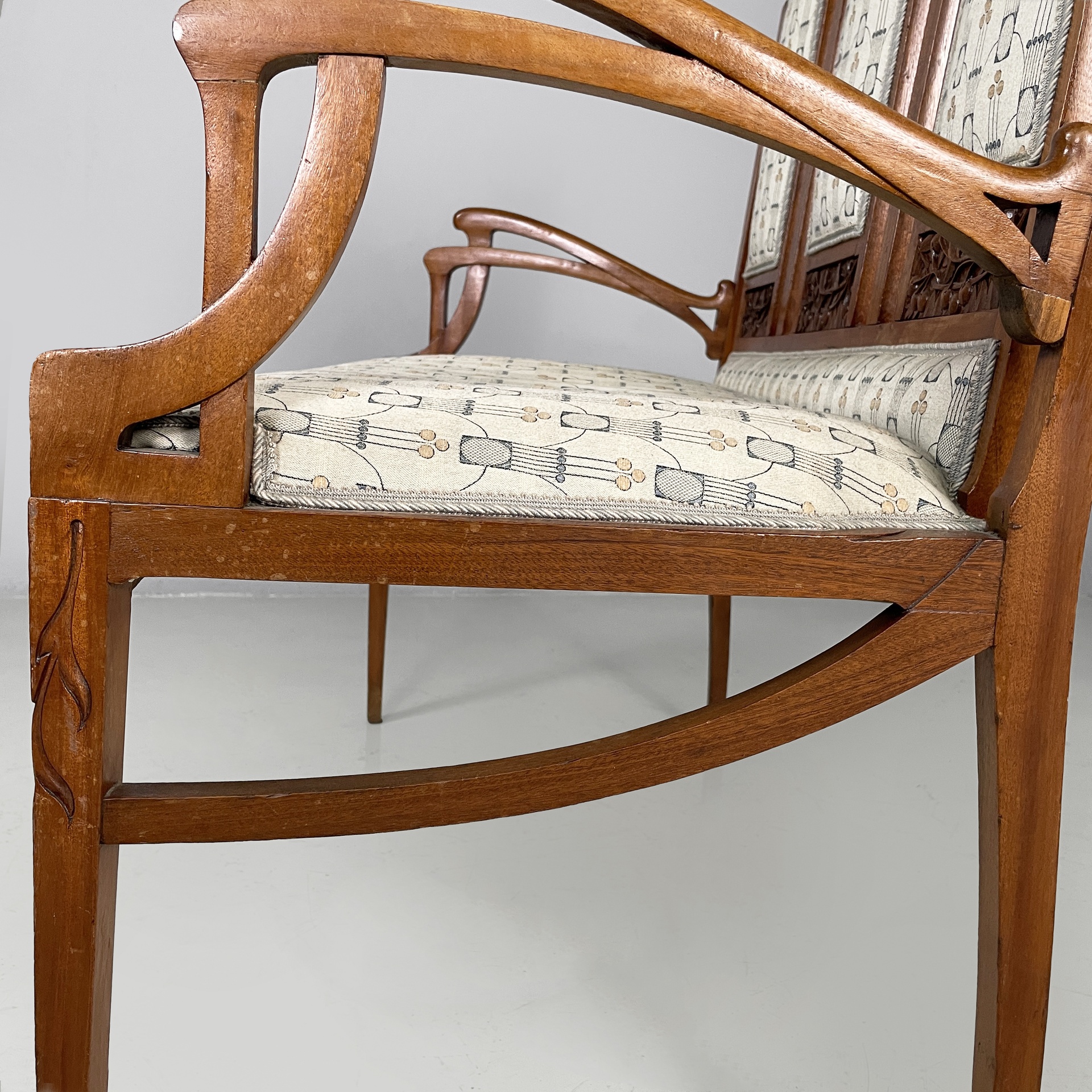 Panca con struttura in legno. La seduta rettangolare è imbottita e rivestita in tessuto grigio chiaro con decori beige e blue. Lo schienale è composto da tre parti rettangolari, imbottite e rivestite nello stesso tessuto della seduta, con struttura in legno decorato. I braccioli sono in legno. Sulle zampe a sezione squadrata in legno sono presenti dei decorazioni a forma di foglie. In stile Liberty- Art Nouveau. Utilizzabile con divano.