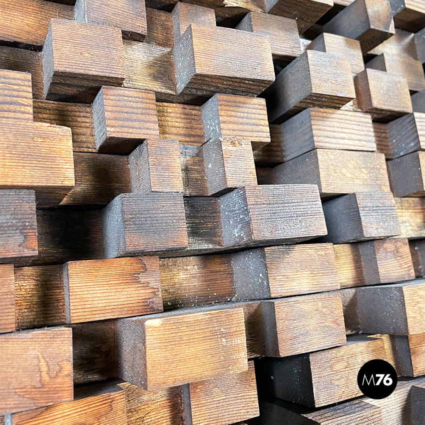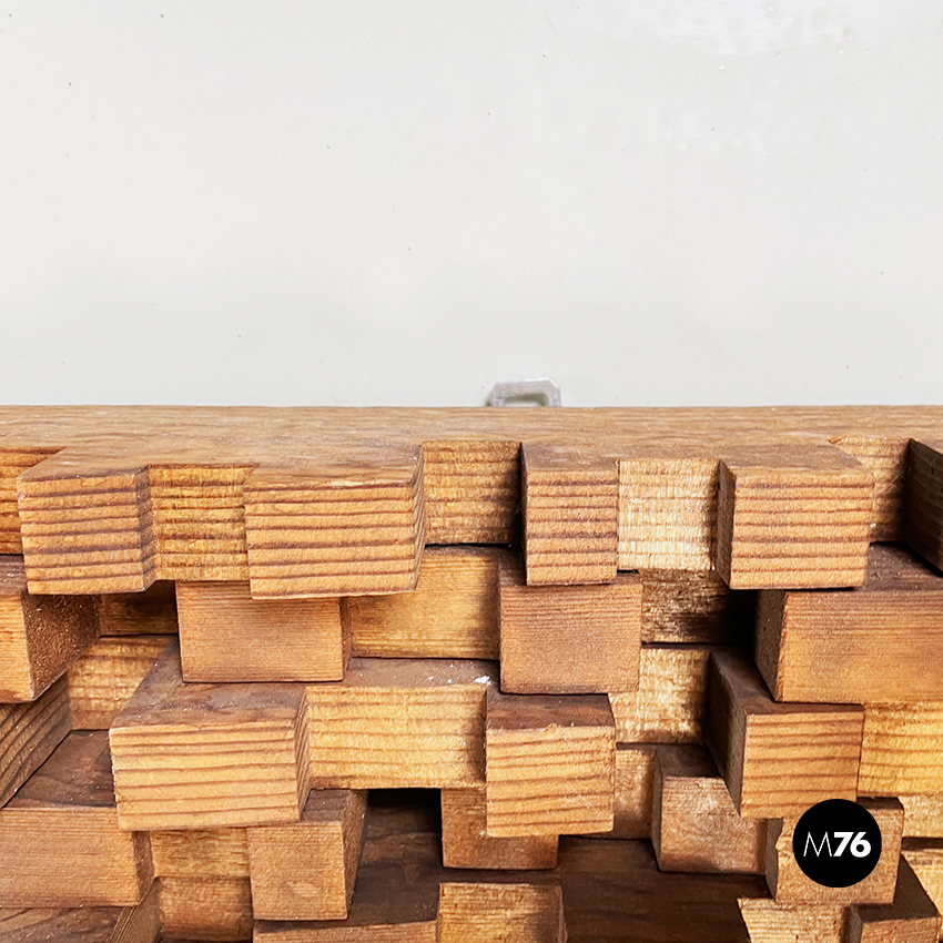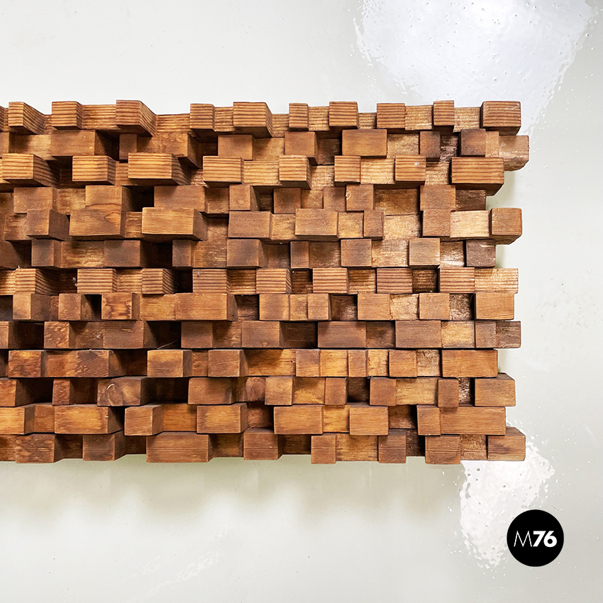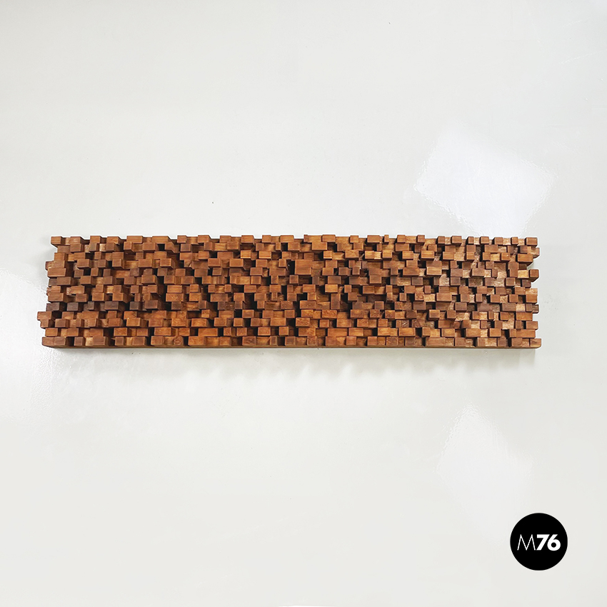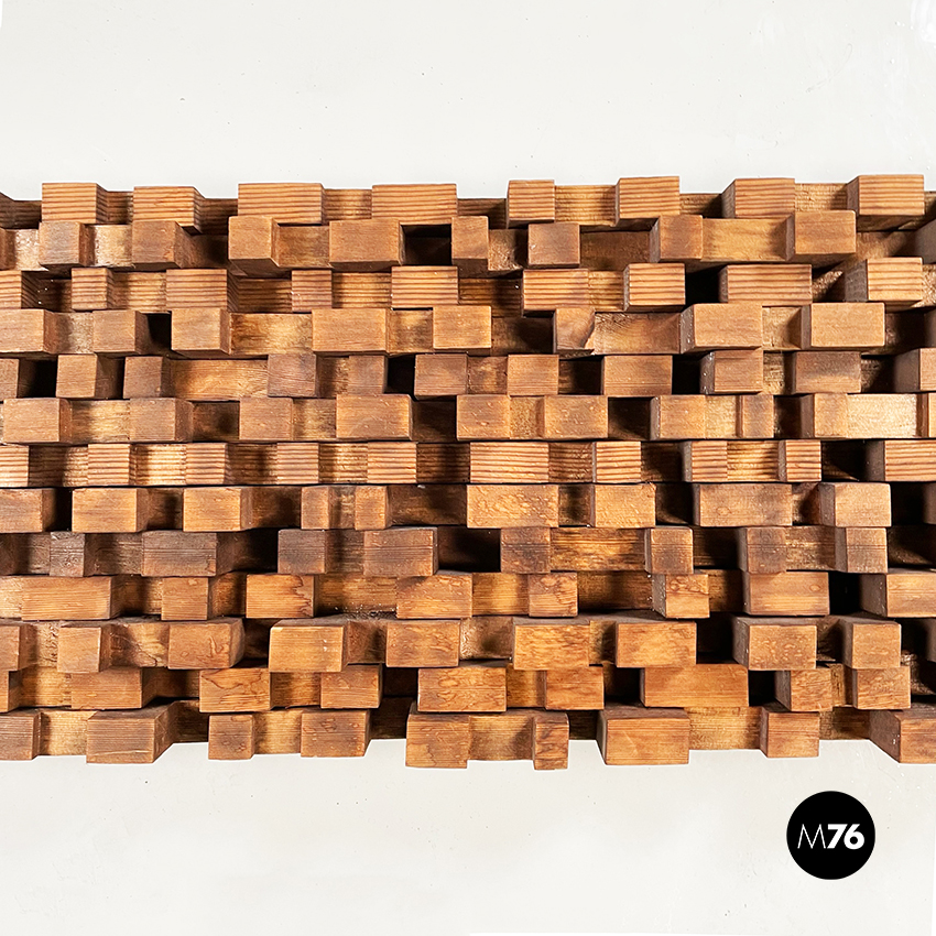 Pannello decorativo in legno massello utilizzabile da parete o in verticale appoggiato a terra. La decorazione è composta da una serie di parallelepipedi in legno di diversa dimensione creando un motivo che tende ad essere più basso ai lati è più alto nel mezzo. Ganci presenti sul lato lungo.