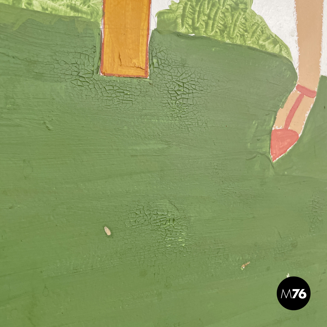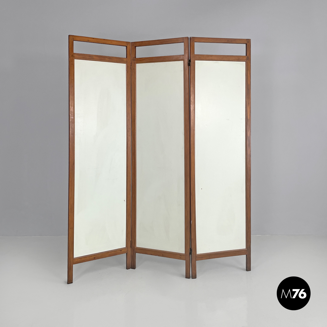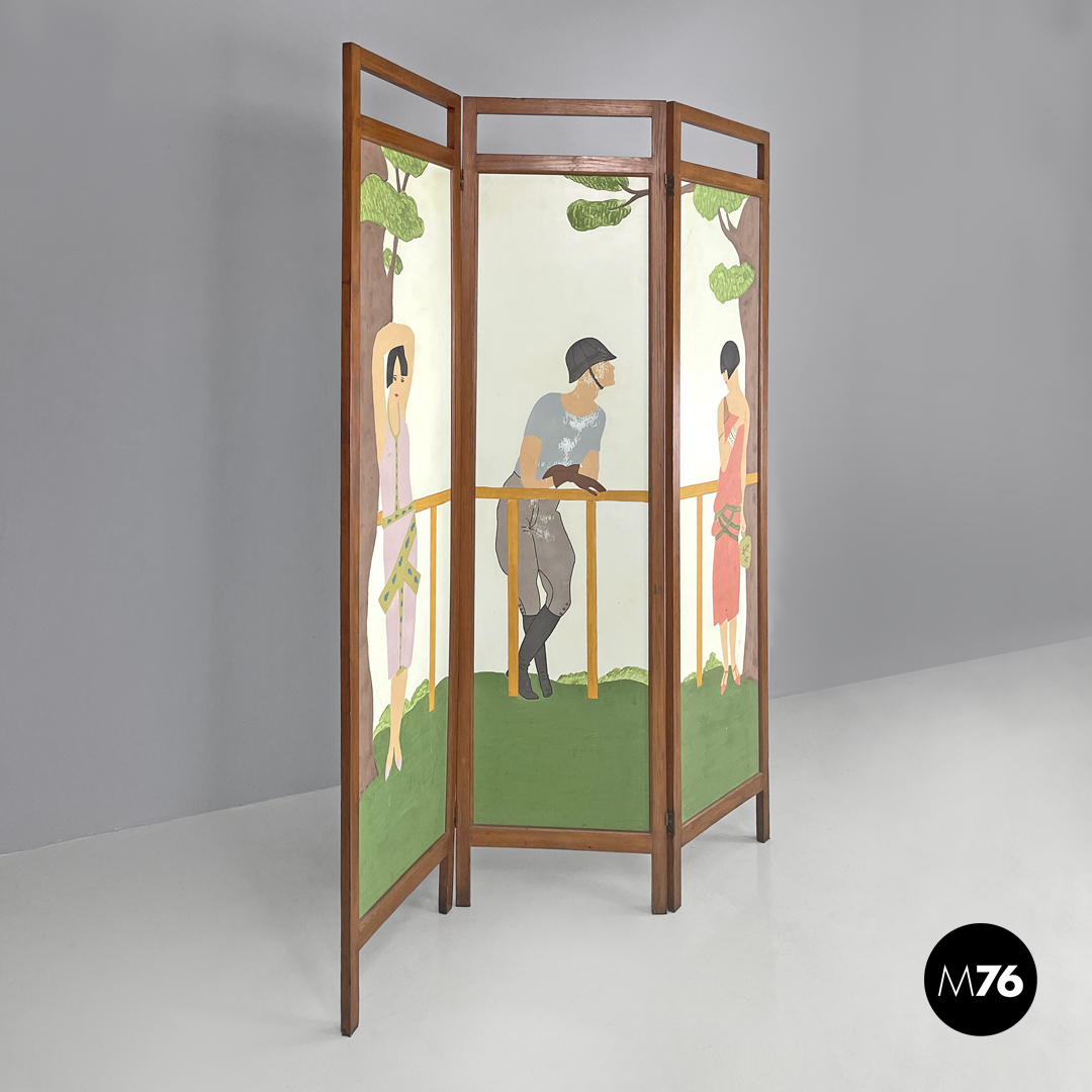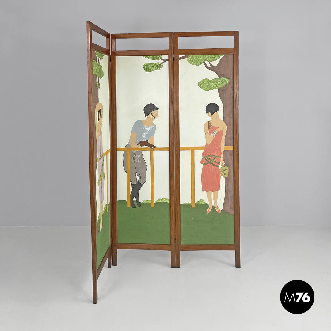 Paravento pieghevole con struttura in legno composto da tre pannelli orientabili a piacimento. Il separè ha una struttura a sezione rettangolare i tre pannelli dipinti presentano due figure femminili e una centrale maschile che sono intorno ad uno steccato in una scena all’aperto. Il retro dei pannelli è bianco.