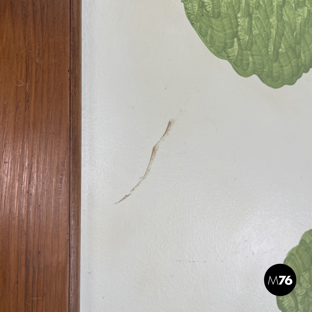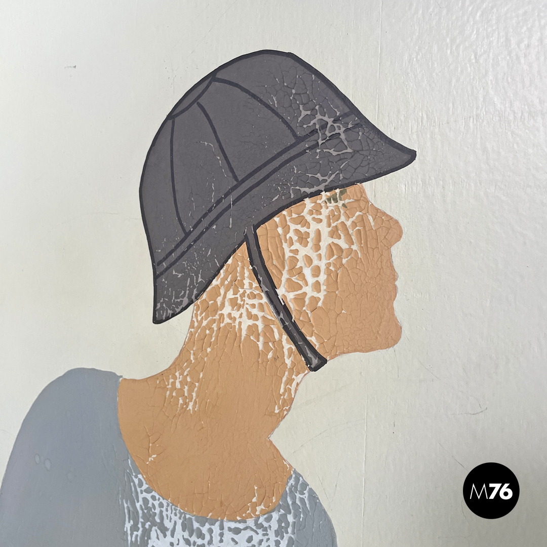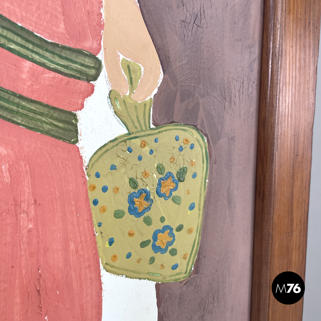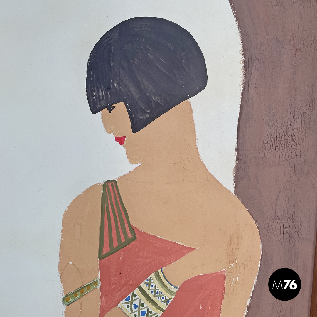 Paravento pieghevole con struttura in legno composto da tre pannelli orientabili a piacimento. Il separè ha una struttura a sezione rettangolare i tre pannelli dipinti presentano due figure femminili e una centrale maschile che sono intorno ad uno steccato in una scena all’aperto. Il retro dei pannelli è bianco.