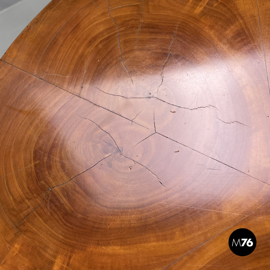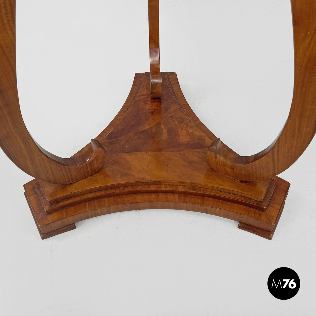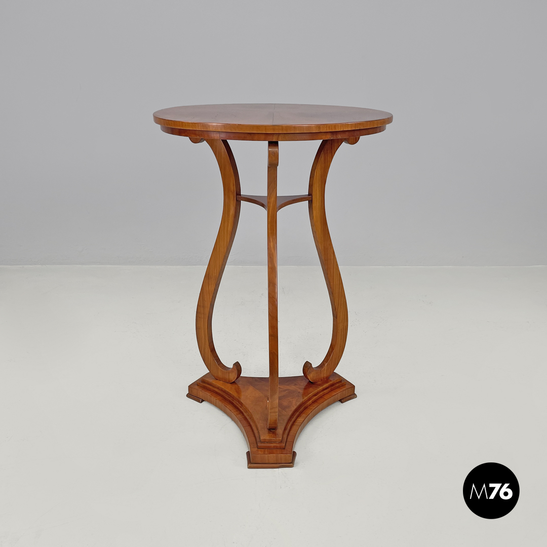 Coppia di piedistalli tondi in legno. Il piano presenta sei linee geometriche che si incrociano nel centro. Le gambe a sezione rettangolare sono curve e tondeggianti all’appoggio al tavolo e alla base formano un ricciolo. Sotto al piano di trova una piccola mensola triangolare curvata che segue le stesse linee della base. Utilizzabili come tavoli da caffè colonnine o espositori.In stile Biedermeier.