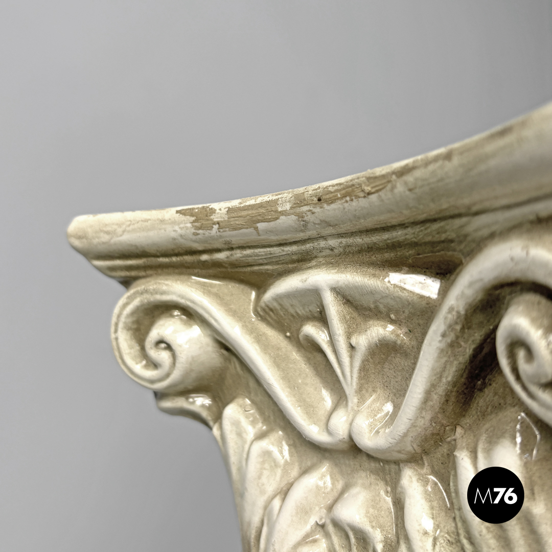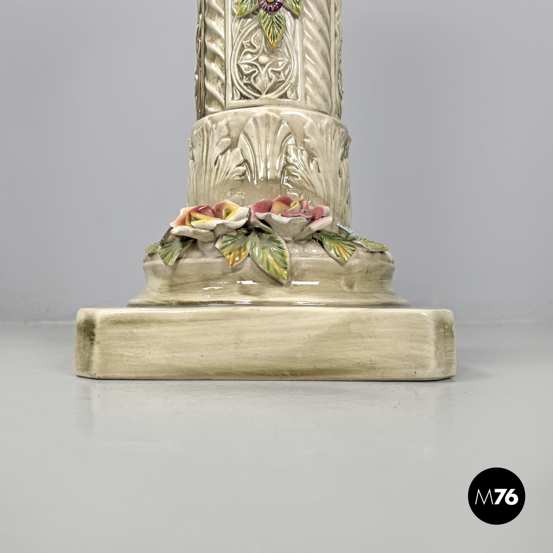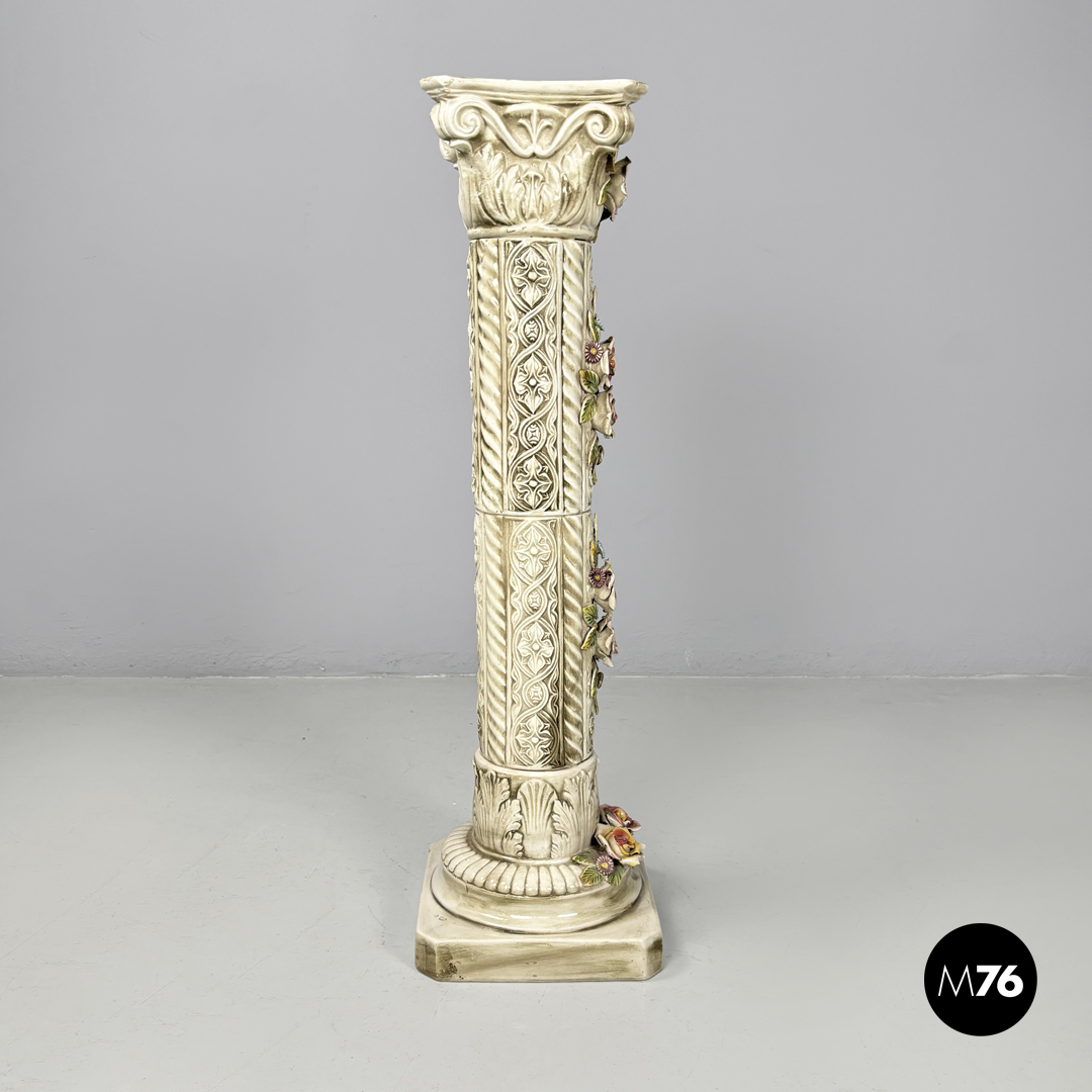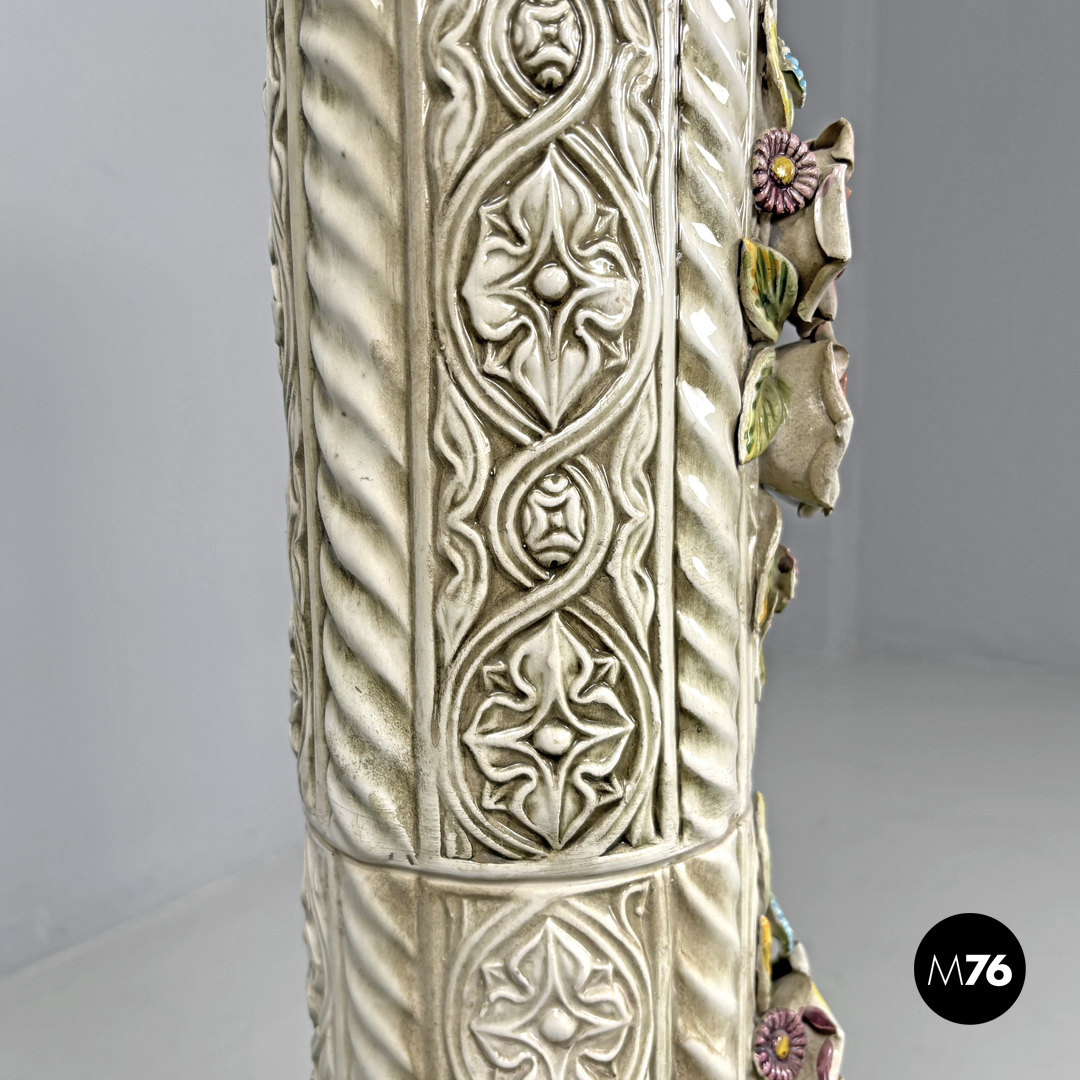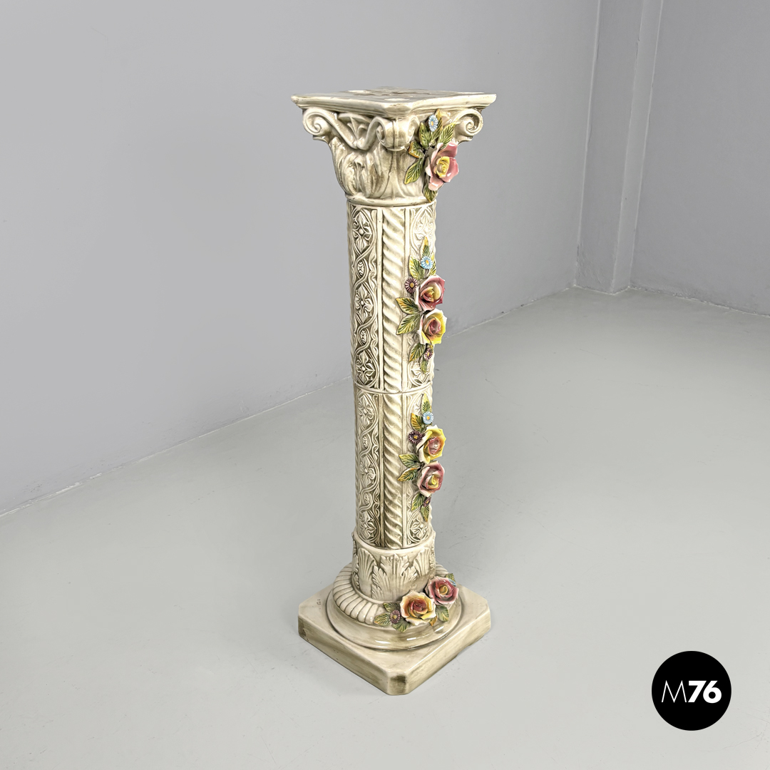Colonna o piedistallo in ceramica a base quadrata in ceramica smaltata bianca con sfumature marroni. Sono presenti su tutta la struttura decorazioni in rilievo che ricordano l’arte medievale su quattro punti si trovano dei fiori realistici in rilevo di colore giallo cele ste e rosa con foglie verdi.