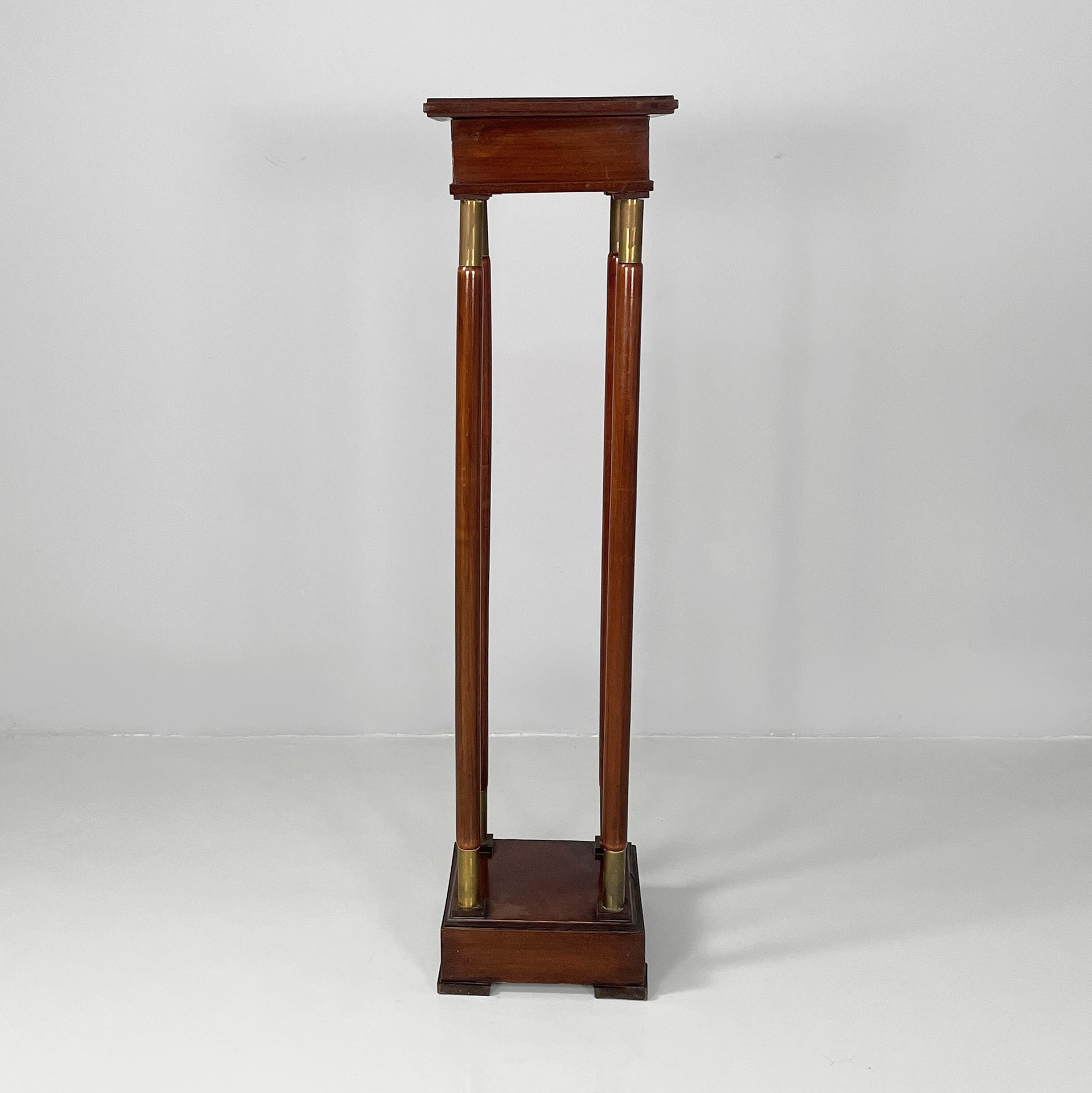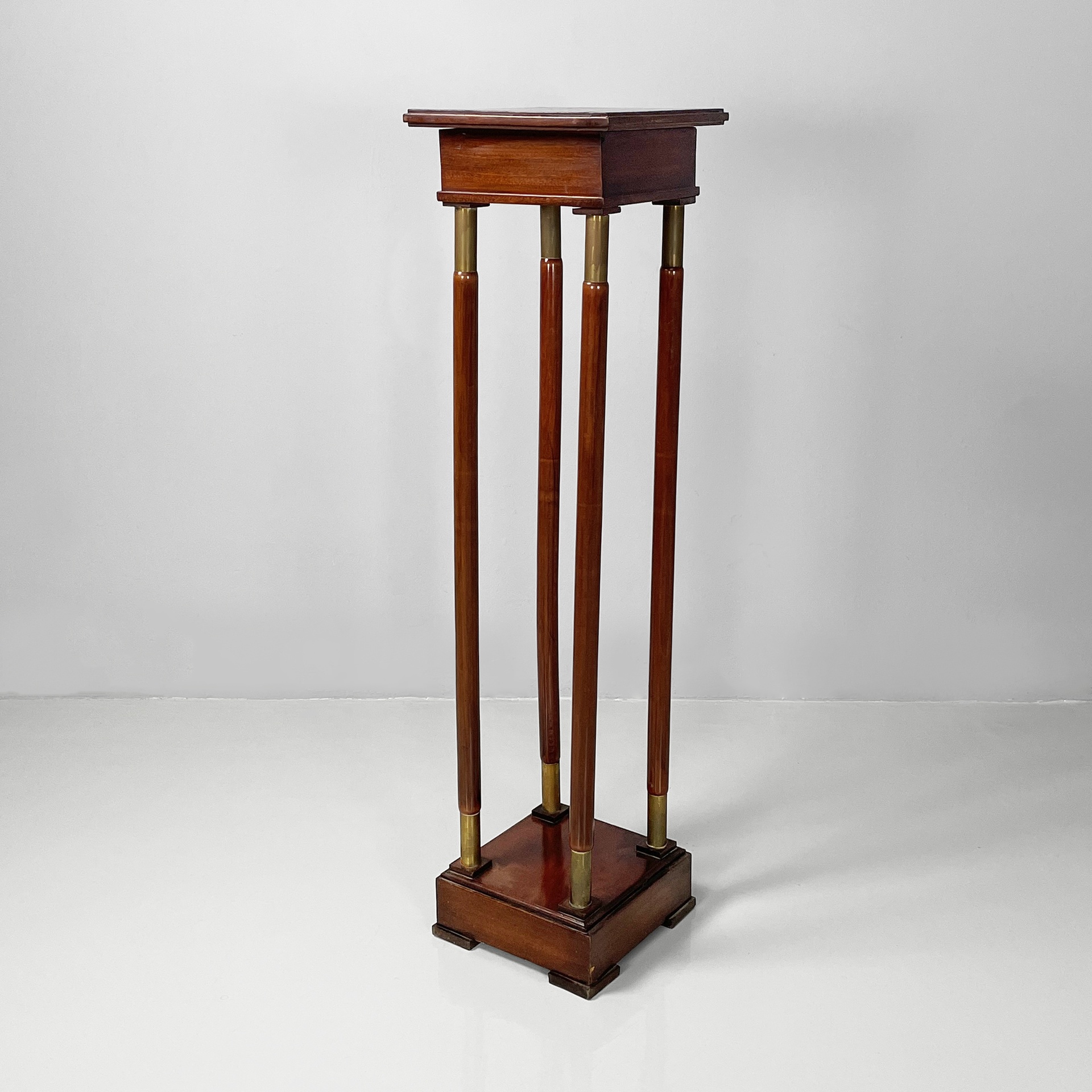 Piedistallo o colonna espositore con piano quadrato in legno. Il piano è sostenuto da quattro listelli a sezione tonda in legno con finiture in ottone agli estremi. Base quadrata in legno con piedini squadrati. Stile Impero.
