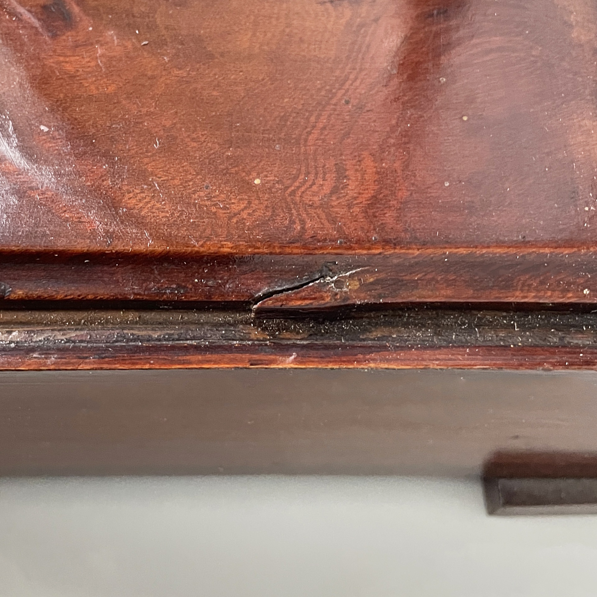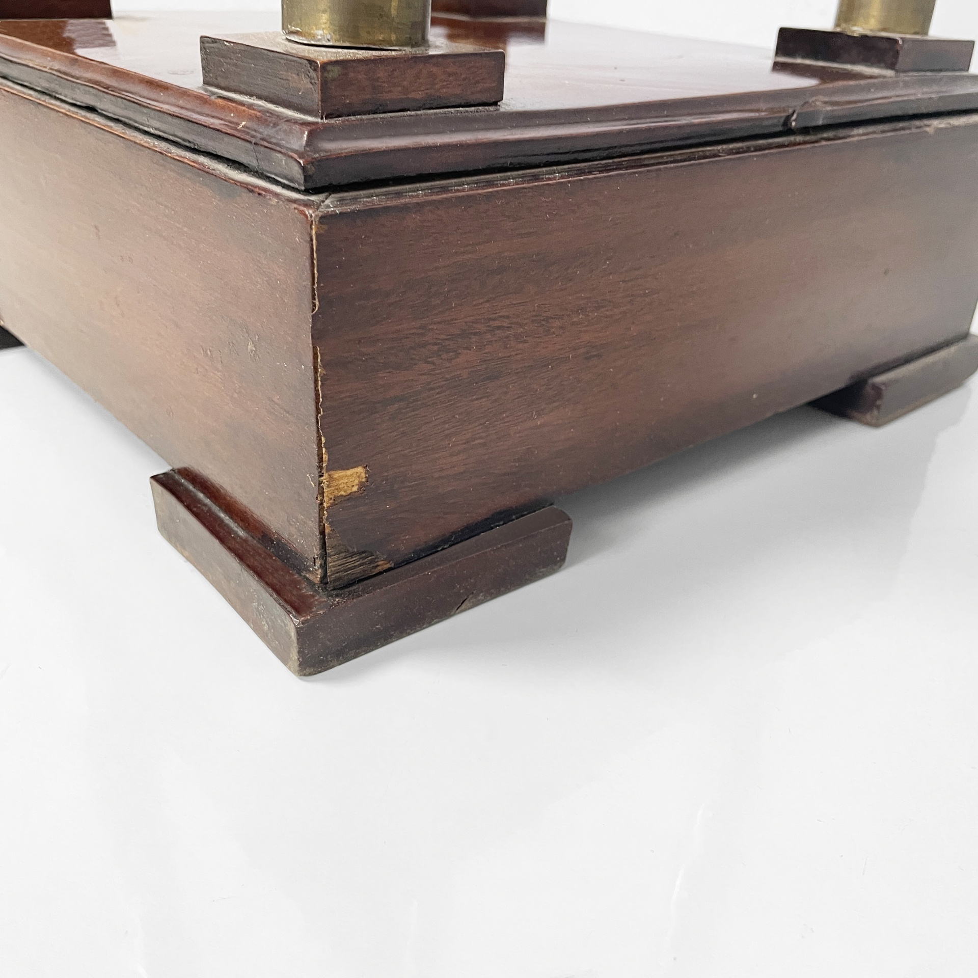 Buone condizioni. Segni sparsi e piccole mancanze sul legno date dal tempo. Ottone in patina.