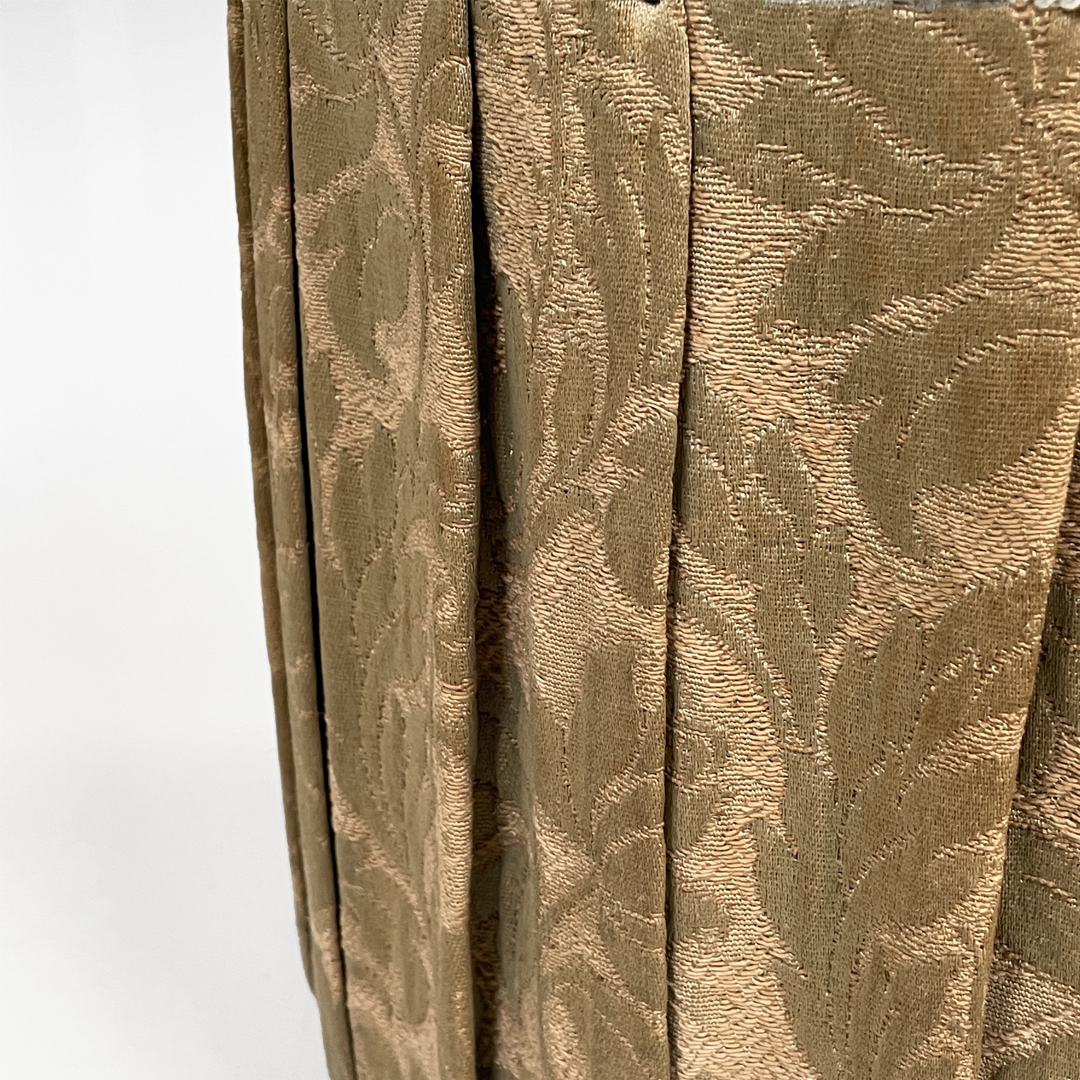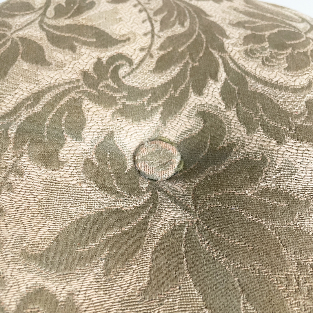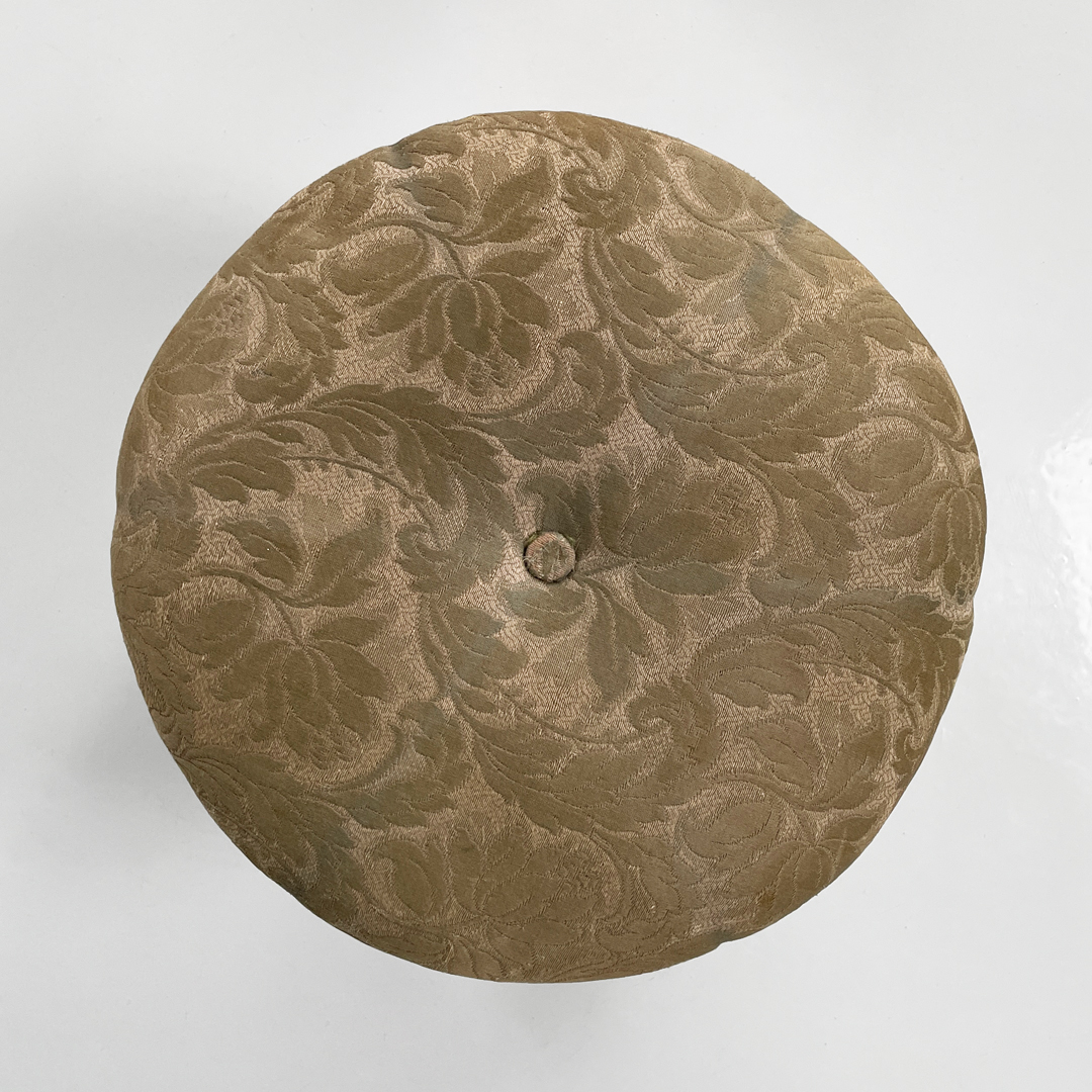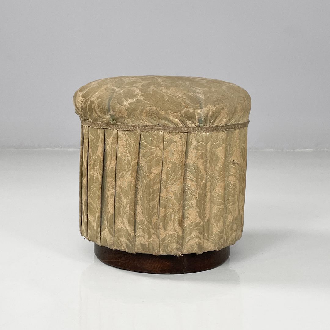 Pouf a base tonda in tessuto e legno. La seduta è imbottita e rivestita con tessuto a sfondo beige con decorazione floreale stilizzata.