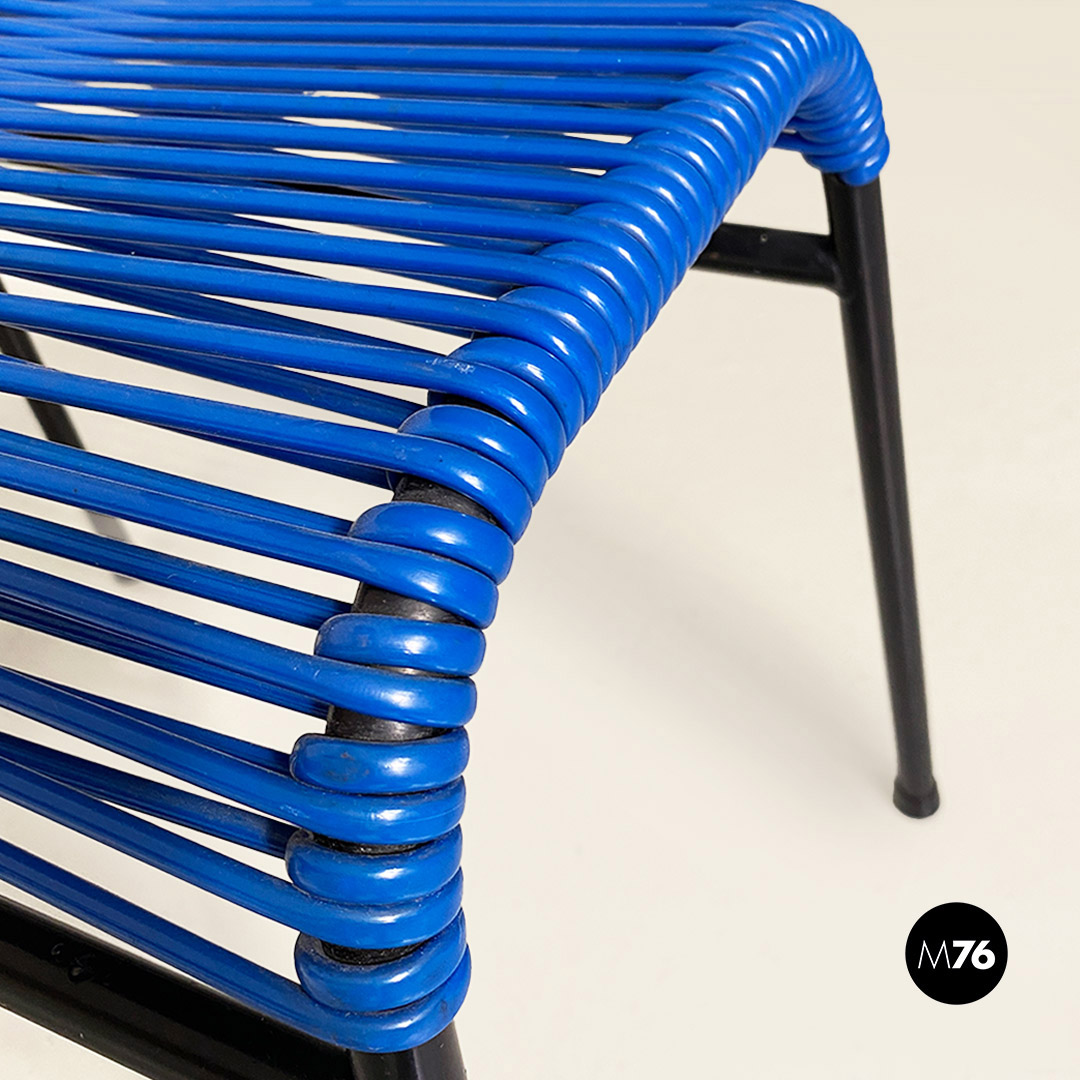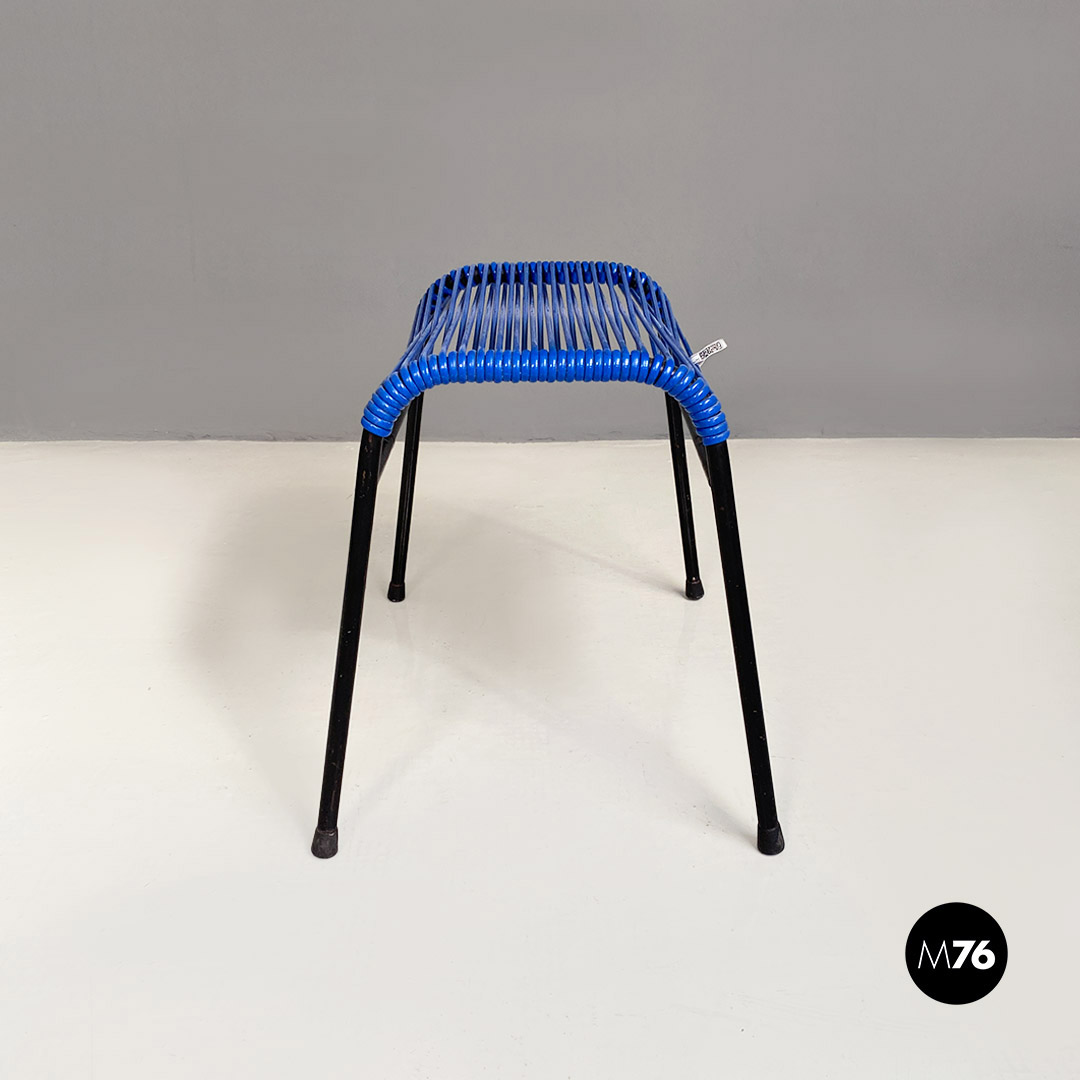 Poggiapiedi o sgabello con zampe in metallo nero a sezione tonda e seduta o piano in fili di plastica di colore blu elettrico.