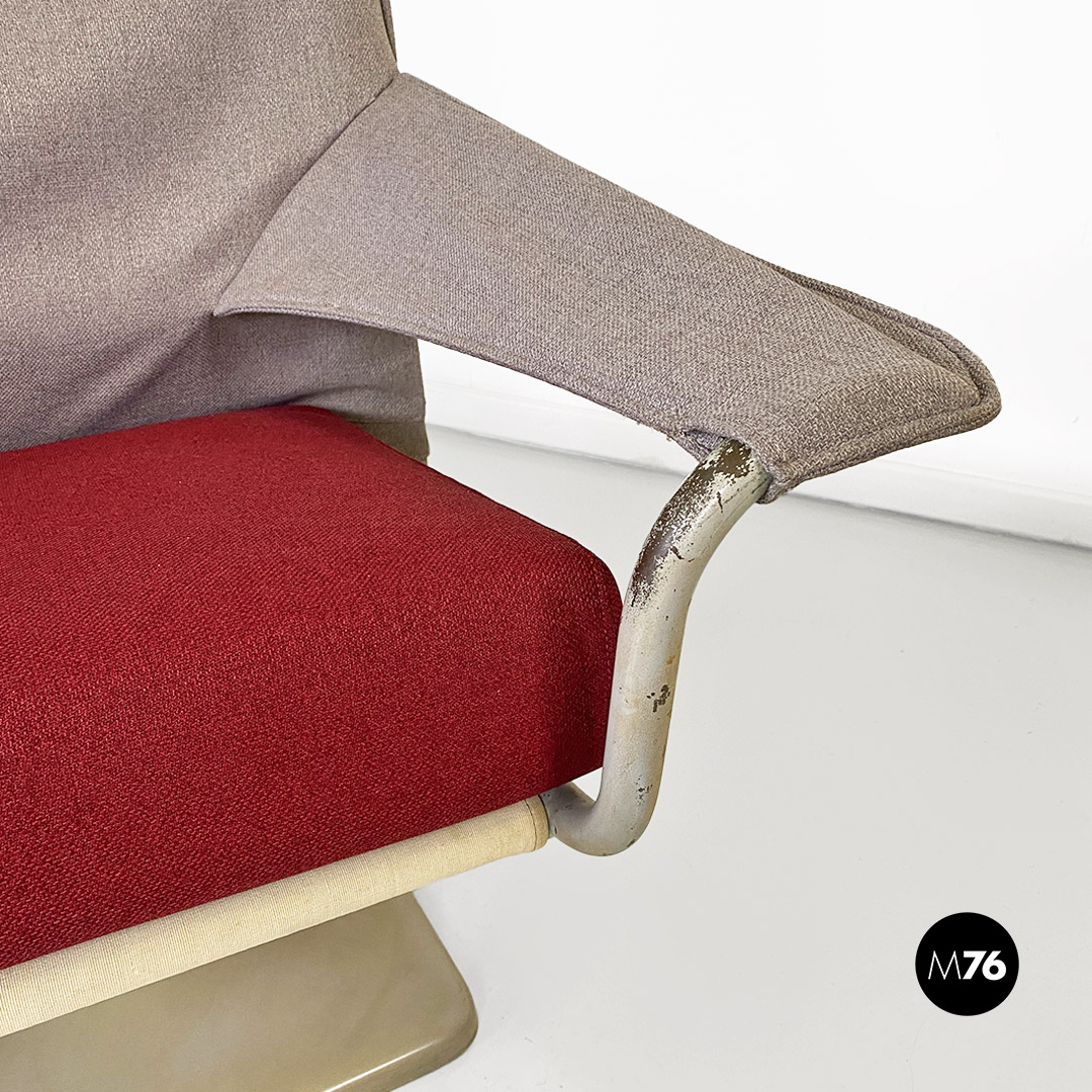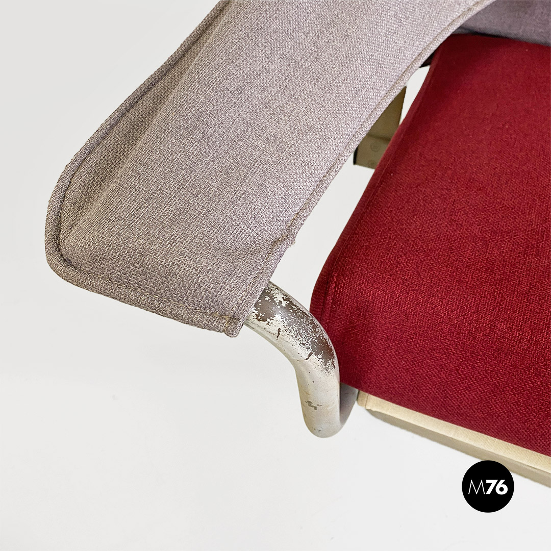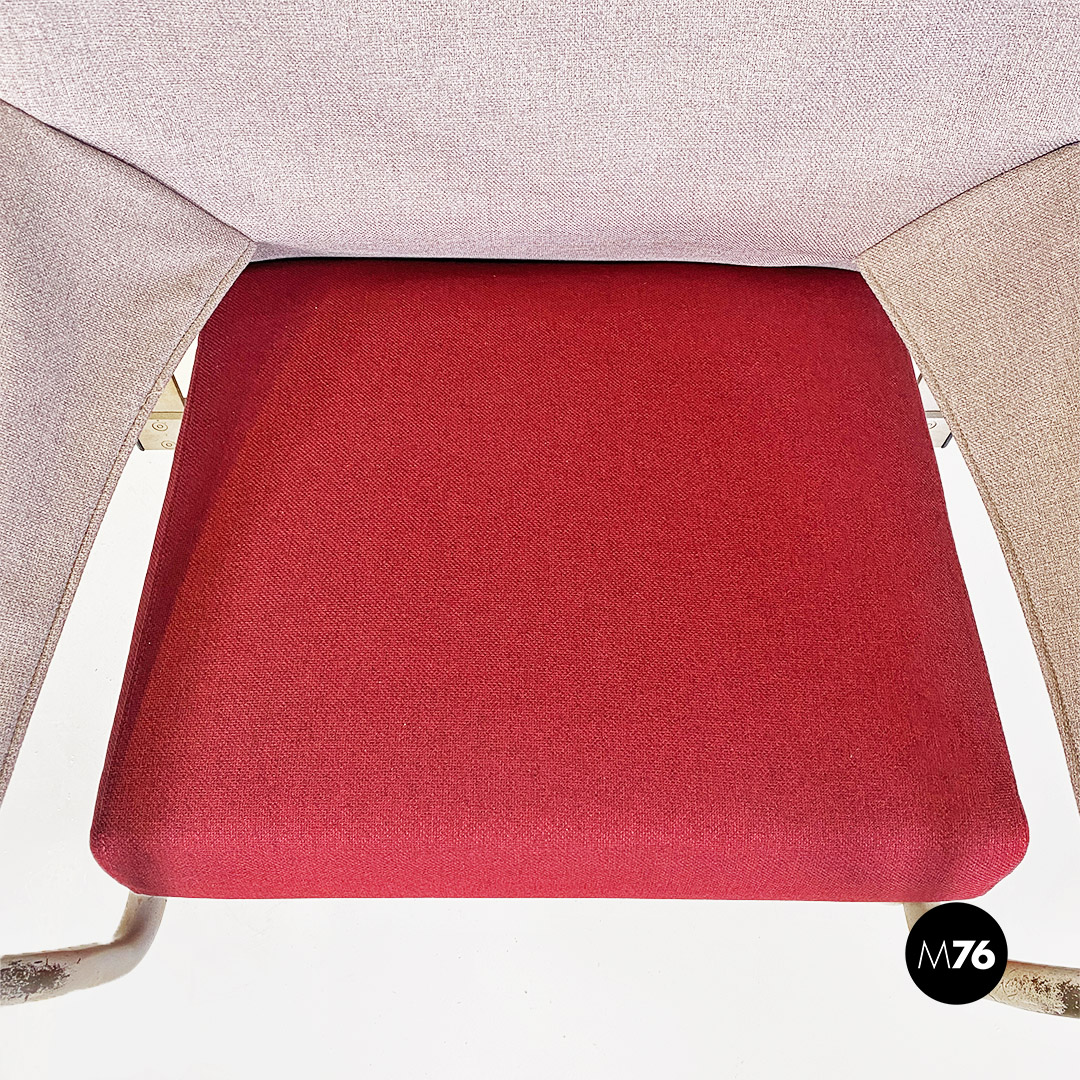 Poltrona modello AEO con struttura a vista in acciaio e base in plastica. La seduta quadrata è rivestita in tessuto rosso scuro e imbottita mentre lo schienale e i braccioli sono rivestiti di tessuto grigio.