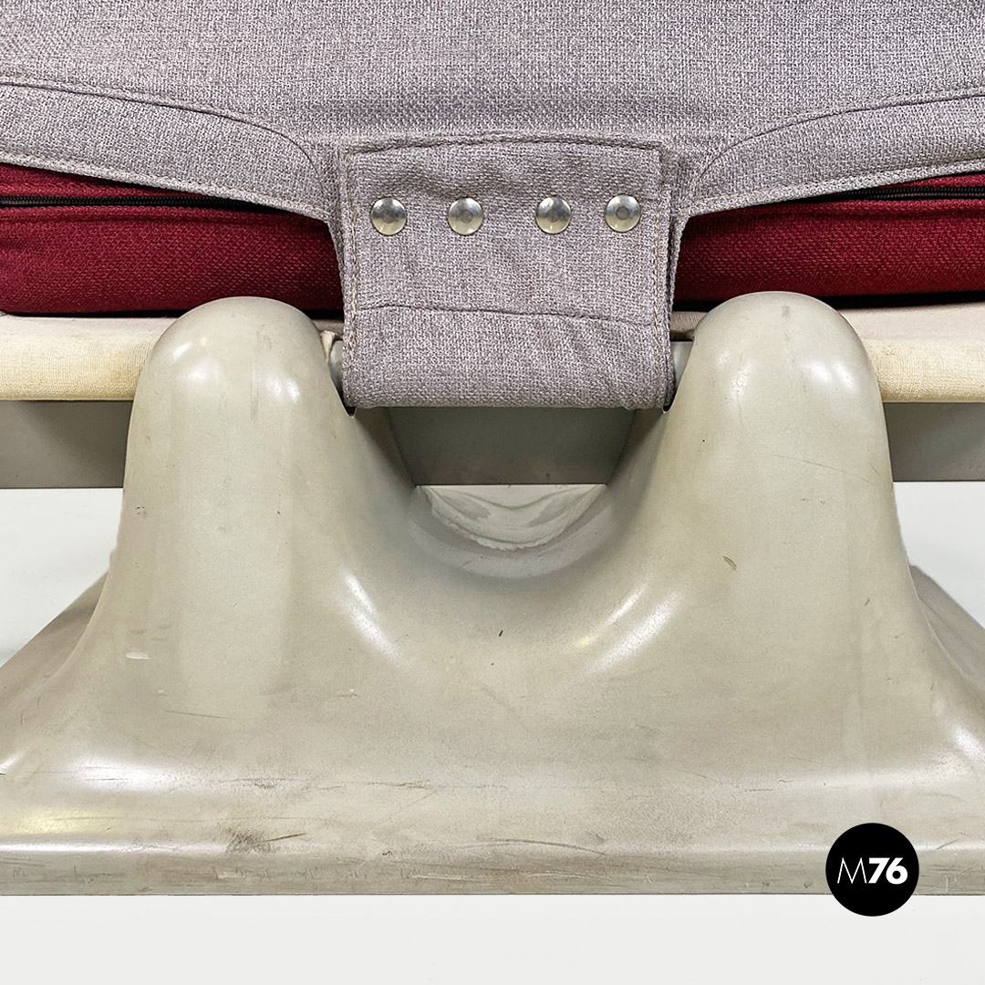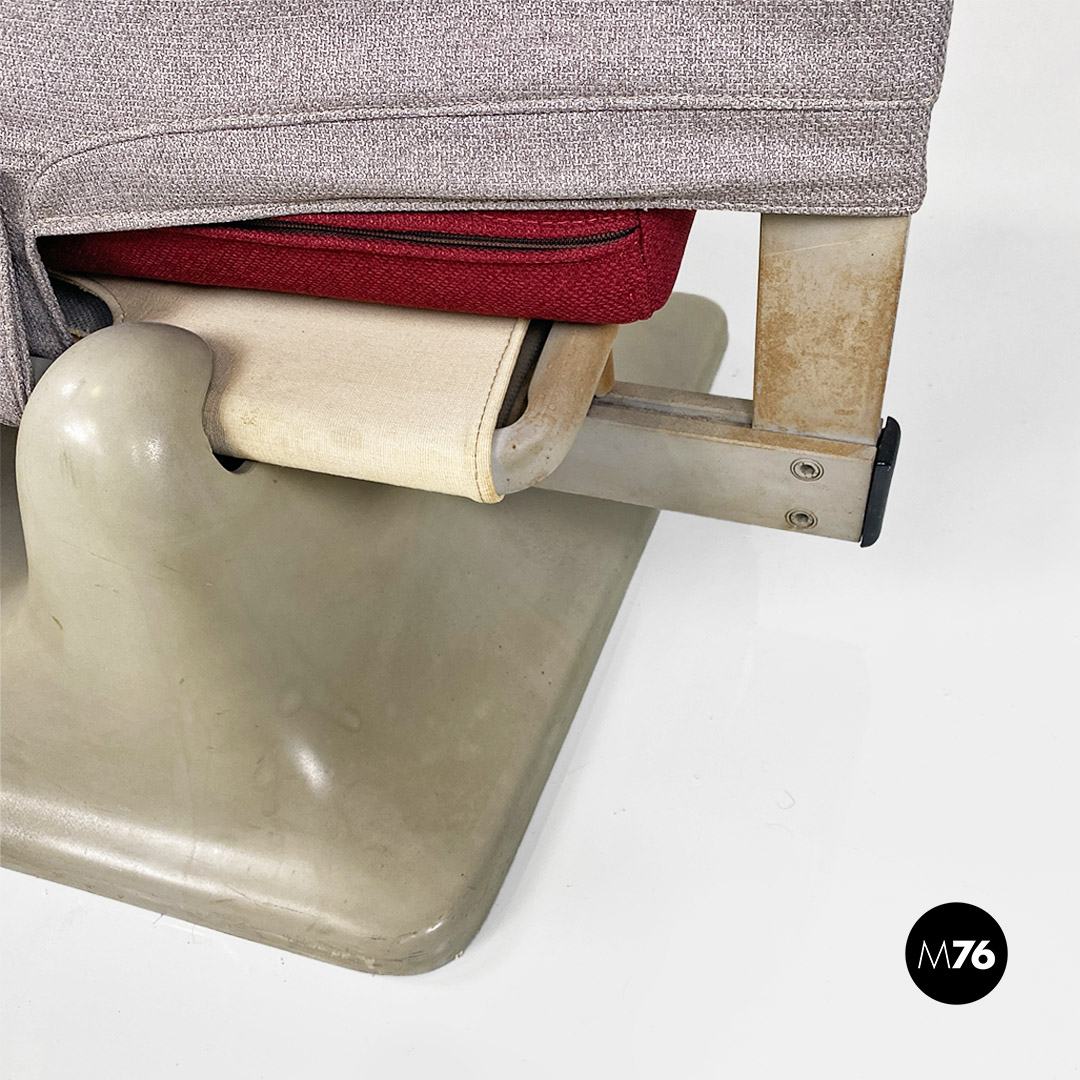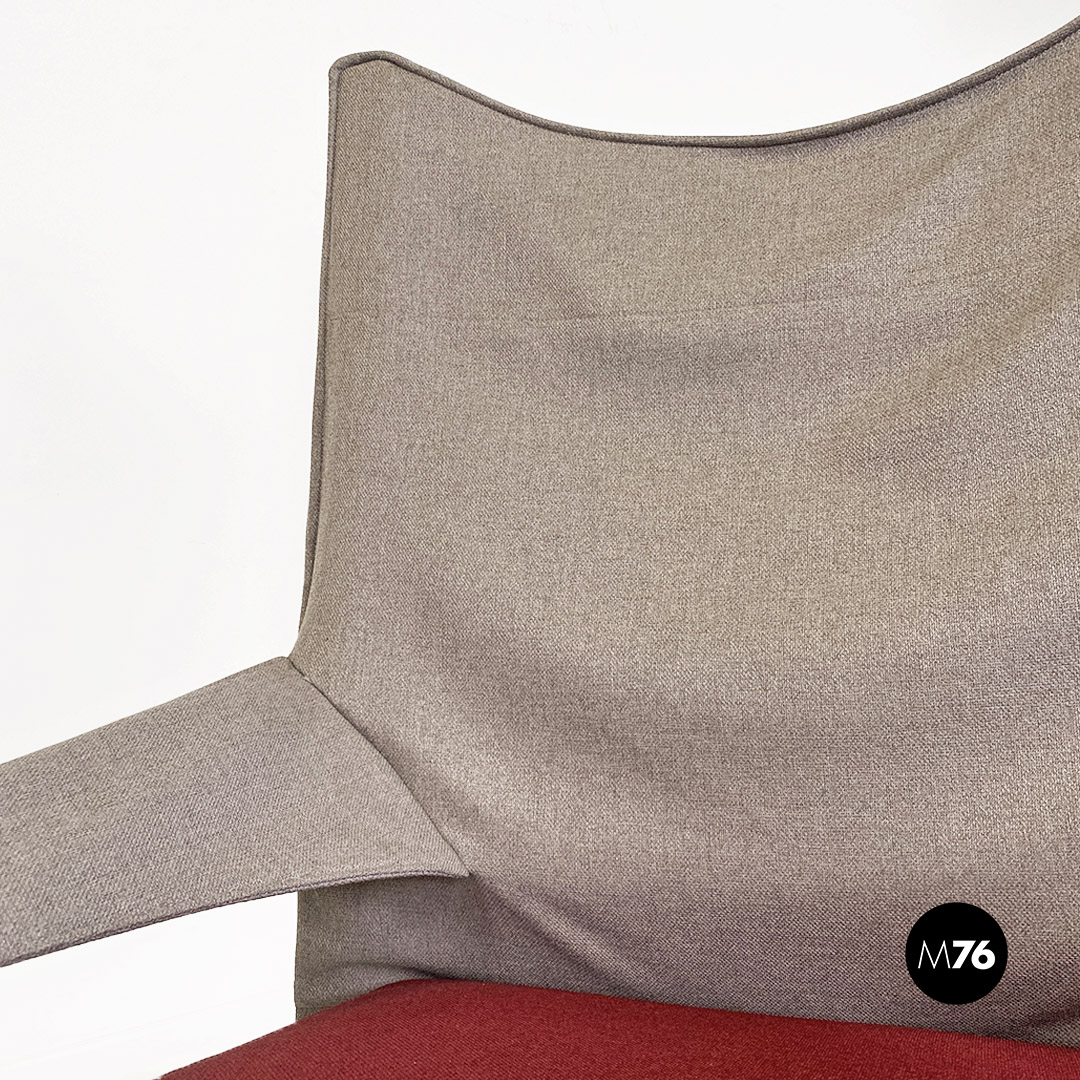 Poltrona modello AEO con struttura a vista in acciaio e base in plastica. La seduta quadrata è rivestita in tessuto rosso scuro e imbottita mentre lo schienale e i braccioli sono rivestiti di tessuto grigio.