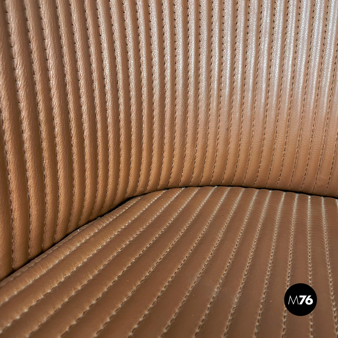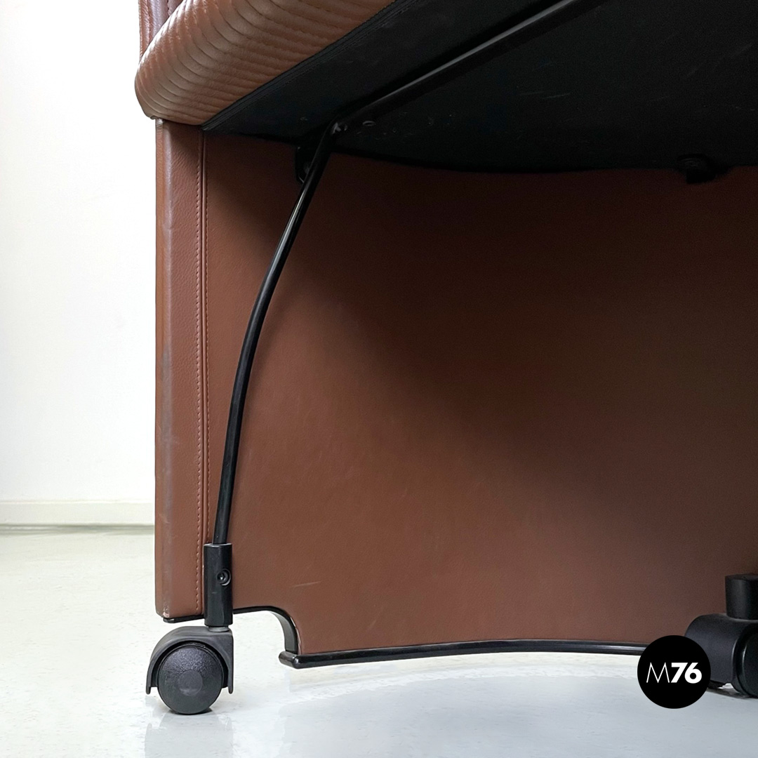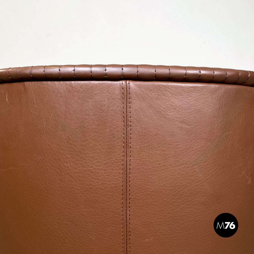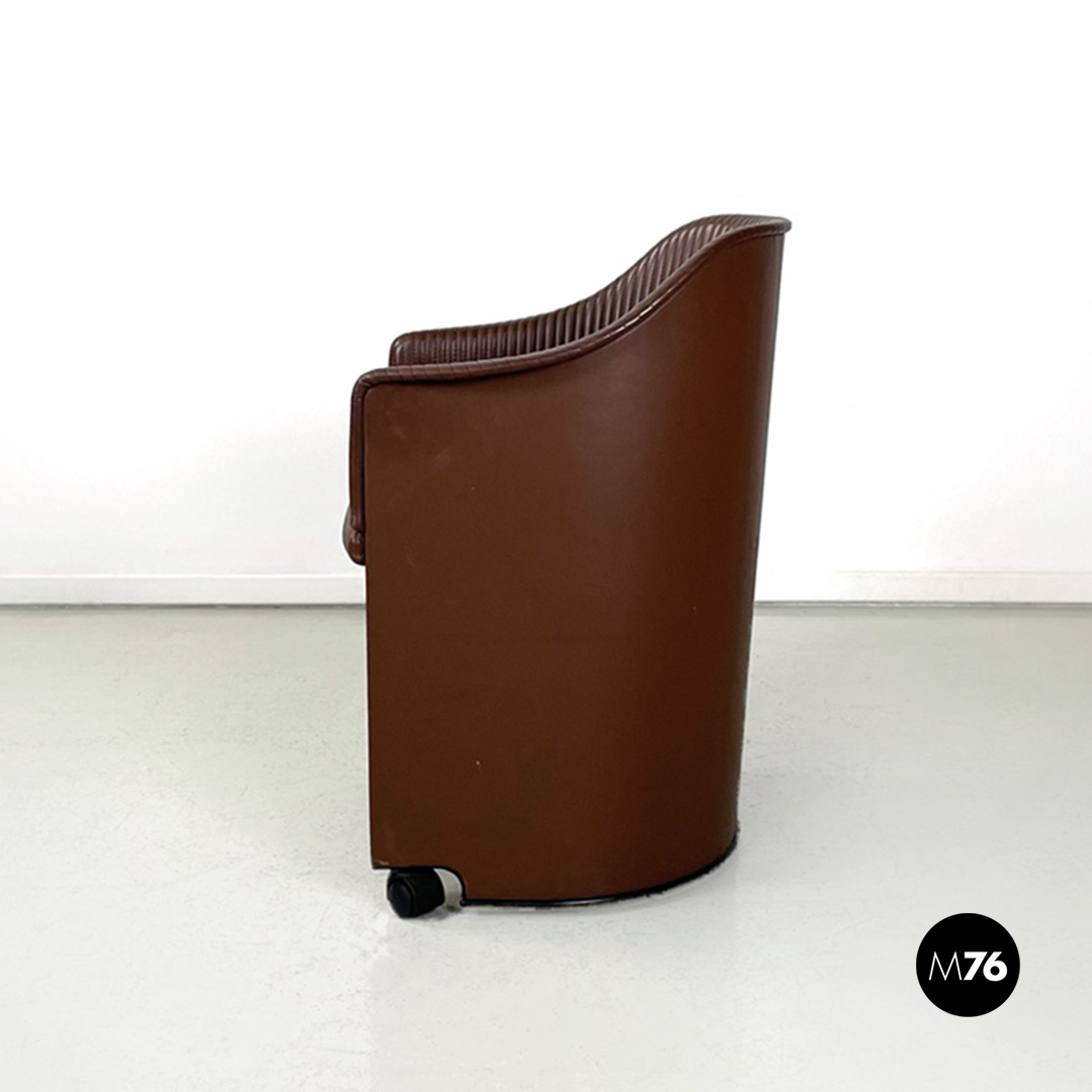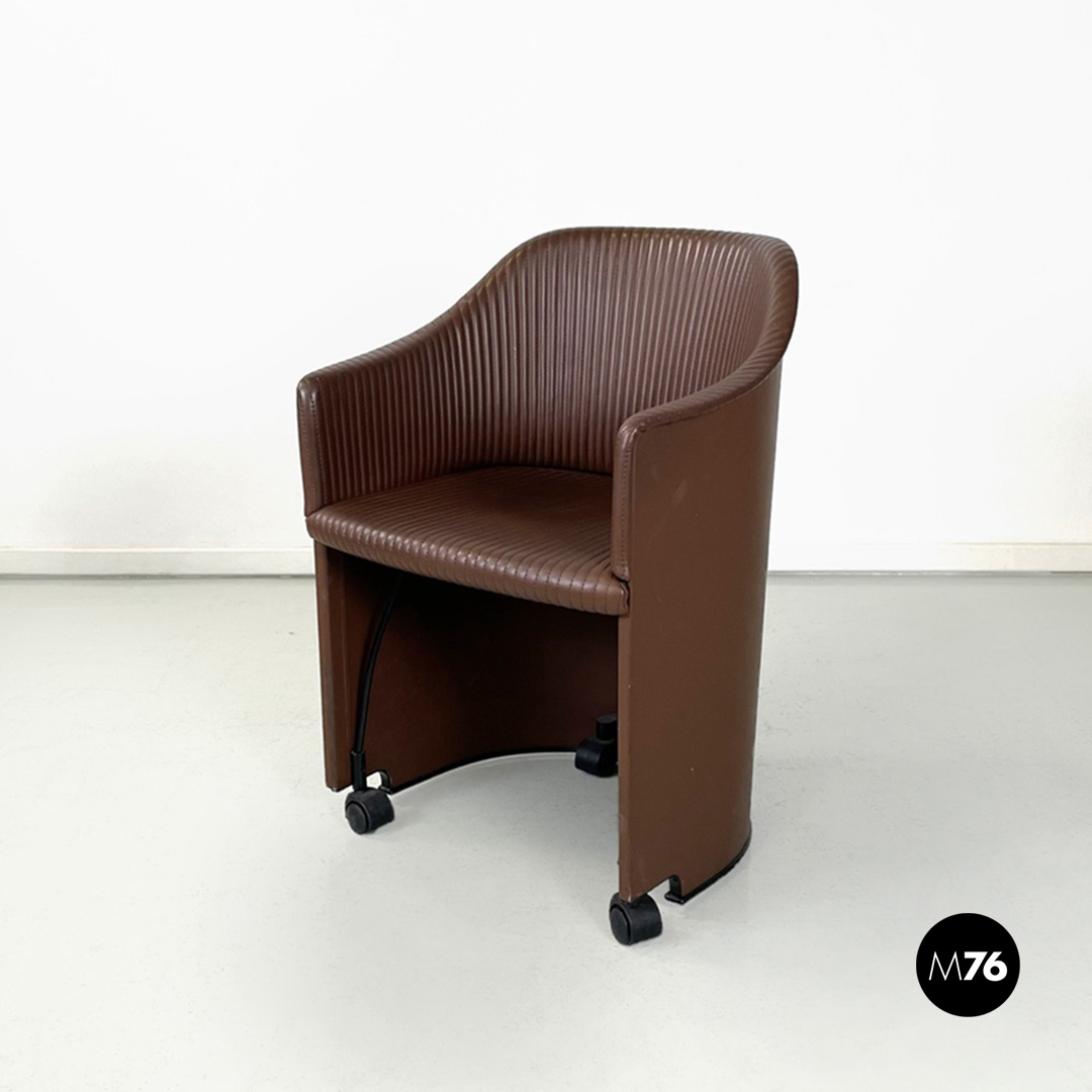Poltrona a pozzetto modello Artona con schienale e seduta in pelle marrone. Schienale e seduta con cuciture parallele su tutta la lunghezza. Con braccioli. La base in plastica nera poggia su quattro ruote anch’esse in plastica nera la struttura interna delle zampe è in tondino di metallo nero.