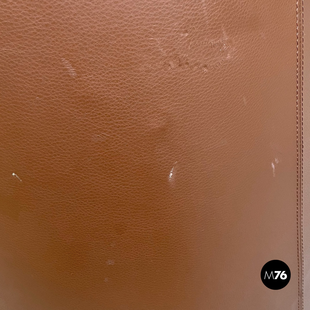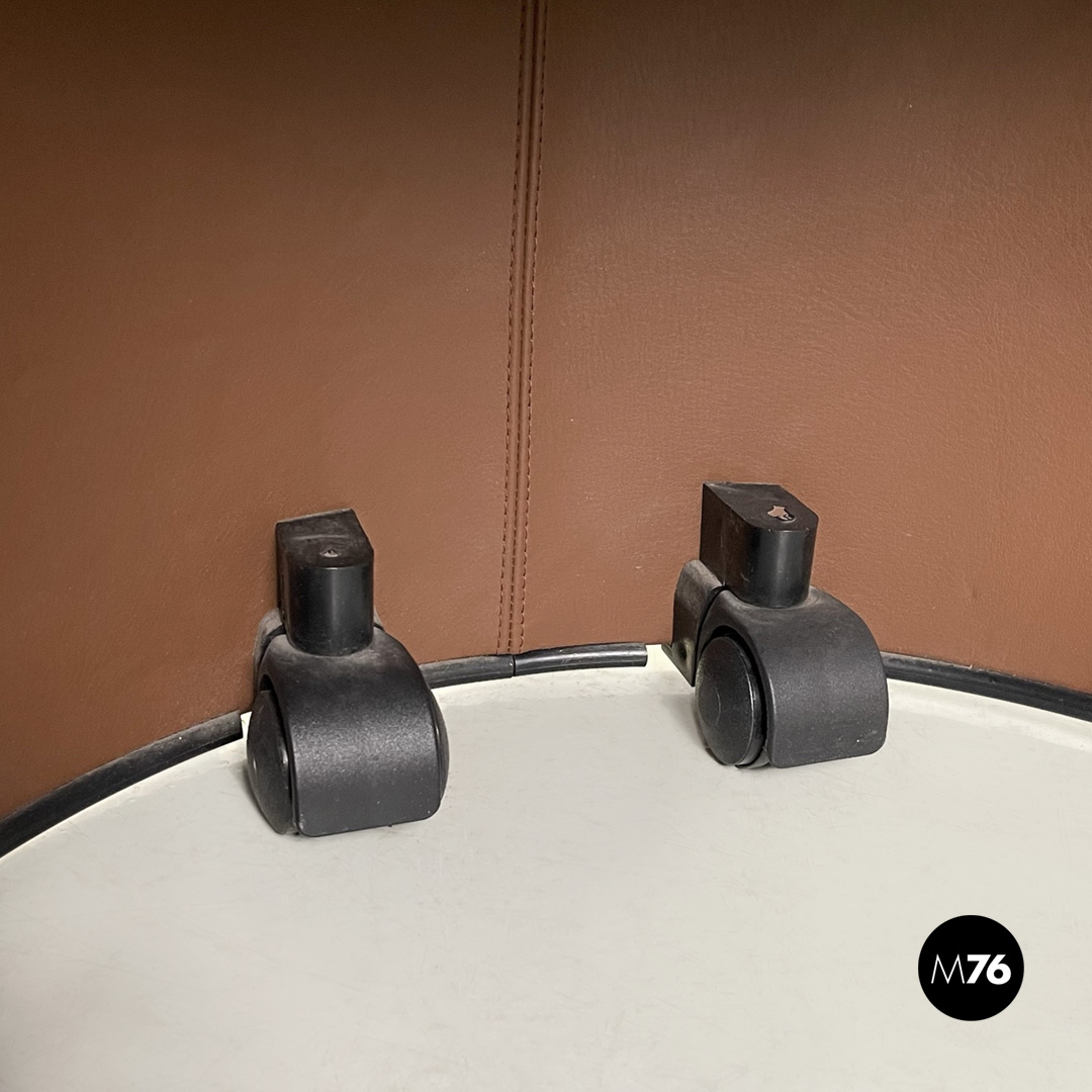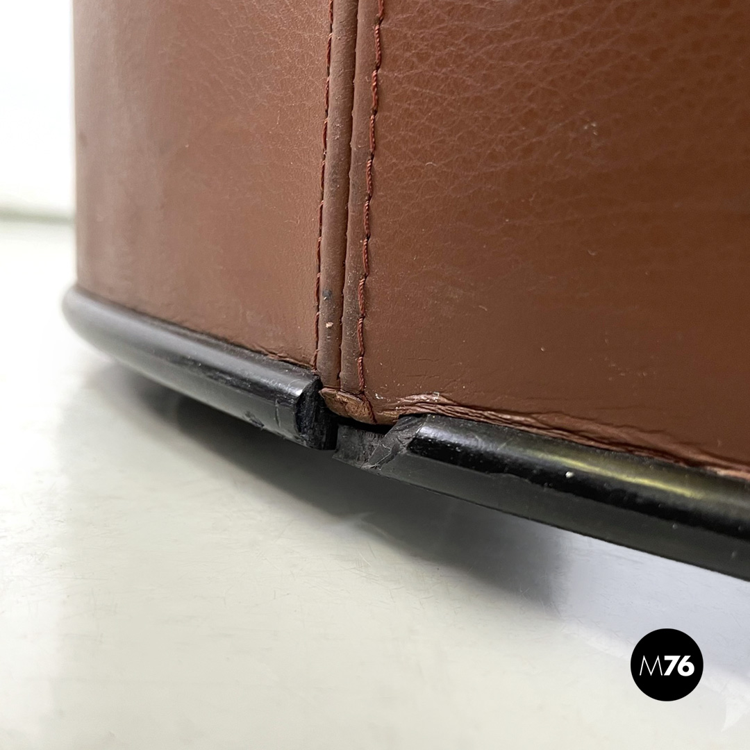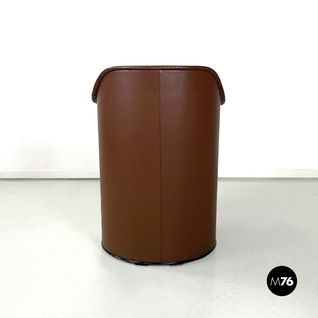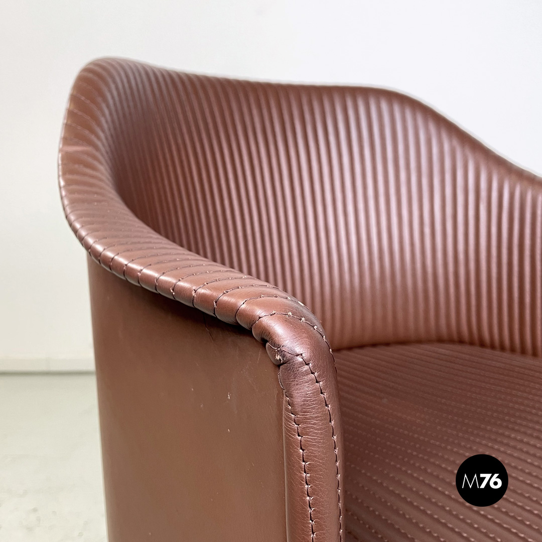 Poltrona a pozzetto modello Artona con schienale e seduta in pelle marrone. Schienale e seduta con cuciture parallele su tutta la lunghezza. Con braccioli. La base in plastica nera poggia su quattro ruote anch’esse in plastica nera la struttura interna delle zampe è in tondino di metallo nero.