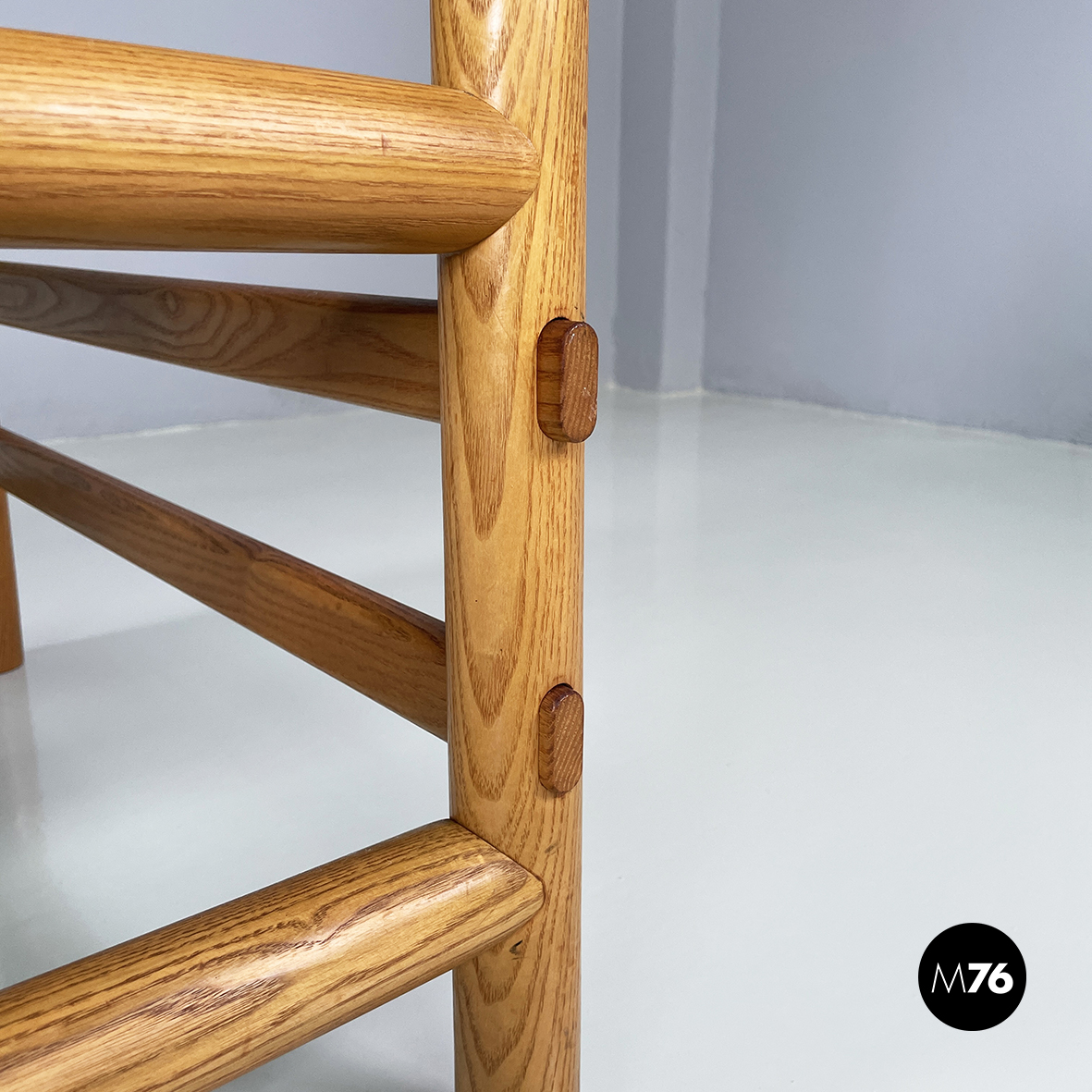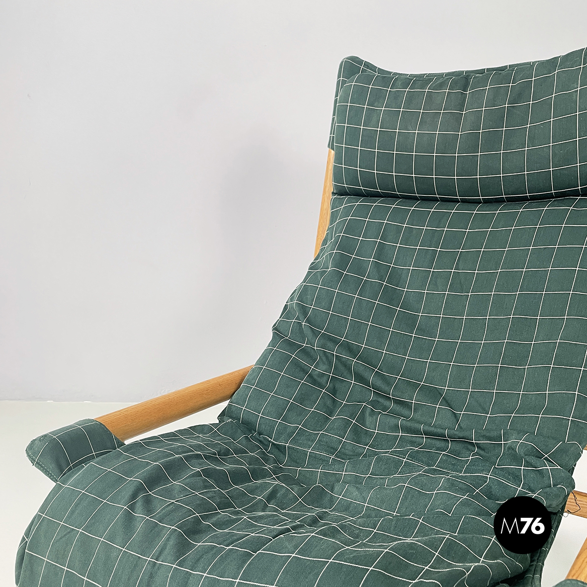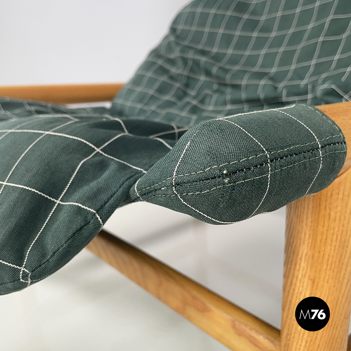 Poltrona modello Carmina in legno e tessuto originale del periodo. La seduta e lo schienale sono composti da un unico cuscino imbottito in tessuto verde con righe bianche sostenuto da un tessuto tenuto teso dalla struttura. La struttura è composta da listelli di legno a sezione tonda e rettangolare.