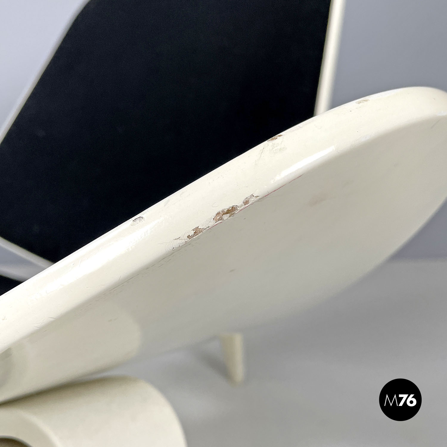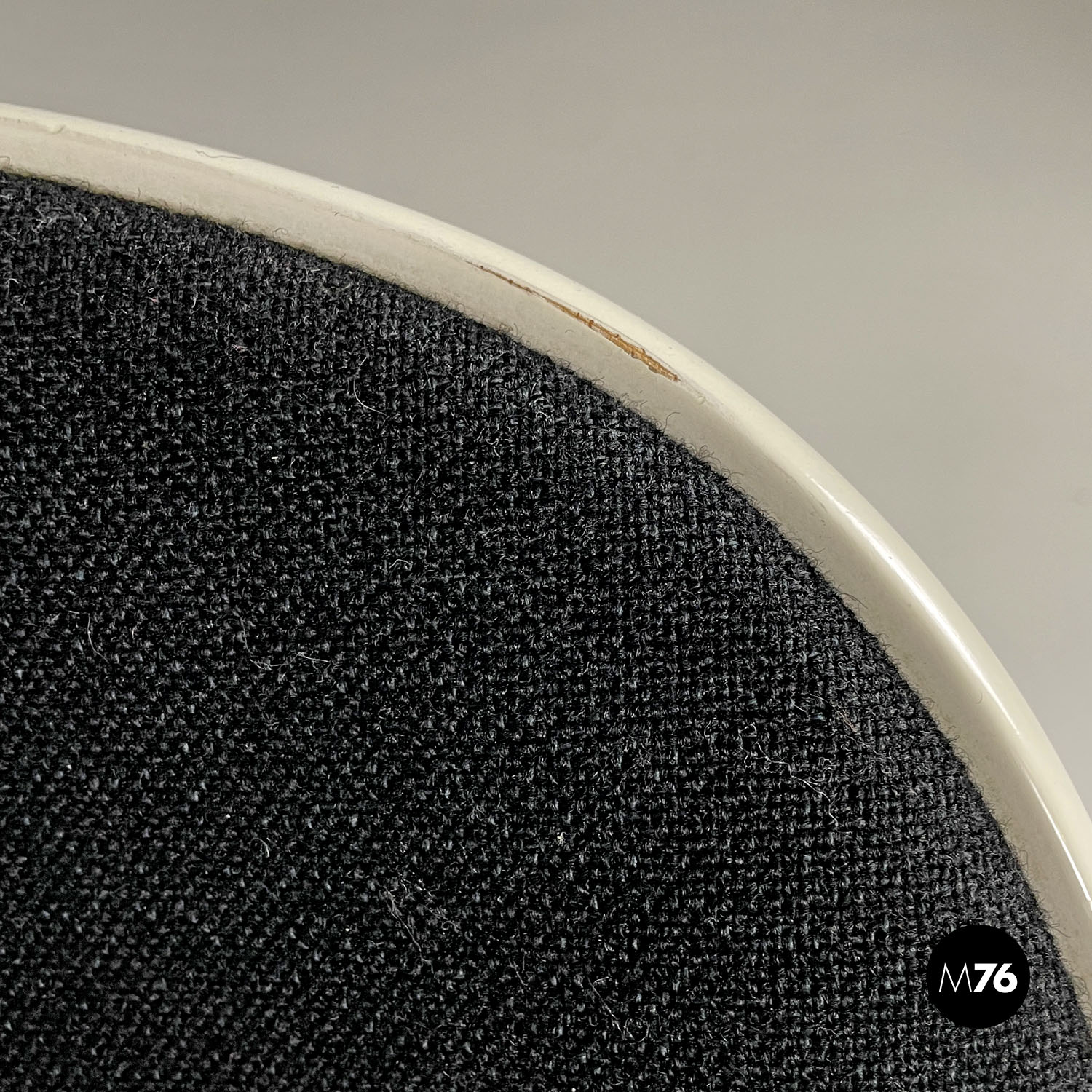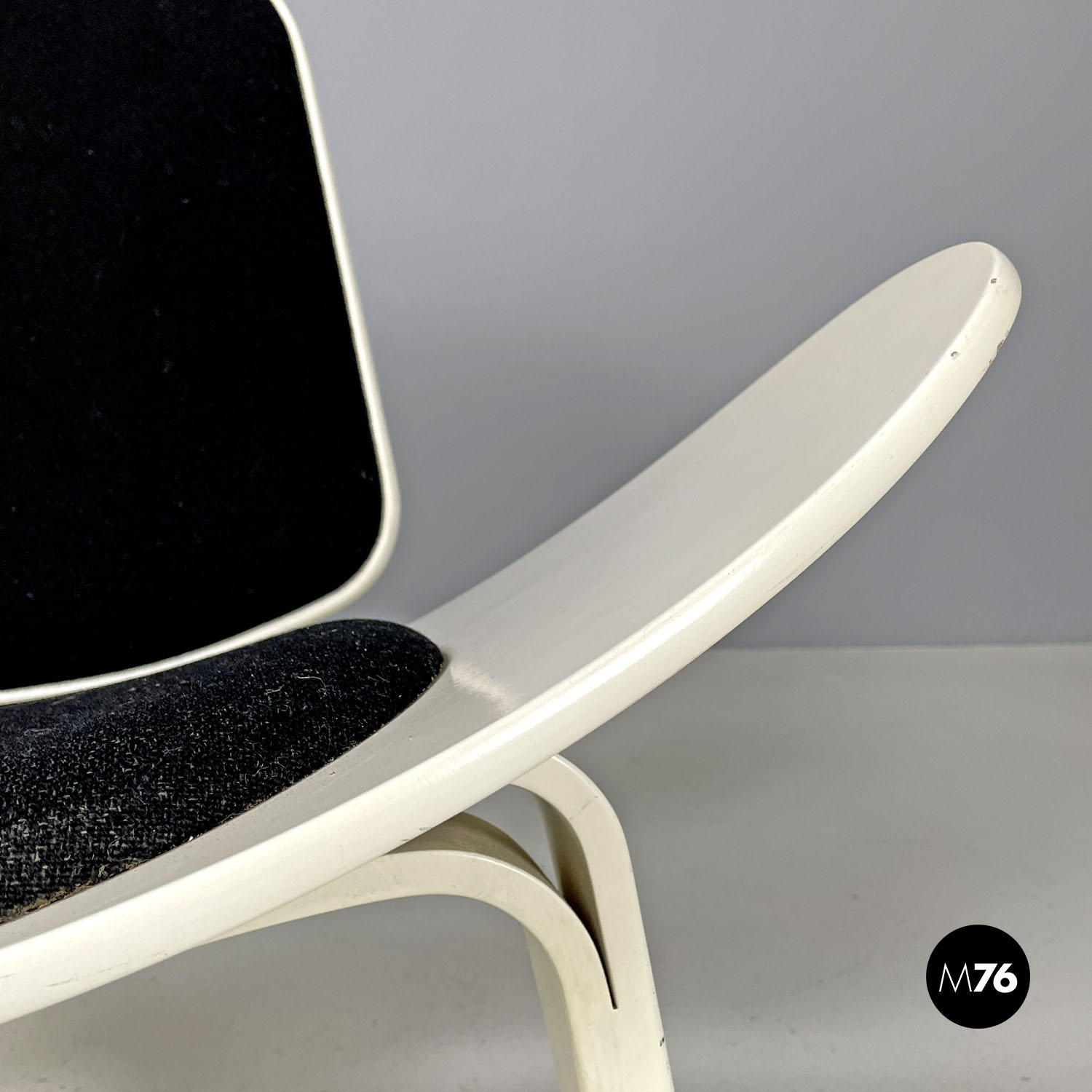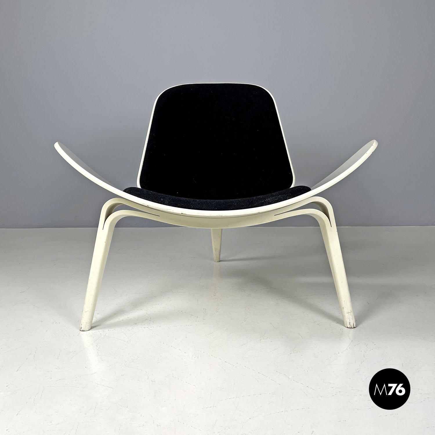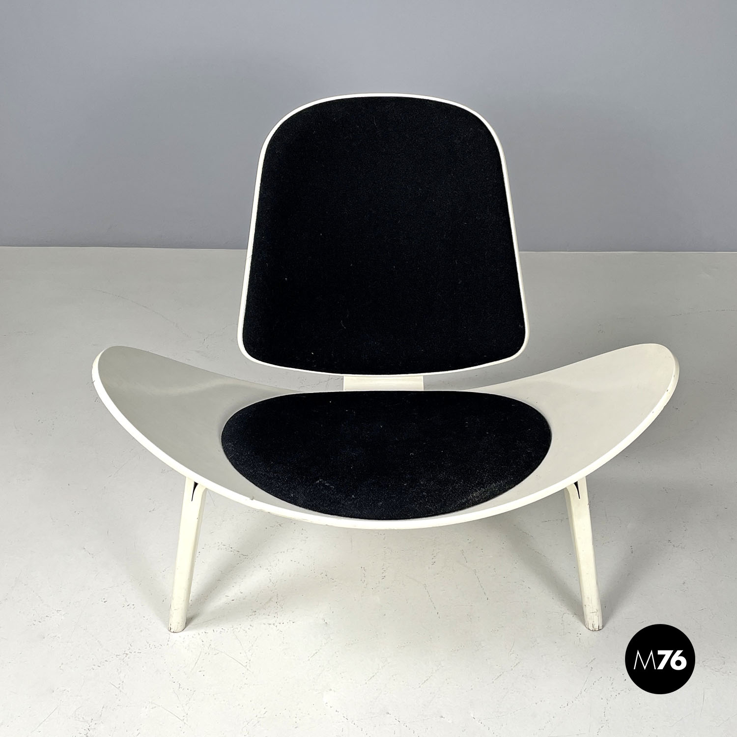 Poltrona a conchiglia modello CH07 Shell Chair  con struttura in legno laccata bianca. La struttura ha delle particolari linee dinamiche e avvolgenti la seduta è allungata e i lati si sviluppano verso l’alto creando una curva. Presenta tre gambe due davanti e una dietro che all’appoggio della seduta e dello schienale sono composte da due parti unite che formano prima un foro e poi si uniscono arrivando ad avere una sezione tonda all’appoggio a terra. La seduta e lo schienale sono imbottiti e rivestiti di tessuto nero.
