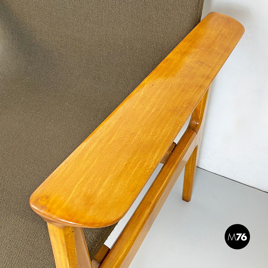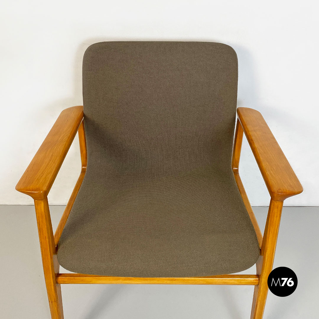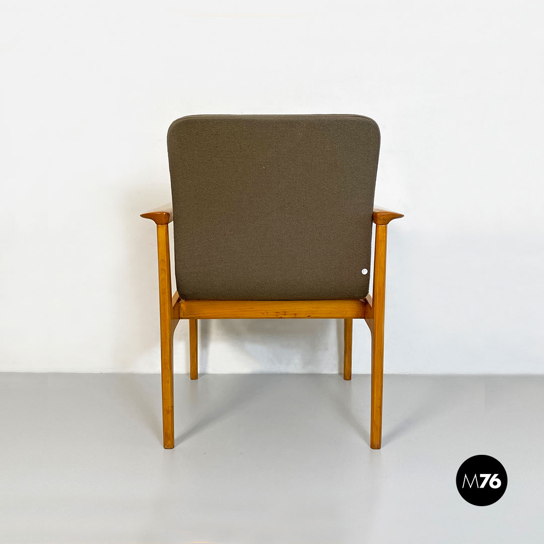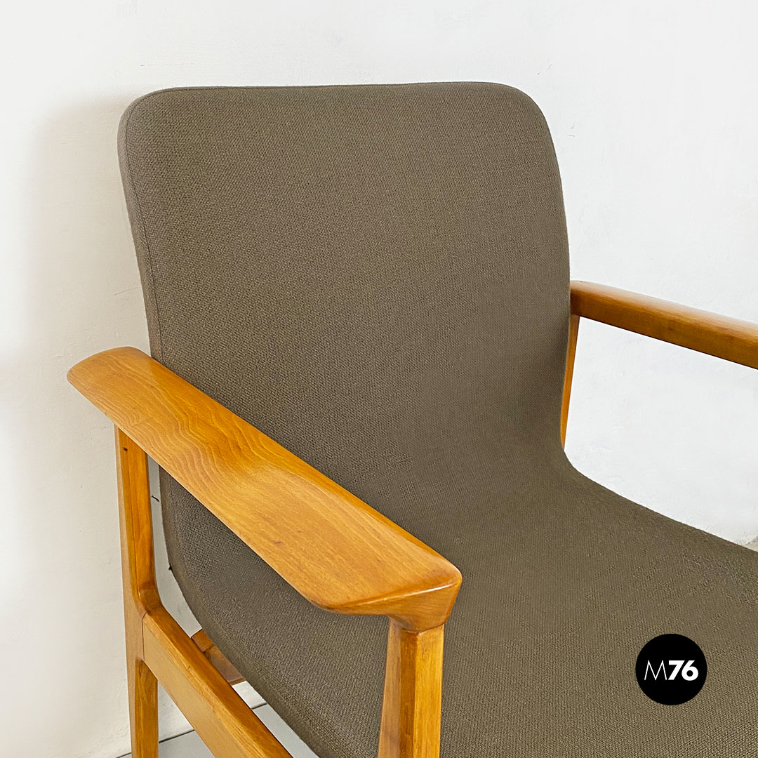 Poltrona con braccioli con struttura in legno massello di faggio e seduta in legno curvato leggermente imbottita e rivestita nel suo tessuto originale color marrone.