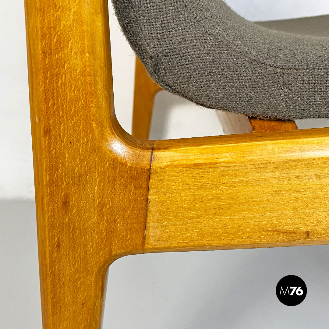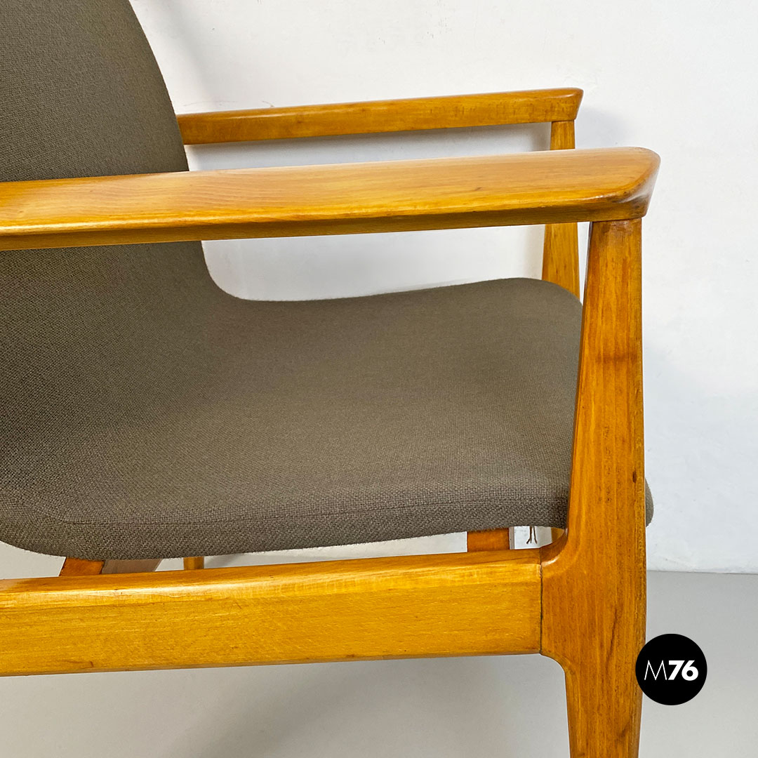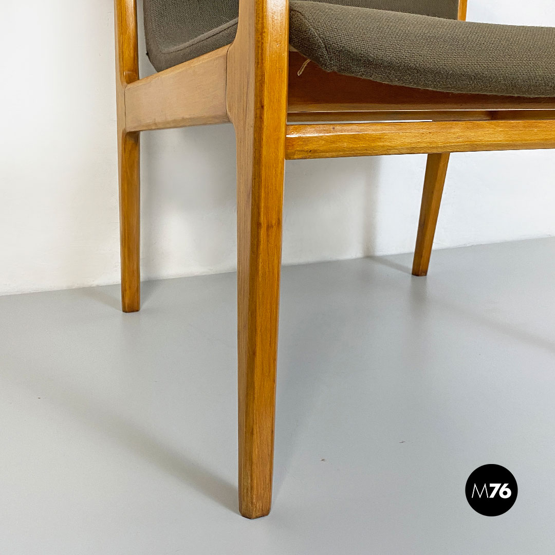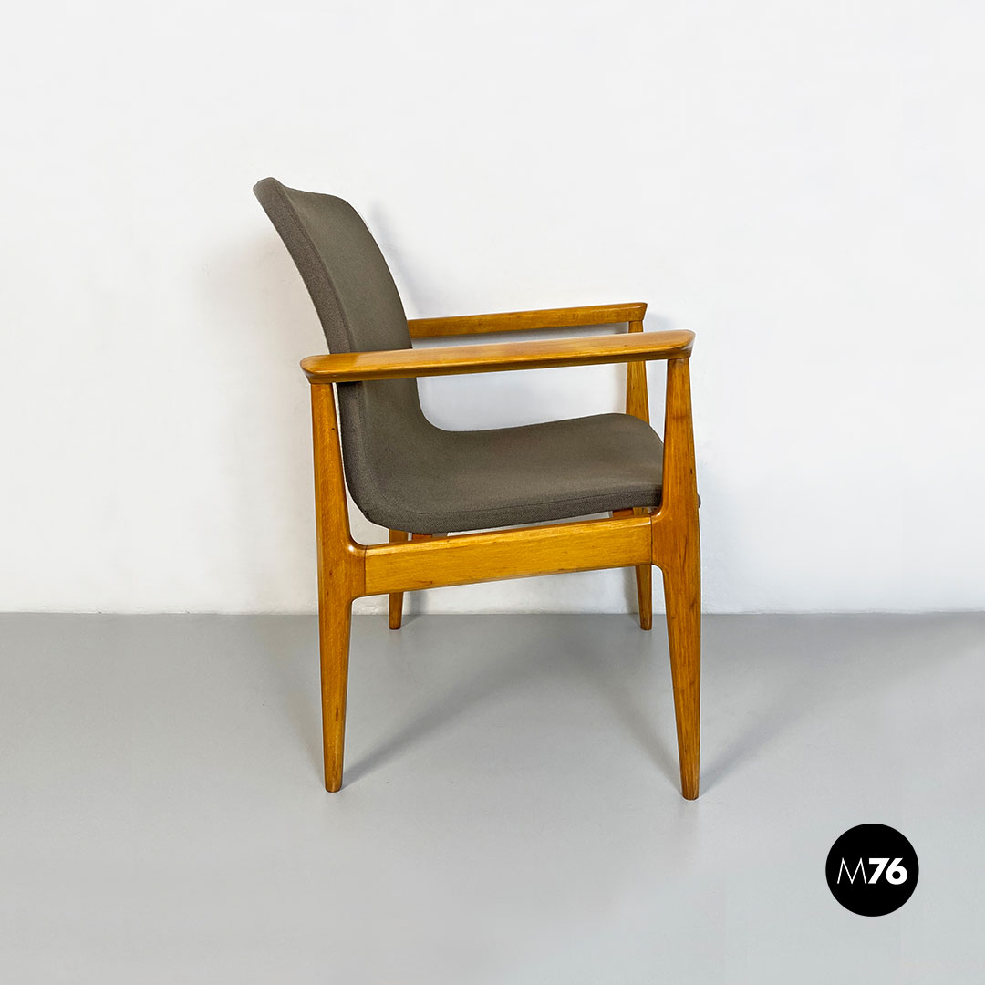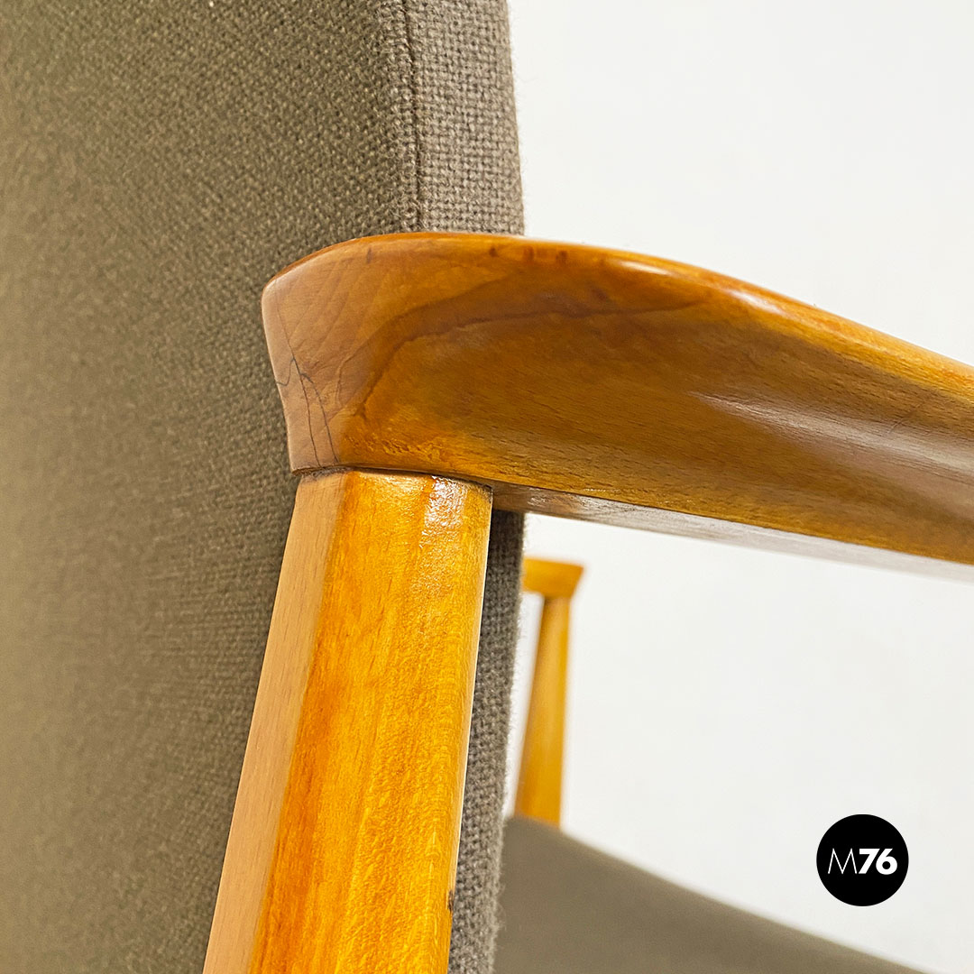 Poltrona con braccioli con struttura in legno massello di faggio e seduta in legno curvato leggermente imbottita e rivestita nel suo tessuto originale color marrone.