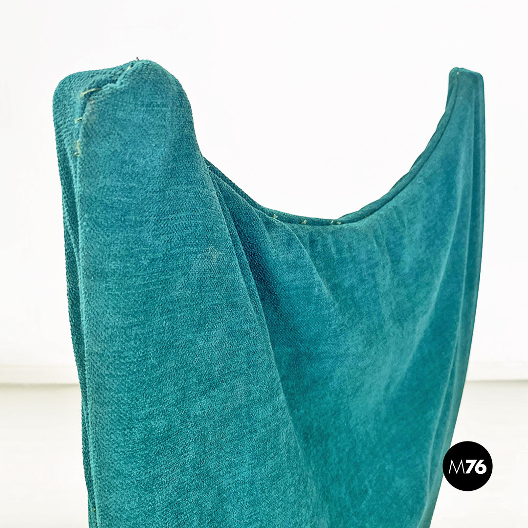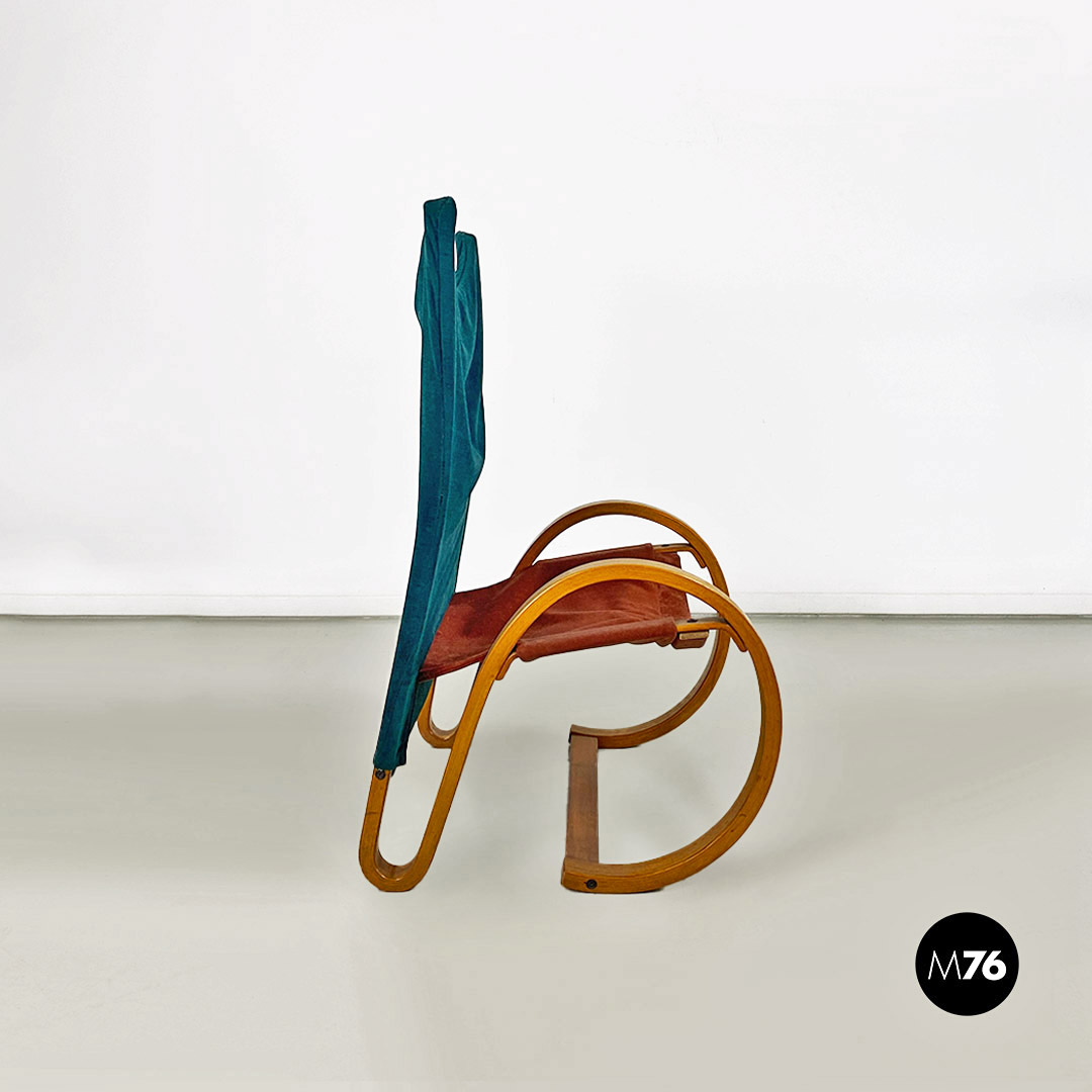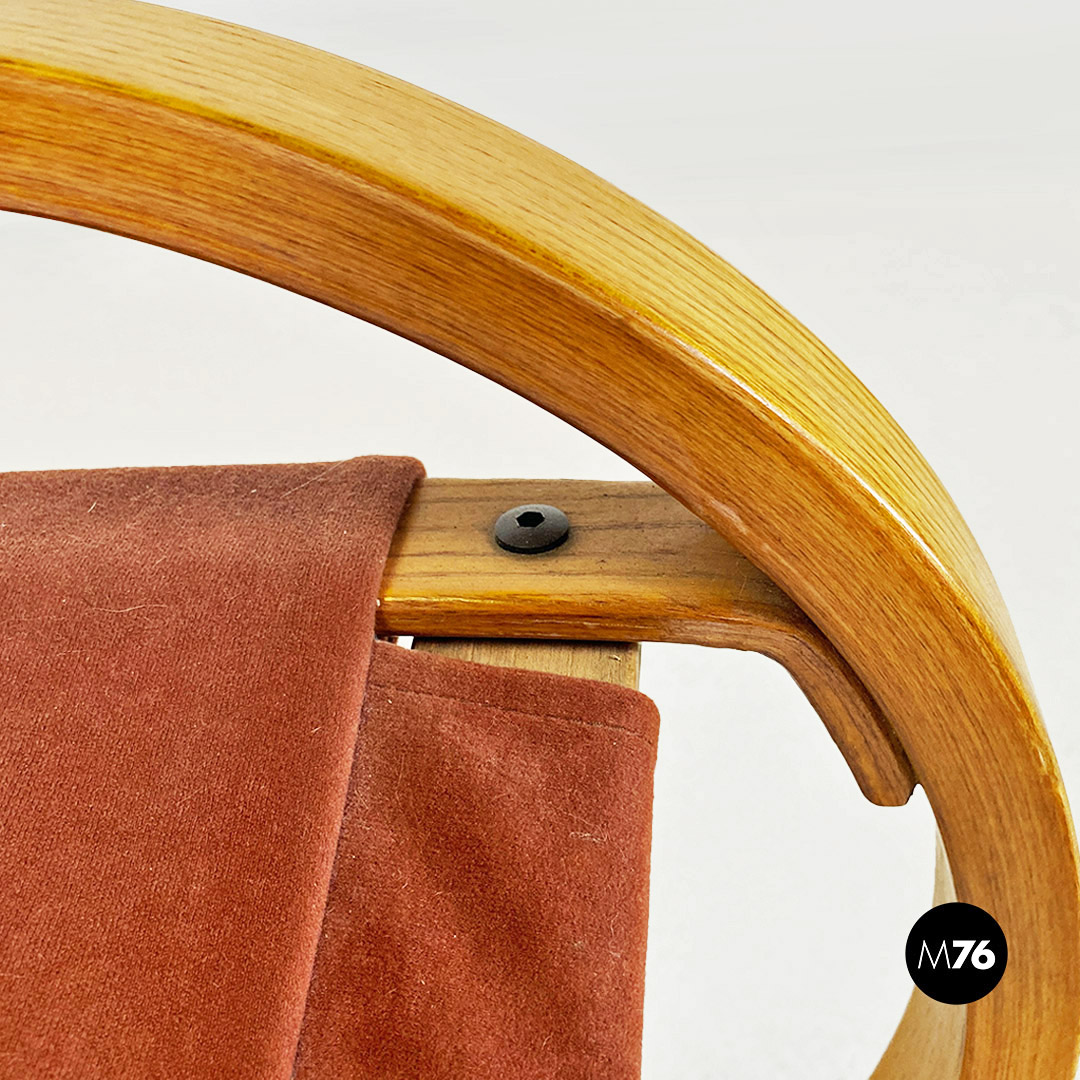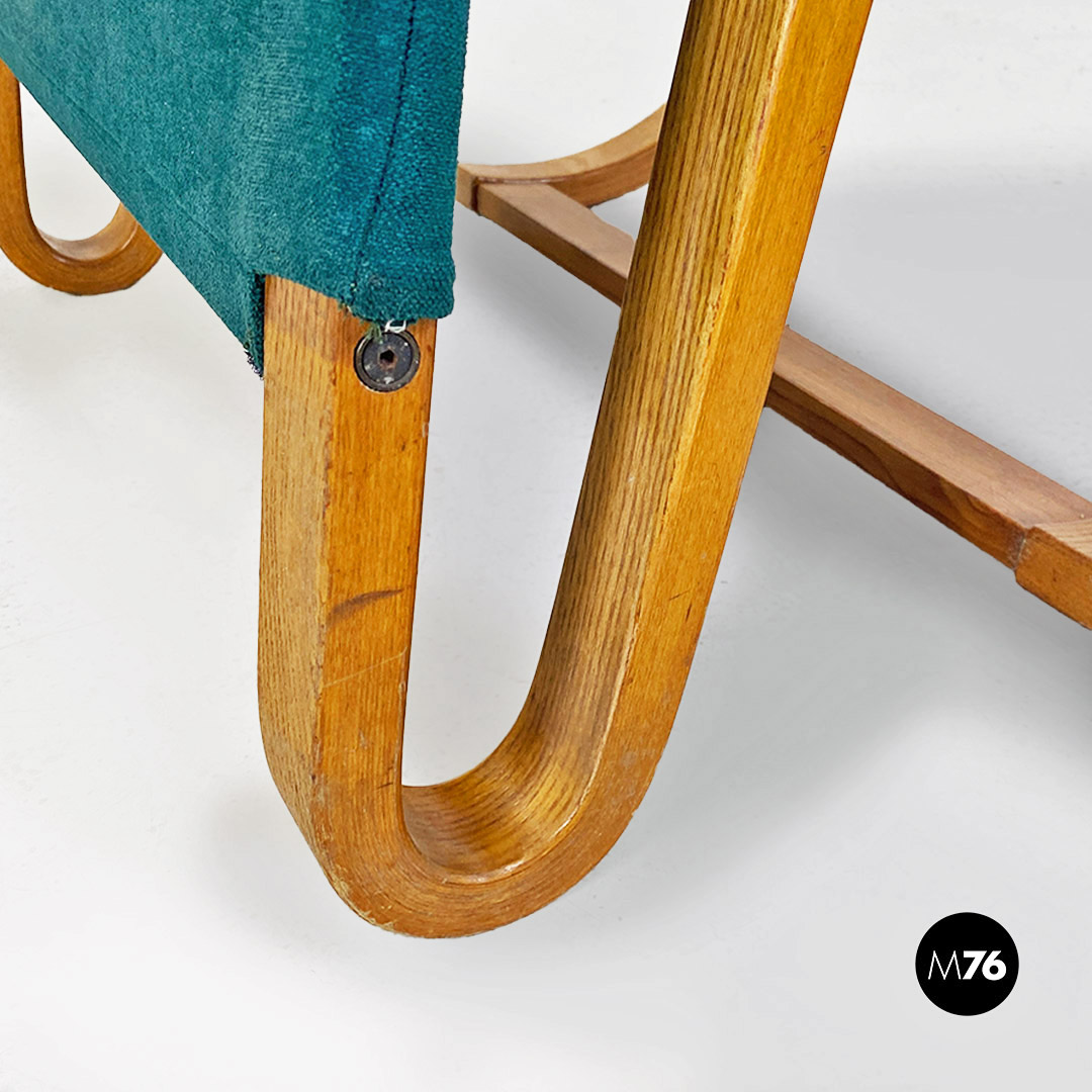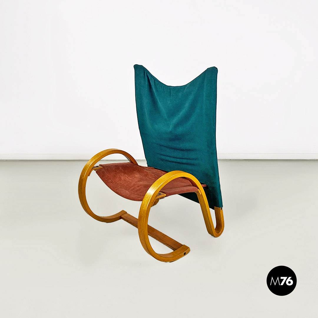 Poltrona con struttura curvata in legno massello con braccioli. Seduta e schienale sono in velluto rispettivamente nei colori marrone e verde scuro.