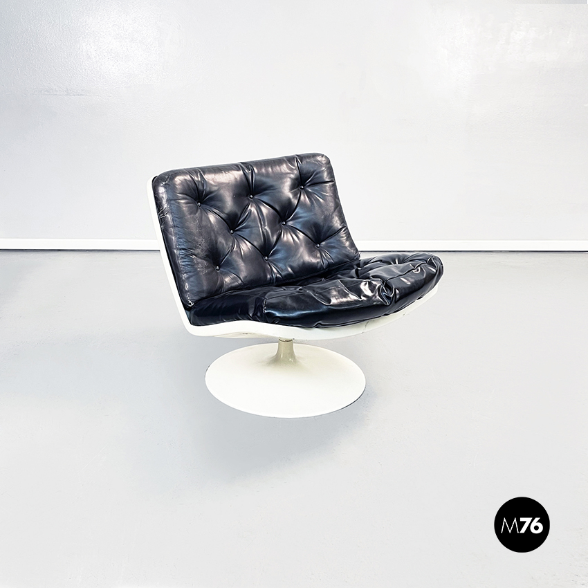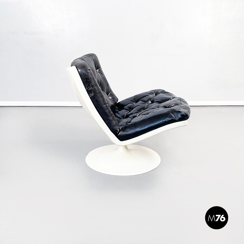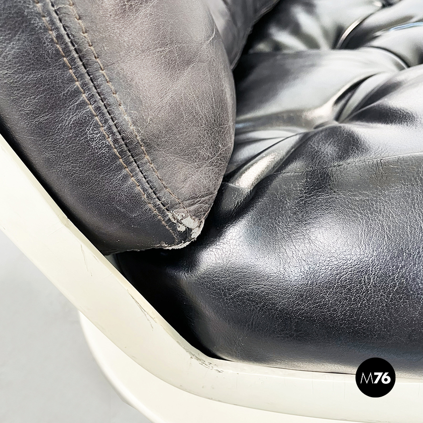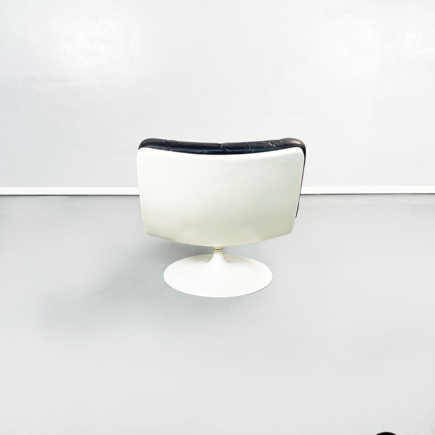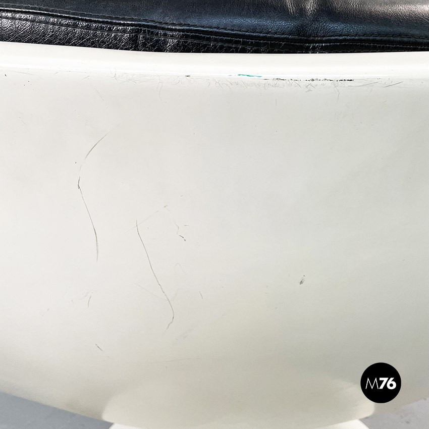 Poltrona girevole a base tonda in plastica bianca. La seduta e lo schienale sono composti da due cuscini imbottiti e impunturati in pelle nera.