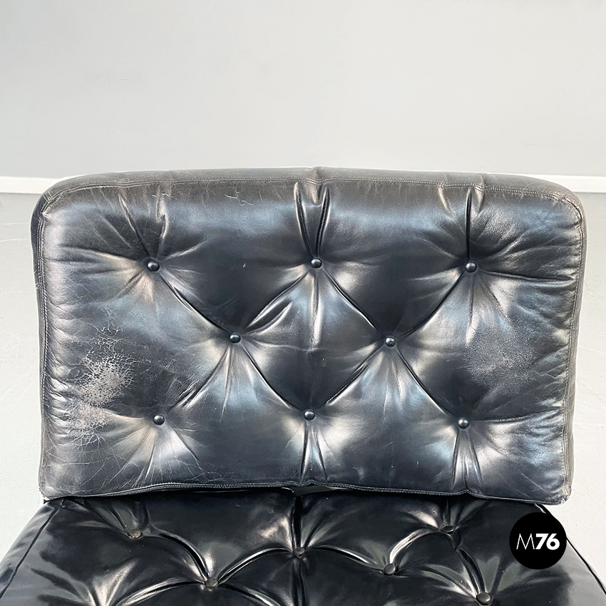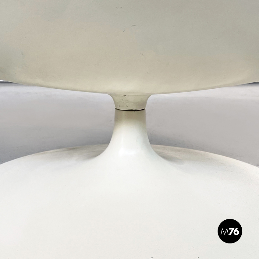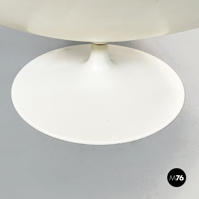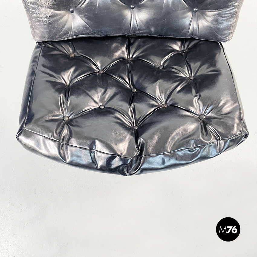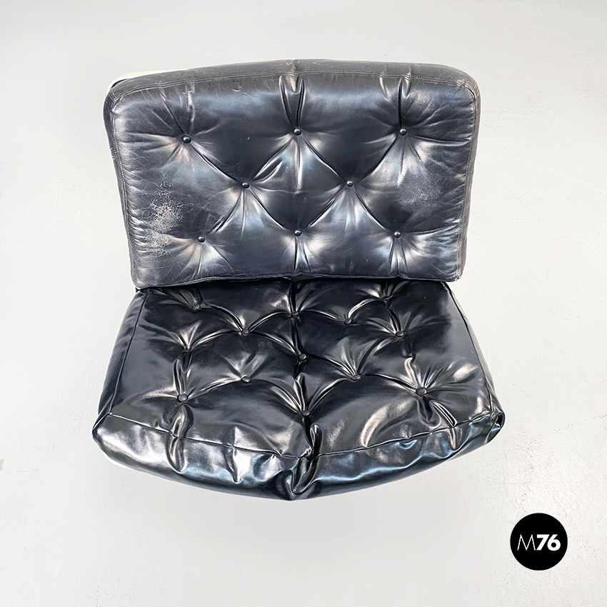 Poltrona girevole a base tonda in plastica bianca. La seduta e lo schienale sono composti da due cuscini imbottiti e impunturati in pelle nera.