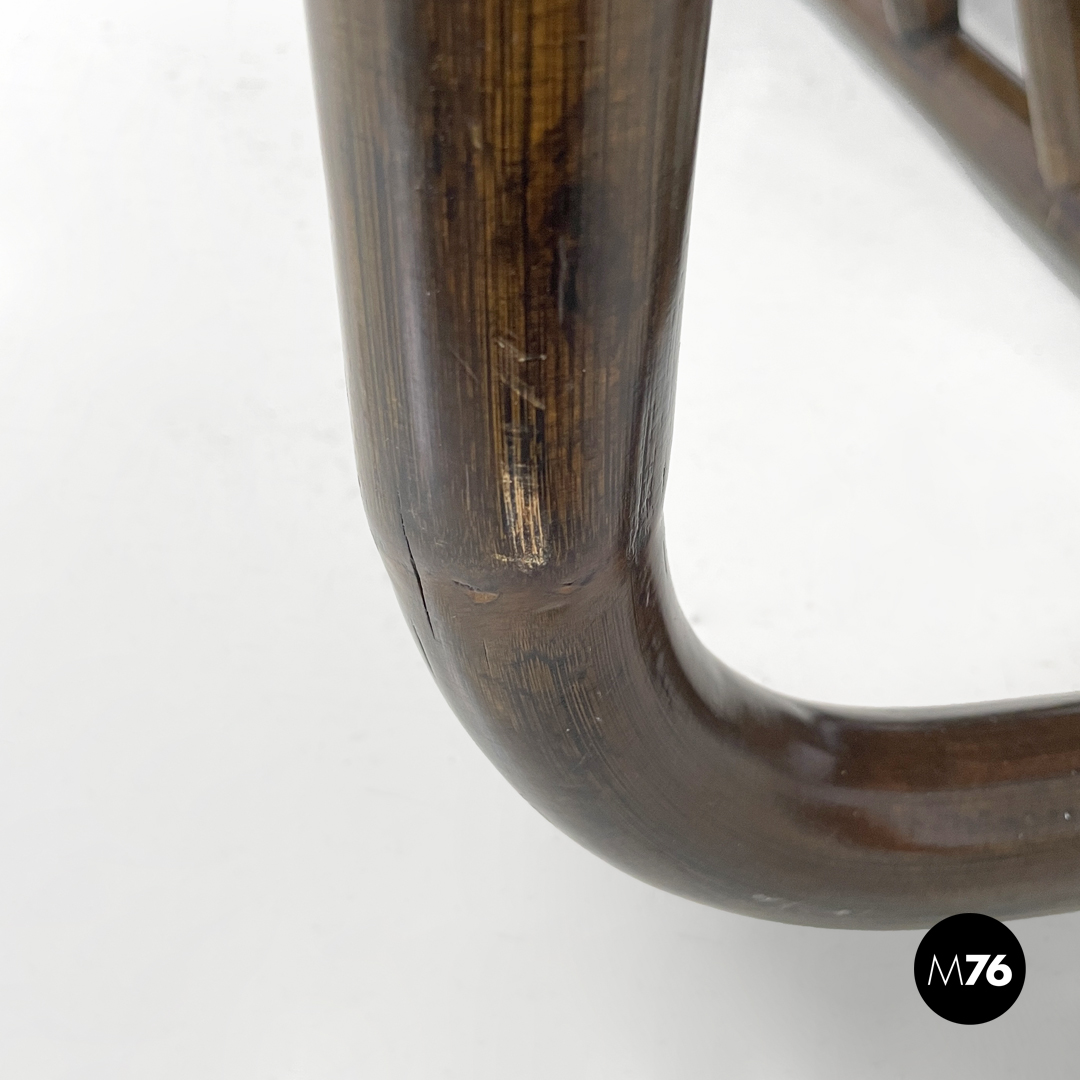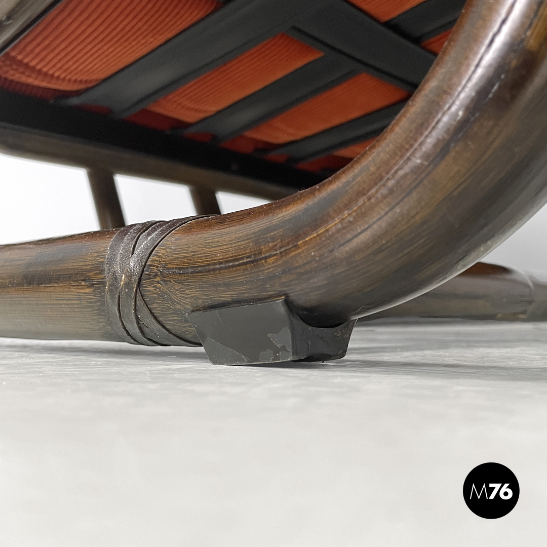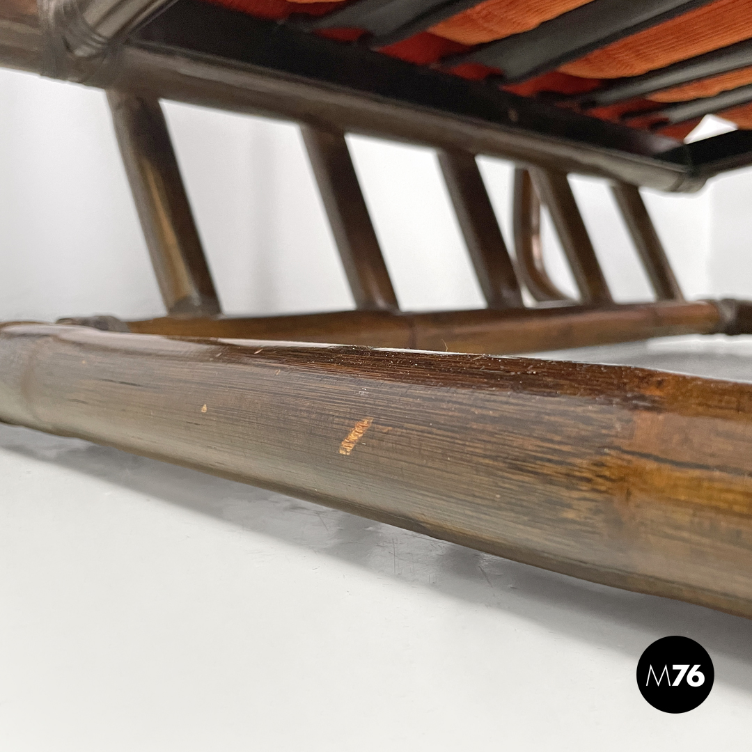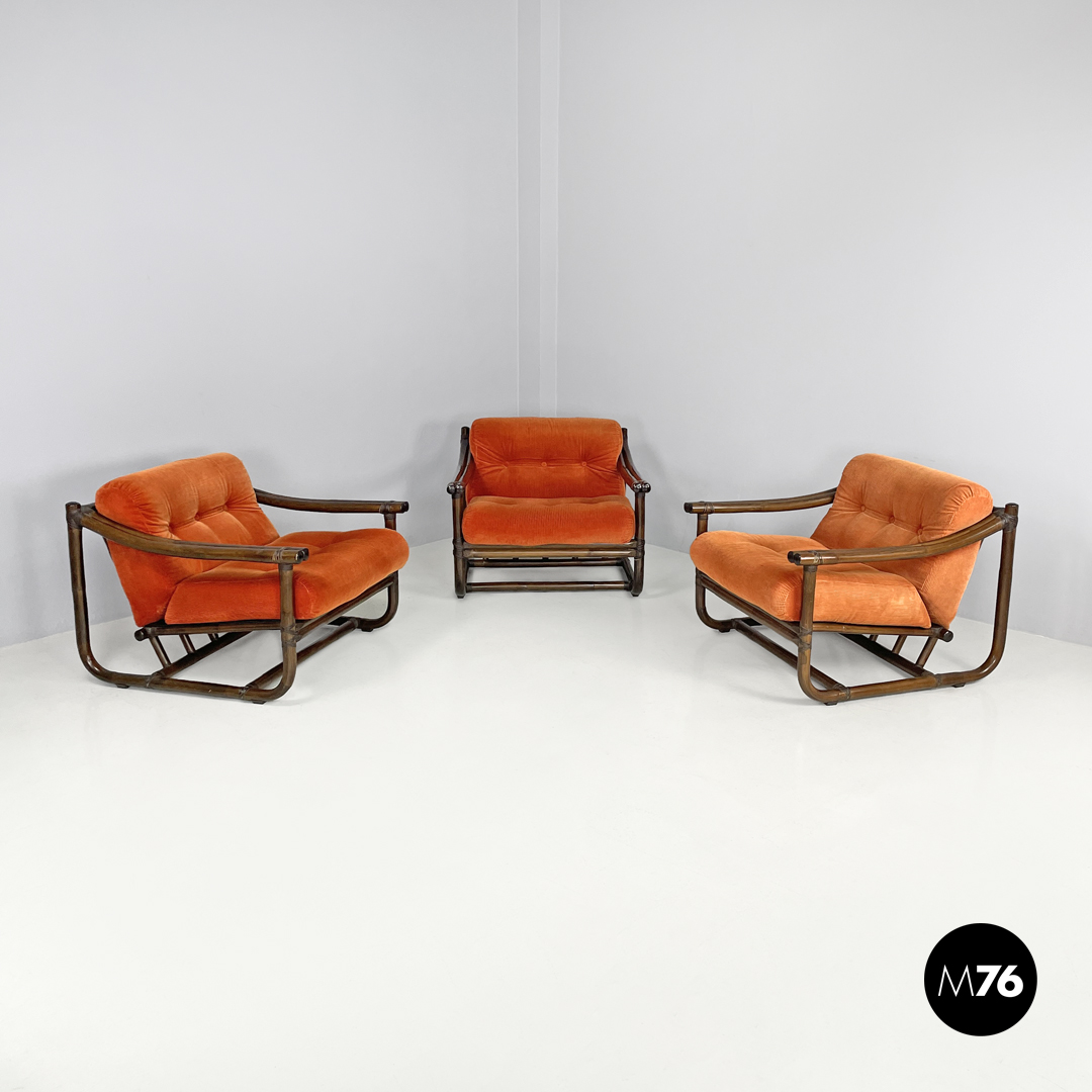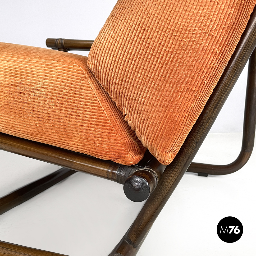Poltrona con struttura in bamboo. La seduta e lo schienale sono leggermente inclinati, con ai lati i due braccioli. Gli elementi della struttura sono collegati tra loro tramite lacci in pelle marrone intrecciata. Presenta due cuscini imbottiti che ricoprono la seduta e lo schienale rivestiti in velluto arancione a coste con bottoni. Con piedini in plastica nera.