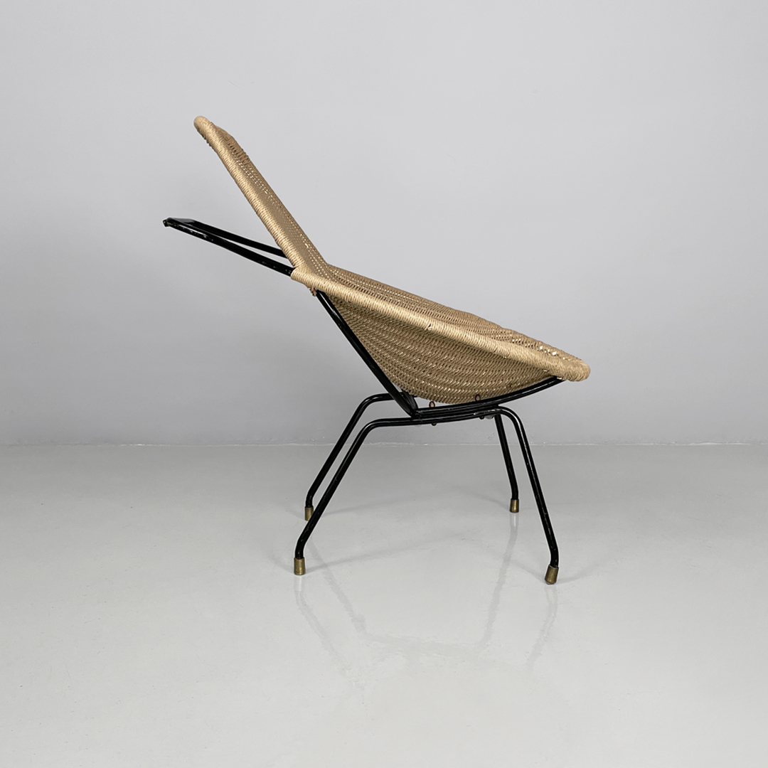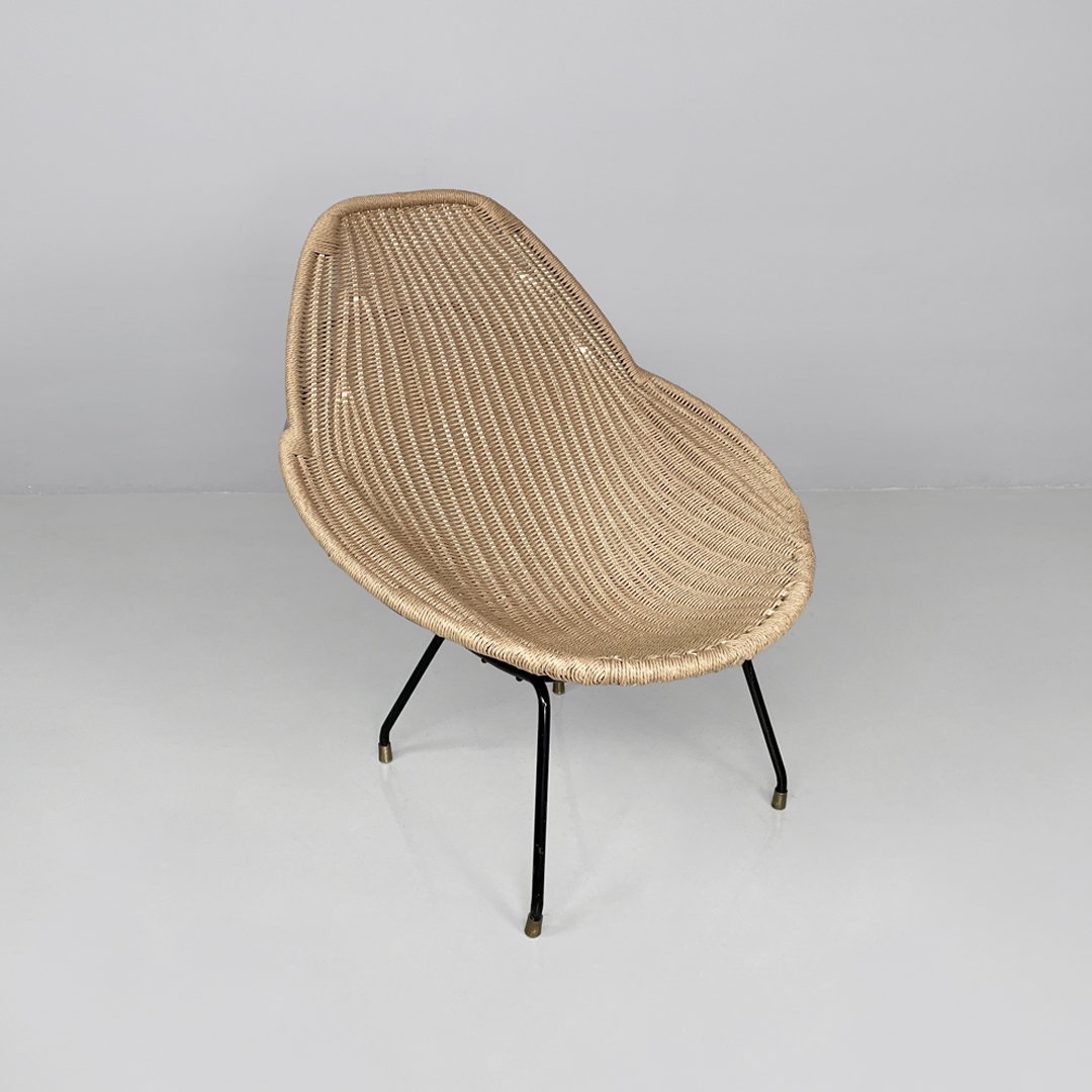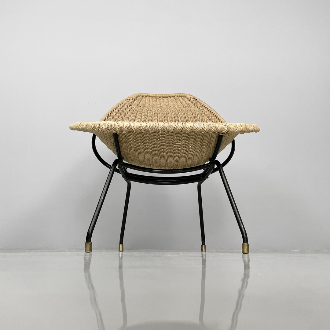 Poltrona modello Du 50 in metallo e paglia. La struttura è in tubo di acciaio laccato nero con piedini tondi in ottone. La seduta è rivestita in paglia intrecciata.