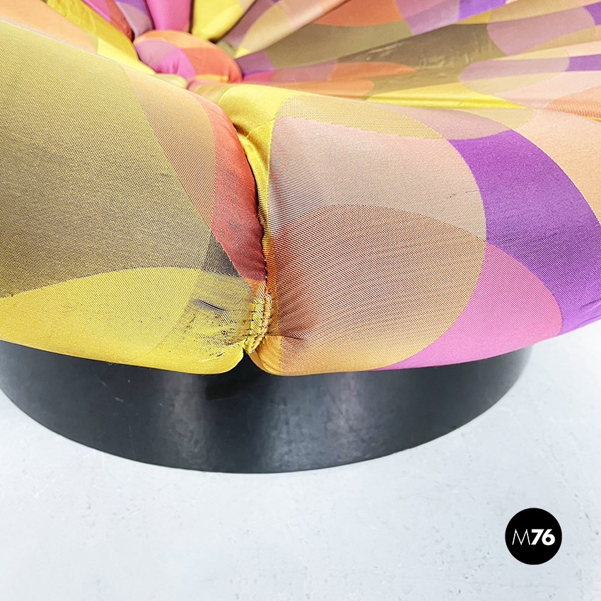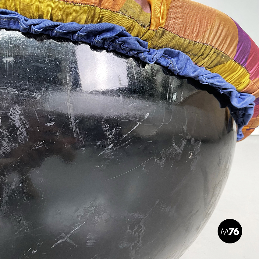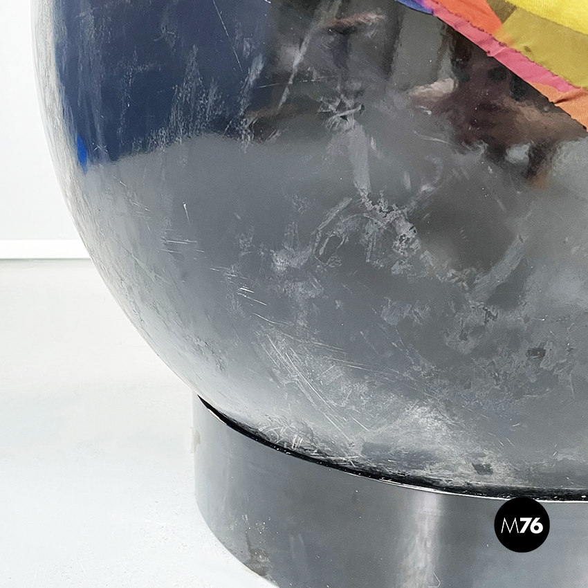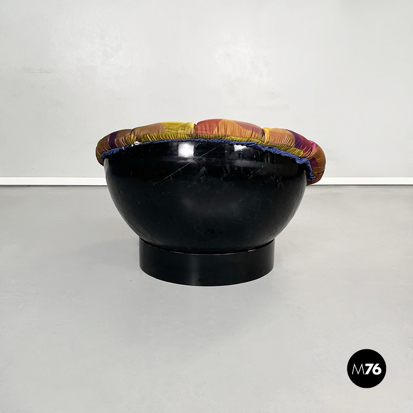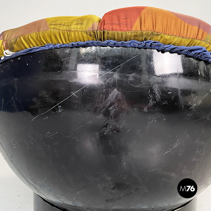 Poltrona model Girasole con seduta a forma di fiore imbottita e rivestita in tessuto variopinto. La struttura esterna è una semisferica in fibra di vetro laccata nera. La base su cui poggia la semisfera è un anello in fibra di vetro laccata nera.