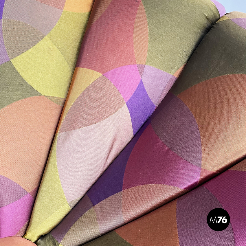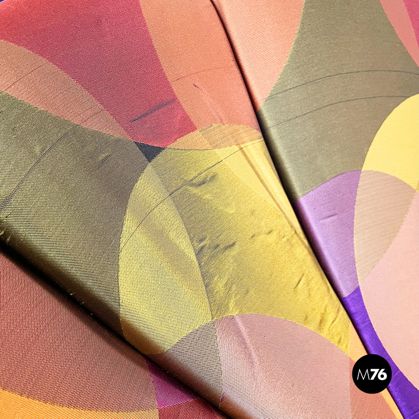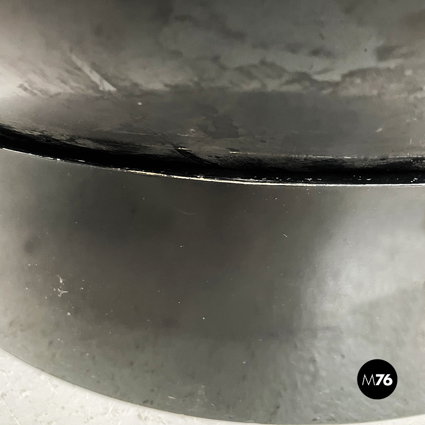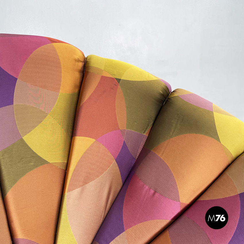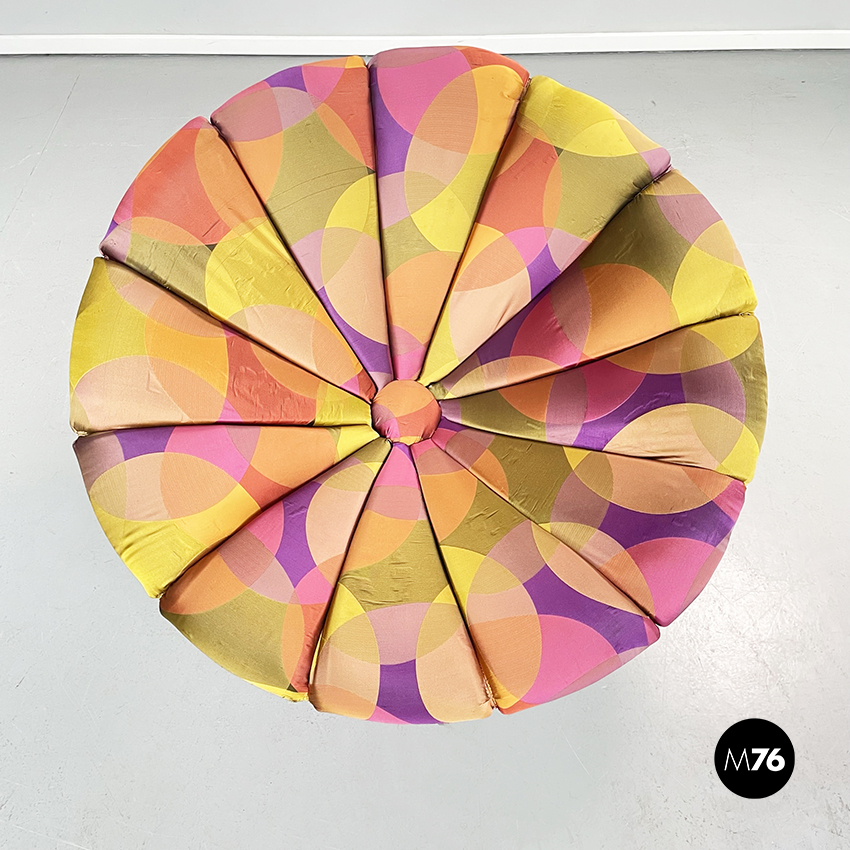 Poltrona model Girasole con seduta a forma di fiore imbottita e rivestita in tessuto variopinto. La struttura esterna è una semisferica in fibra di vetro laccata nera. La base su cui poggia la semisfera è un anello in fibra di vetro laccata nera.